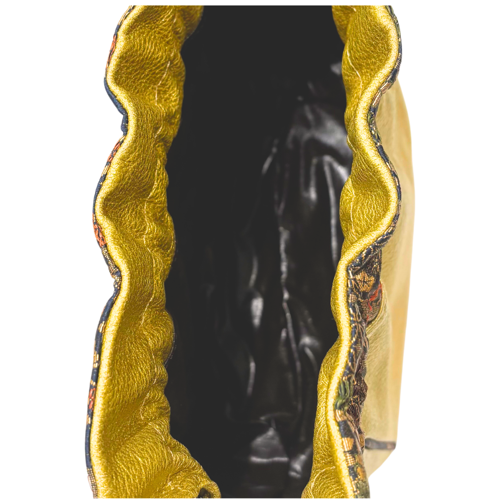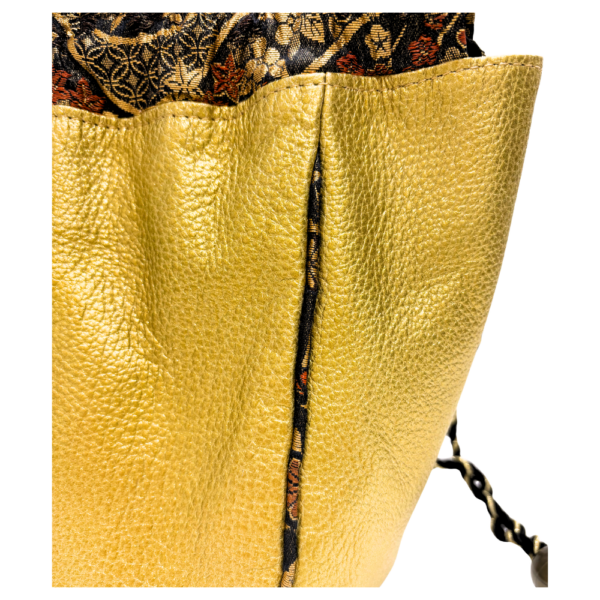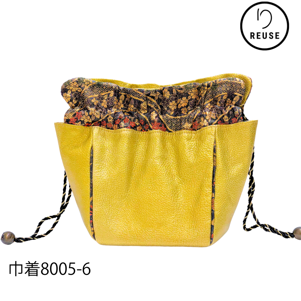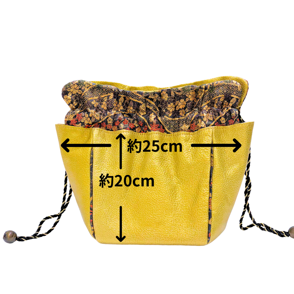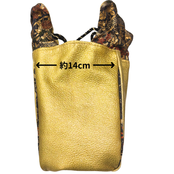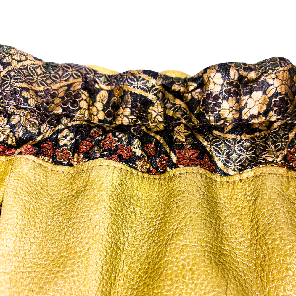 しっとりとした質感のレザーに、華やかな金彩が施された正絹(シルク)の織物を組み合わせた贅沢な巾着バッグです。