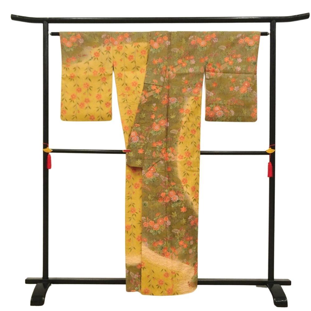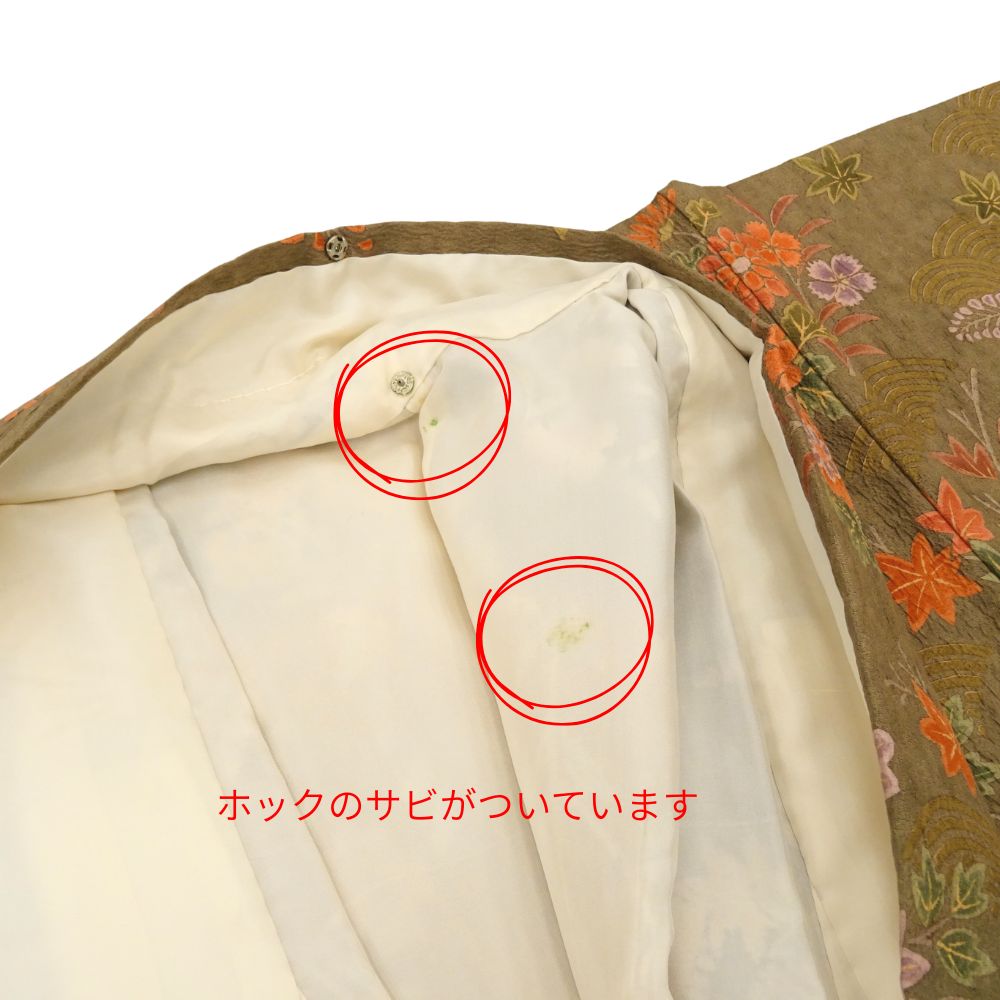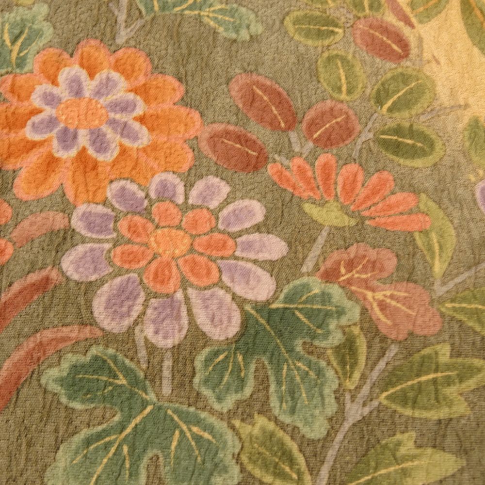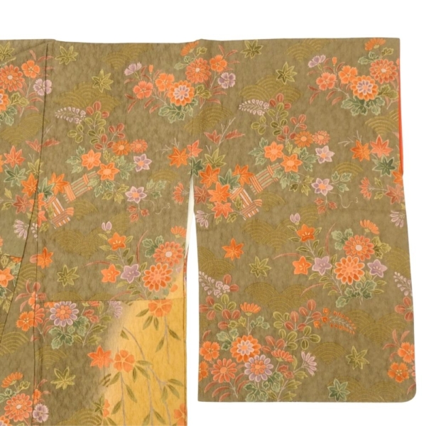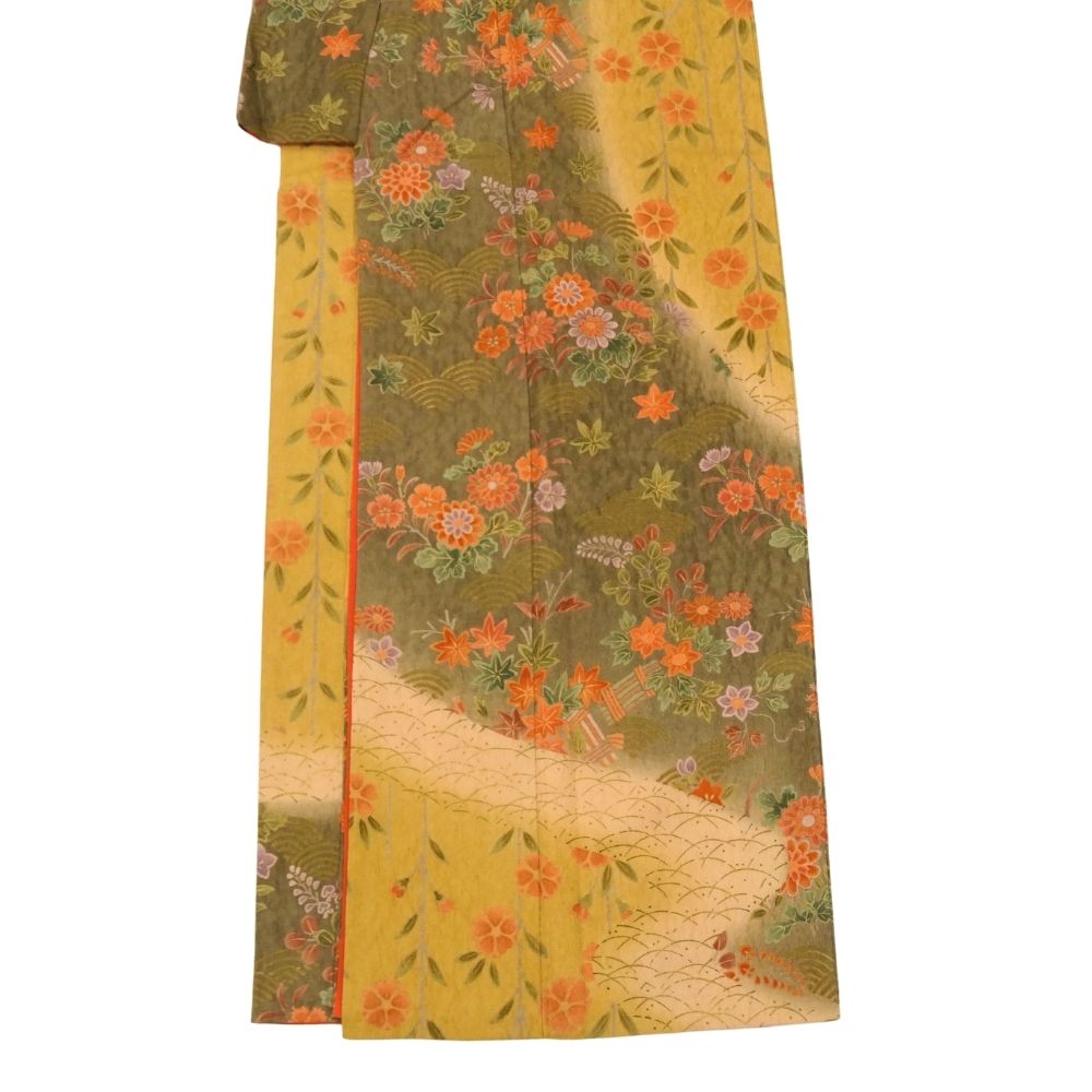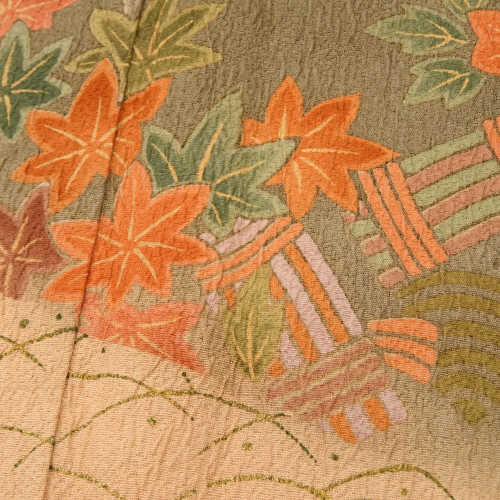 訪問着 正絹 リユース 中古 袷 黄土色×モスグリーン 菊 紅葉 流水紋 縮緬 8008-2 準礼装 フォーマル 結婚式 お宮参り 七五三 パーティー