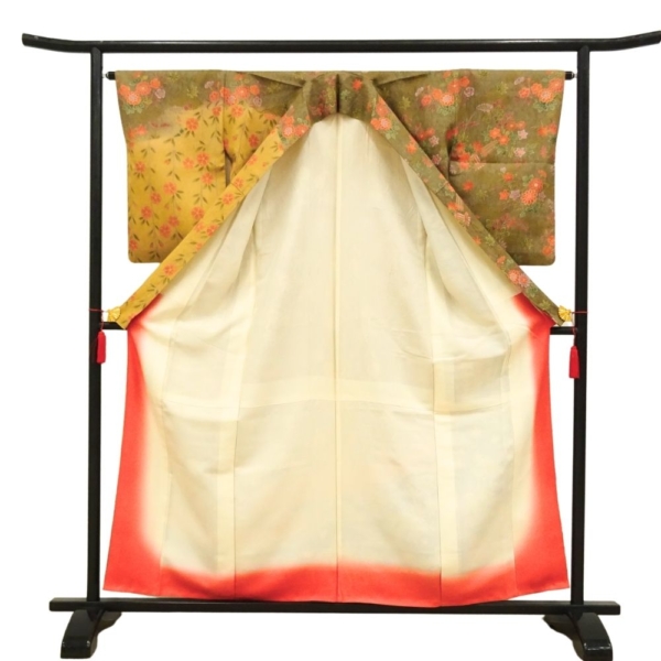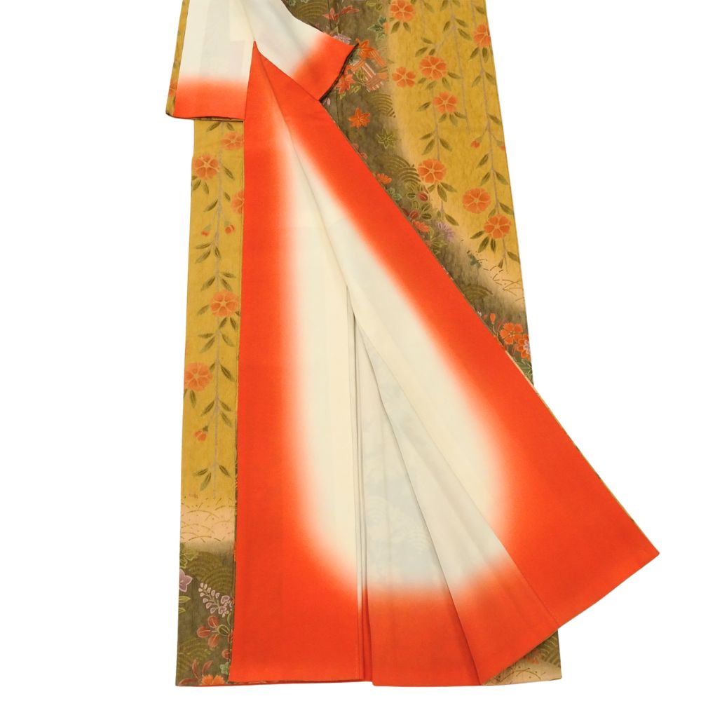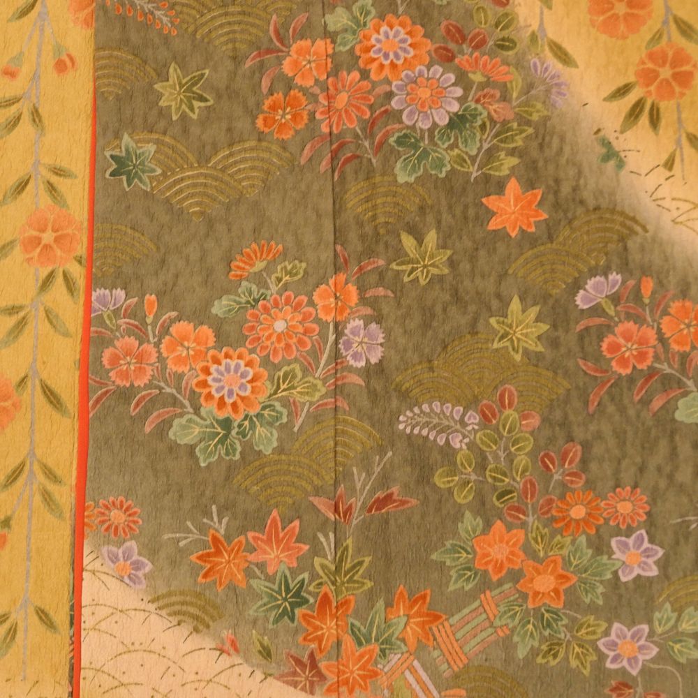 きれいな黄土色と、落ち着いたモスグリーンのコントラストが美しい訪問着です。