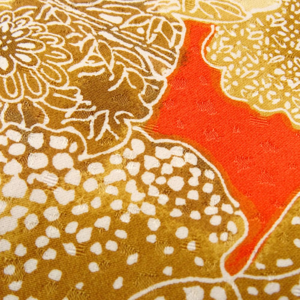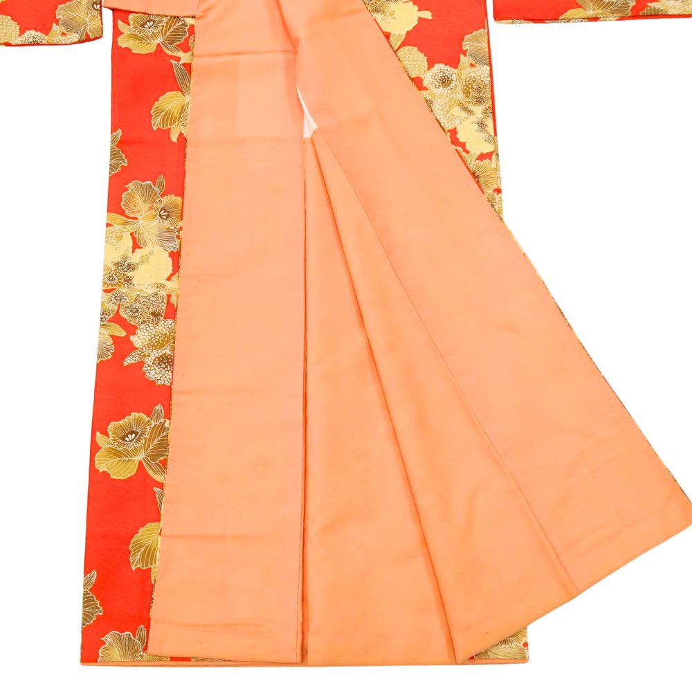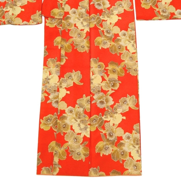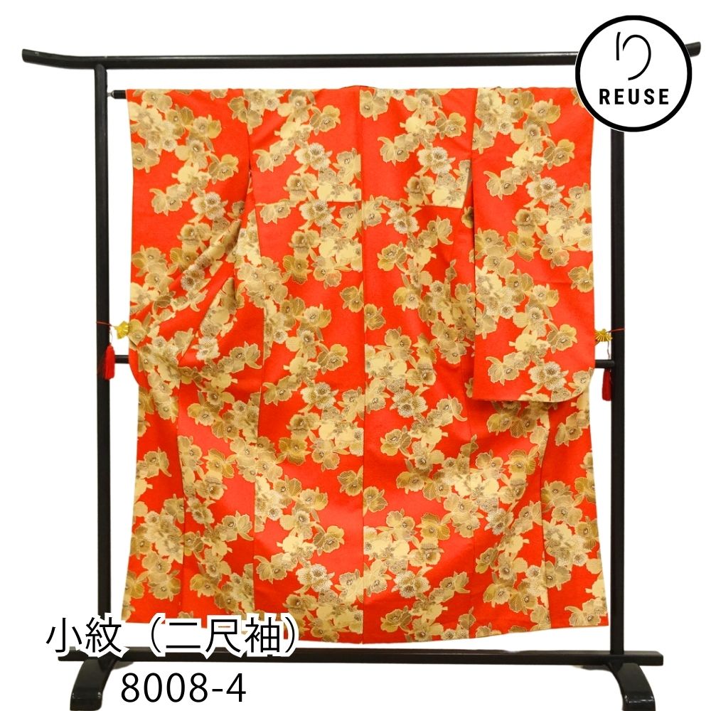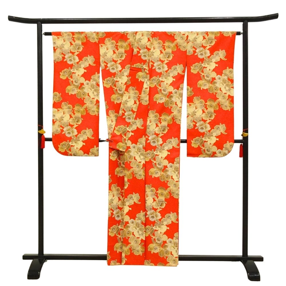 小紋(二尺袖) 正絹 リユース 中古 袷 朱赤×ゴールド カトレア 8008-4 蘭 レトロモダン 卒業式 謝恩会