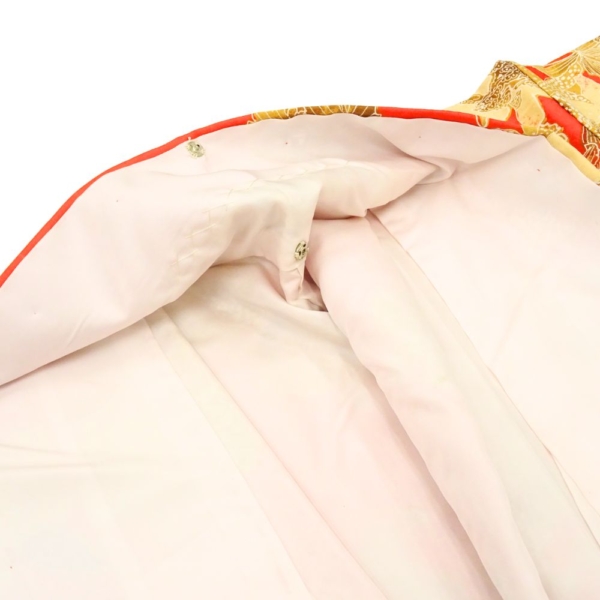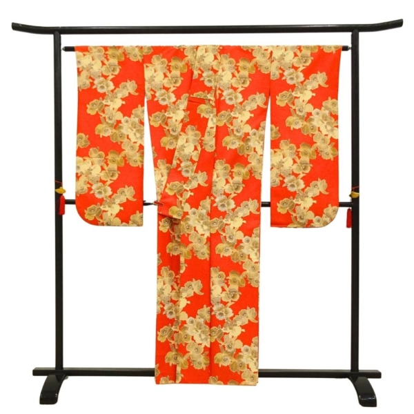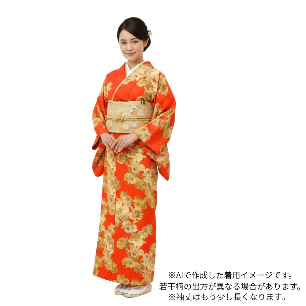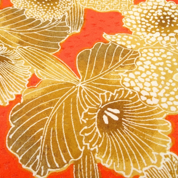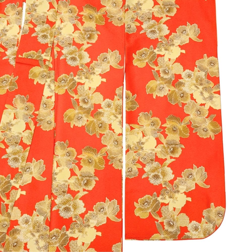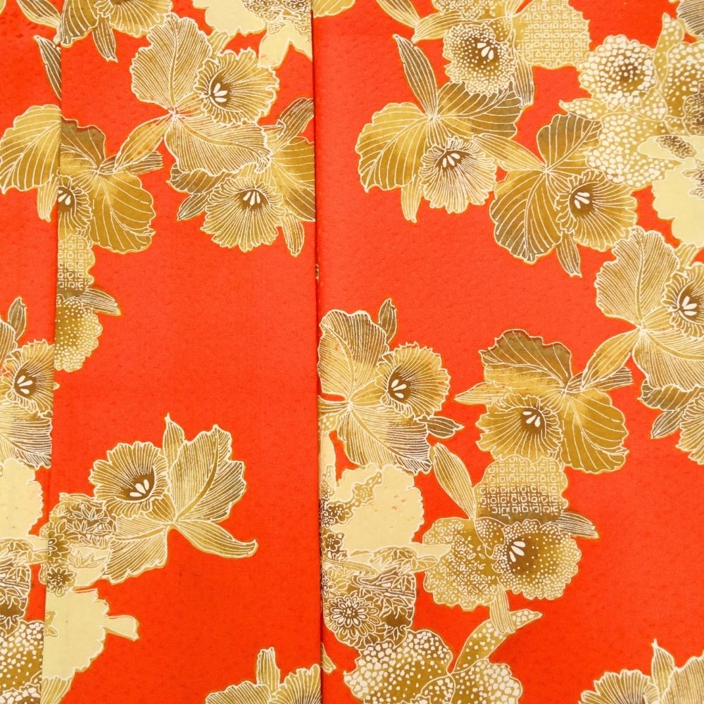 鮮烈な朱赤の地色に、ゴールドやベージュで描かれたカトレアが大胆に配置された二尺袖着物です。