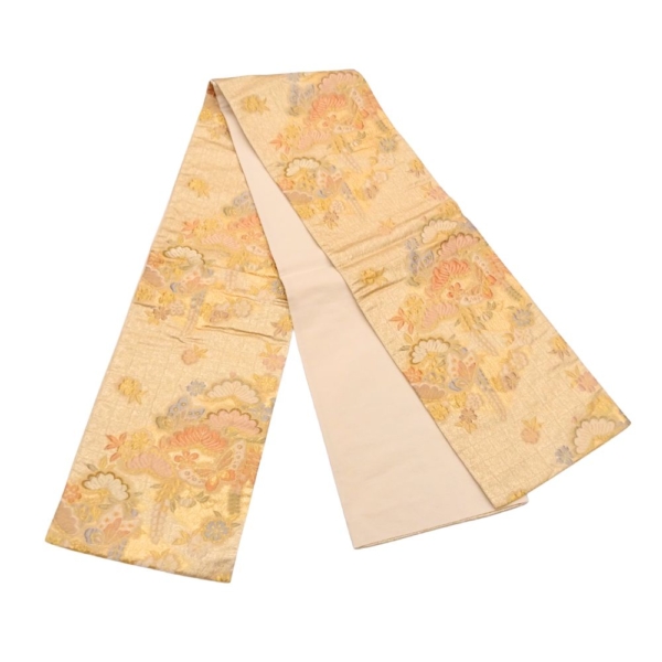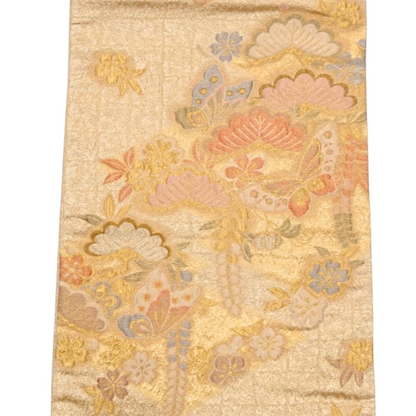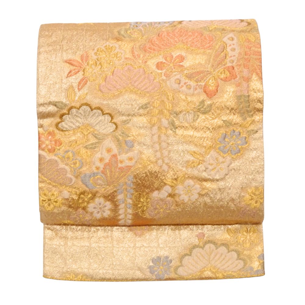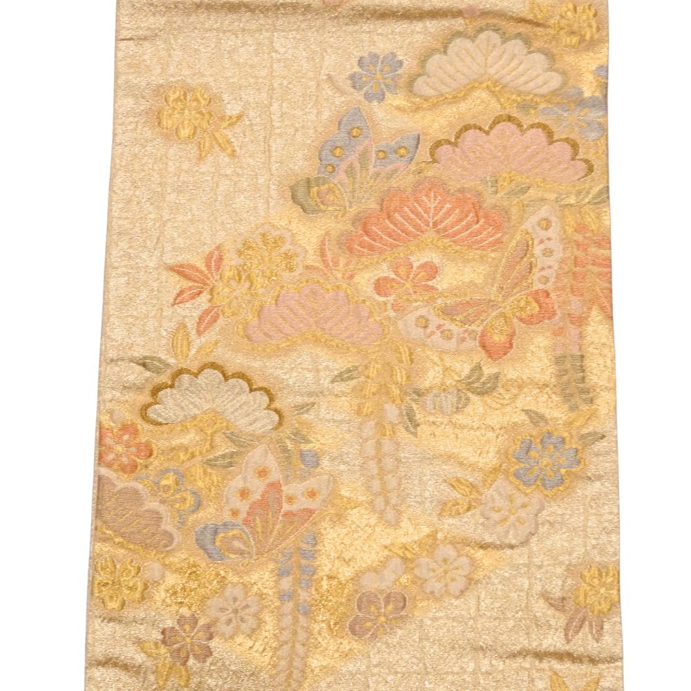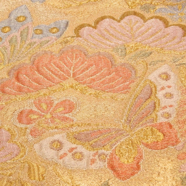 眩いばかりの金地に、松や梅、そして舞い遊ぶ蝶が繊細な織りで表現された、非常に格式高い袋帯です。