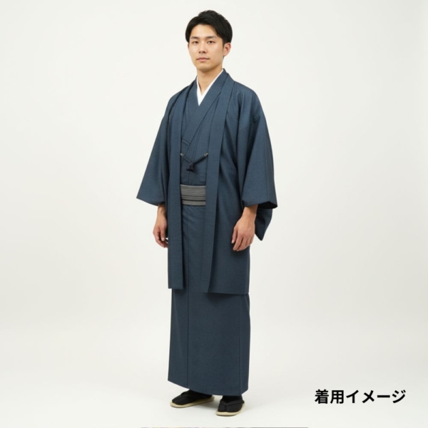 男物アンサンブル リユース 中古 紺地 亀甲 羽裏 連獅子 8009-13 着物・羽織セット お洒落着 観劇
