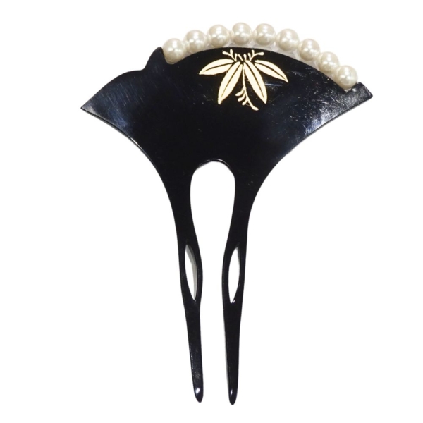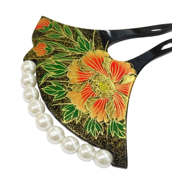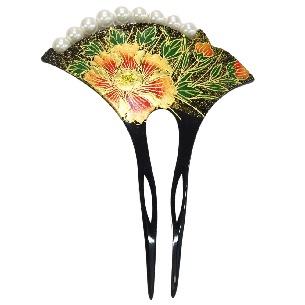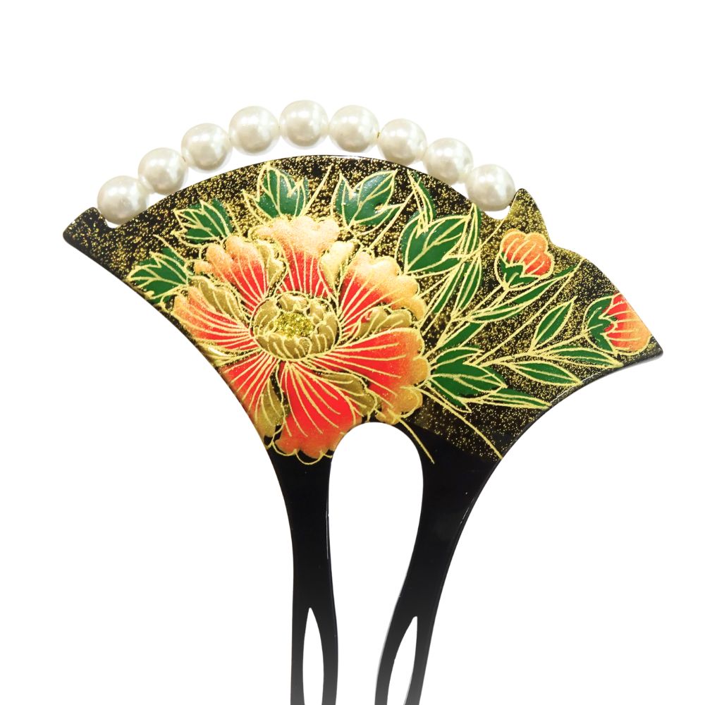 かんざし 未使用品 リユース バチ型 パール装飾 金彩 大輪牡丹 黒地 8010-11.12(8050-01011.2) 髪飾り 和装小物 着物 訪問着 留袖
