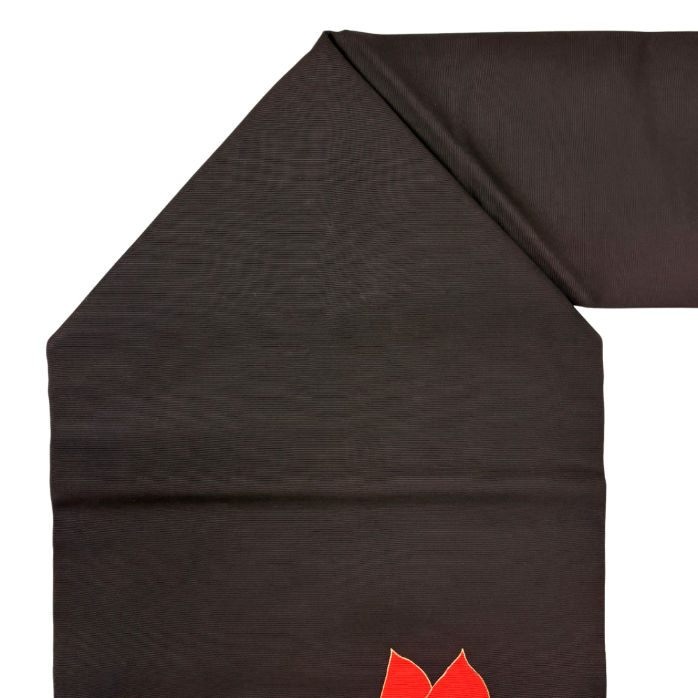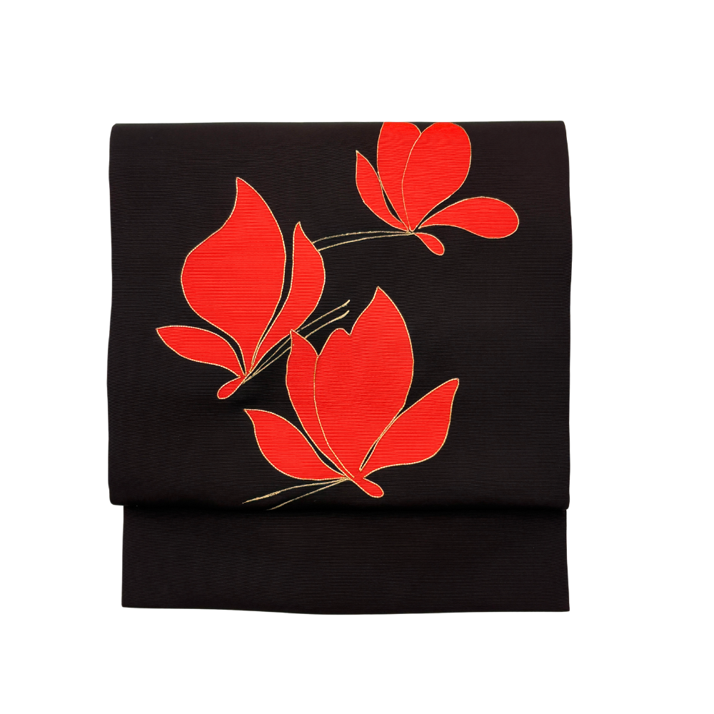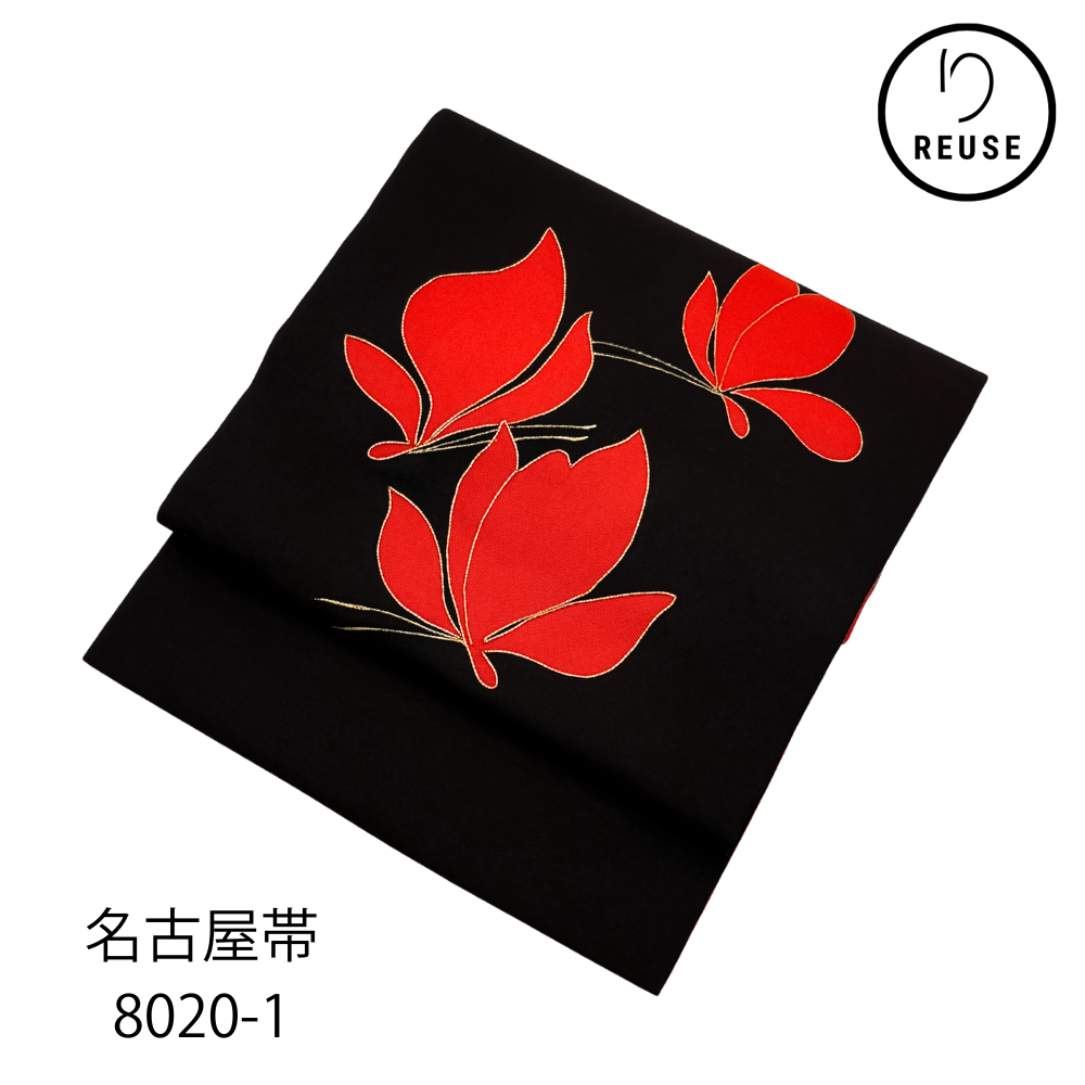黒地に鮮やかな赤が映える、モダンで洗練された名古屋帯です。