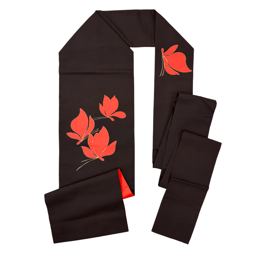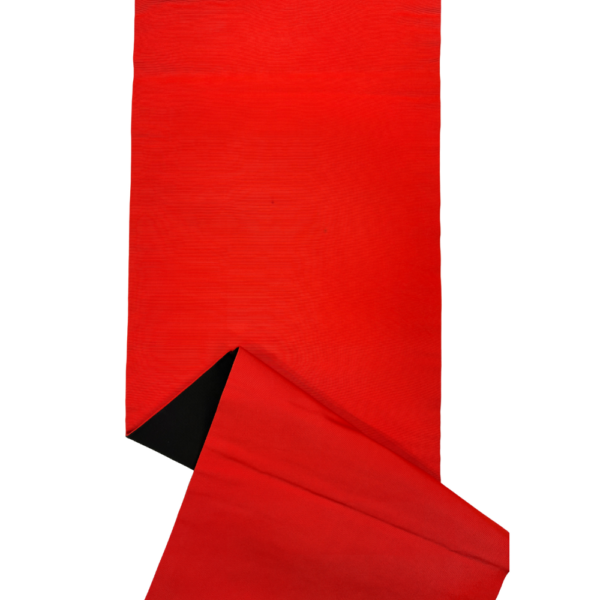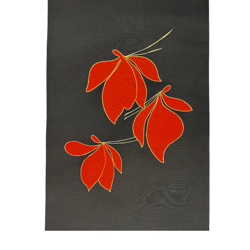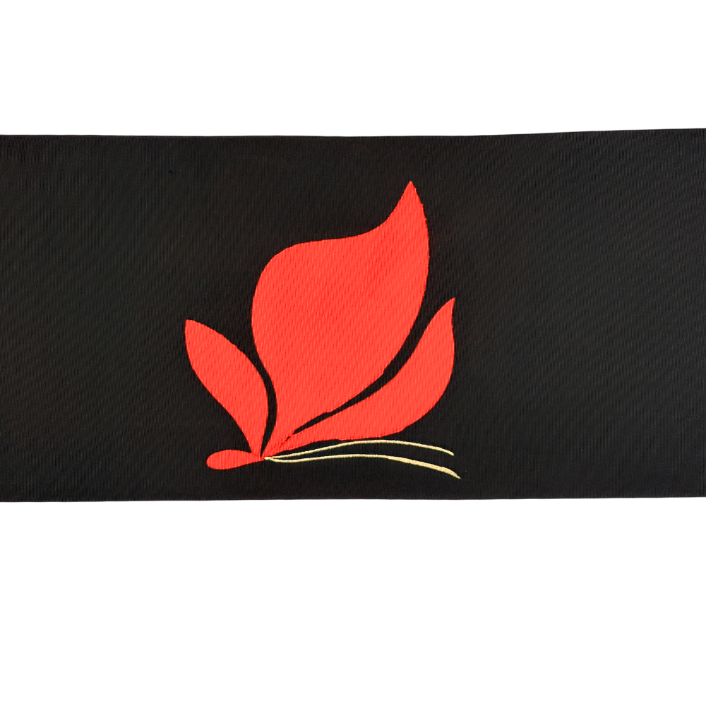 黒地に鮮やかな赤が映える、モダンで洗練された名古屋帯です。