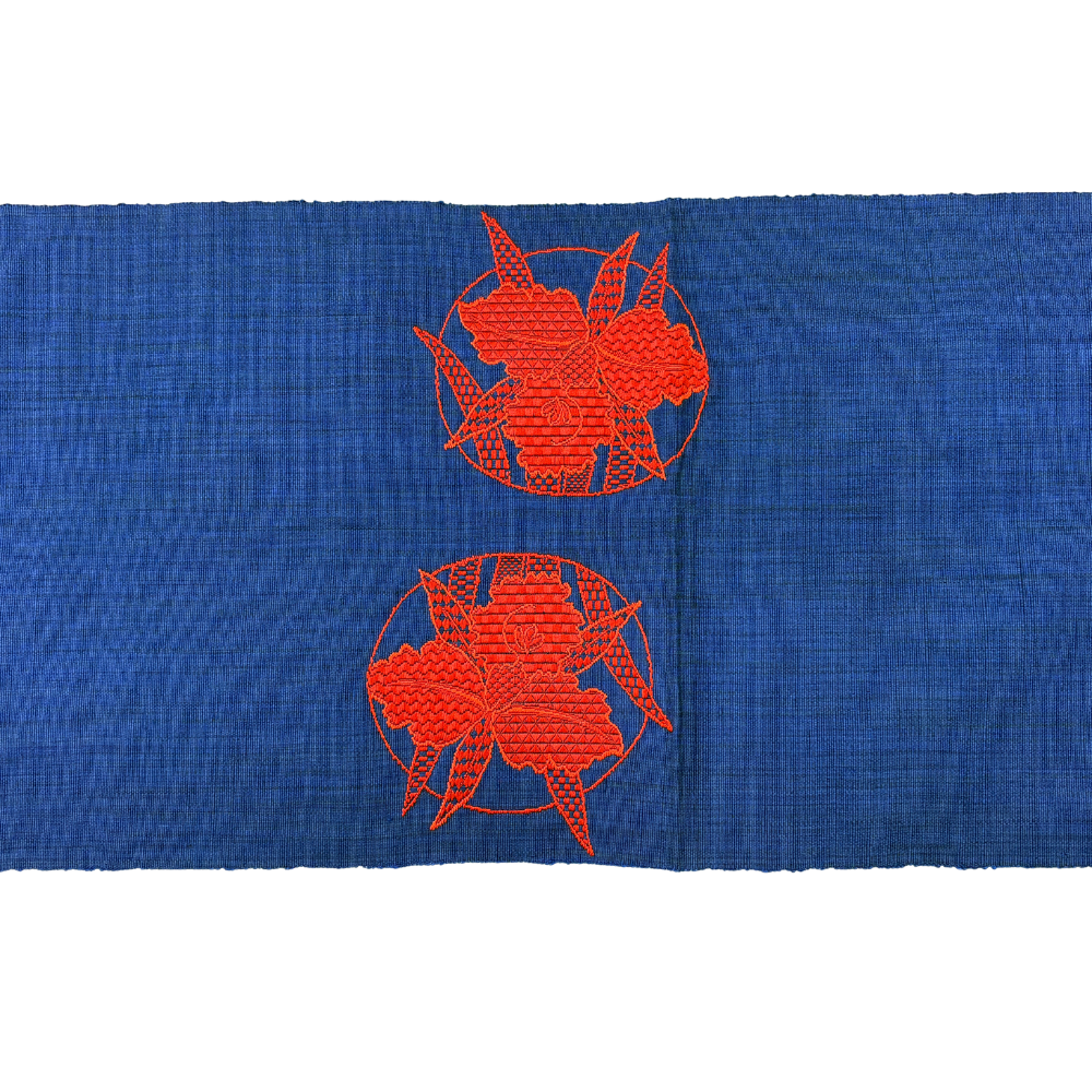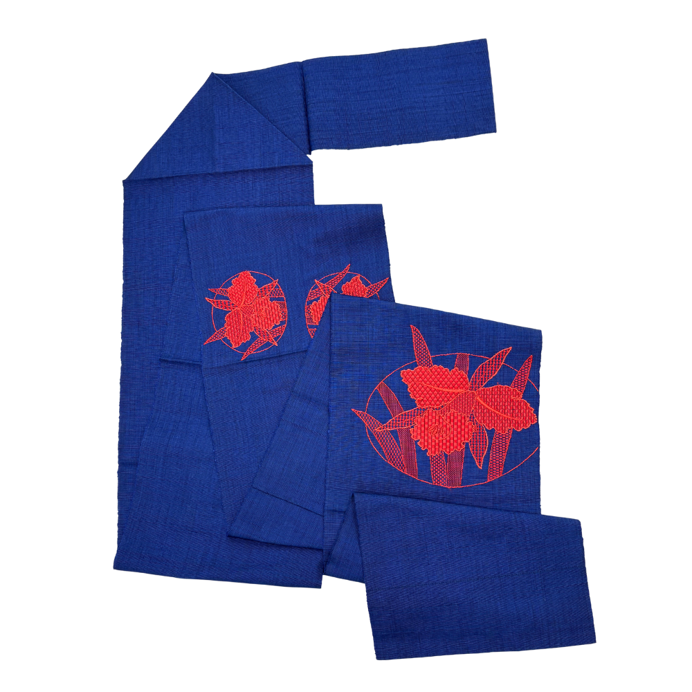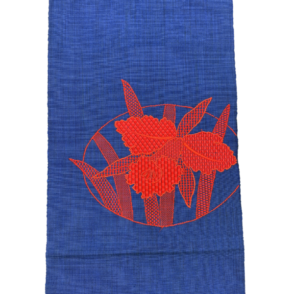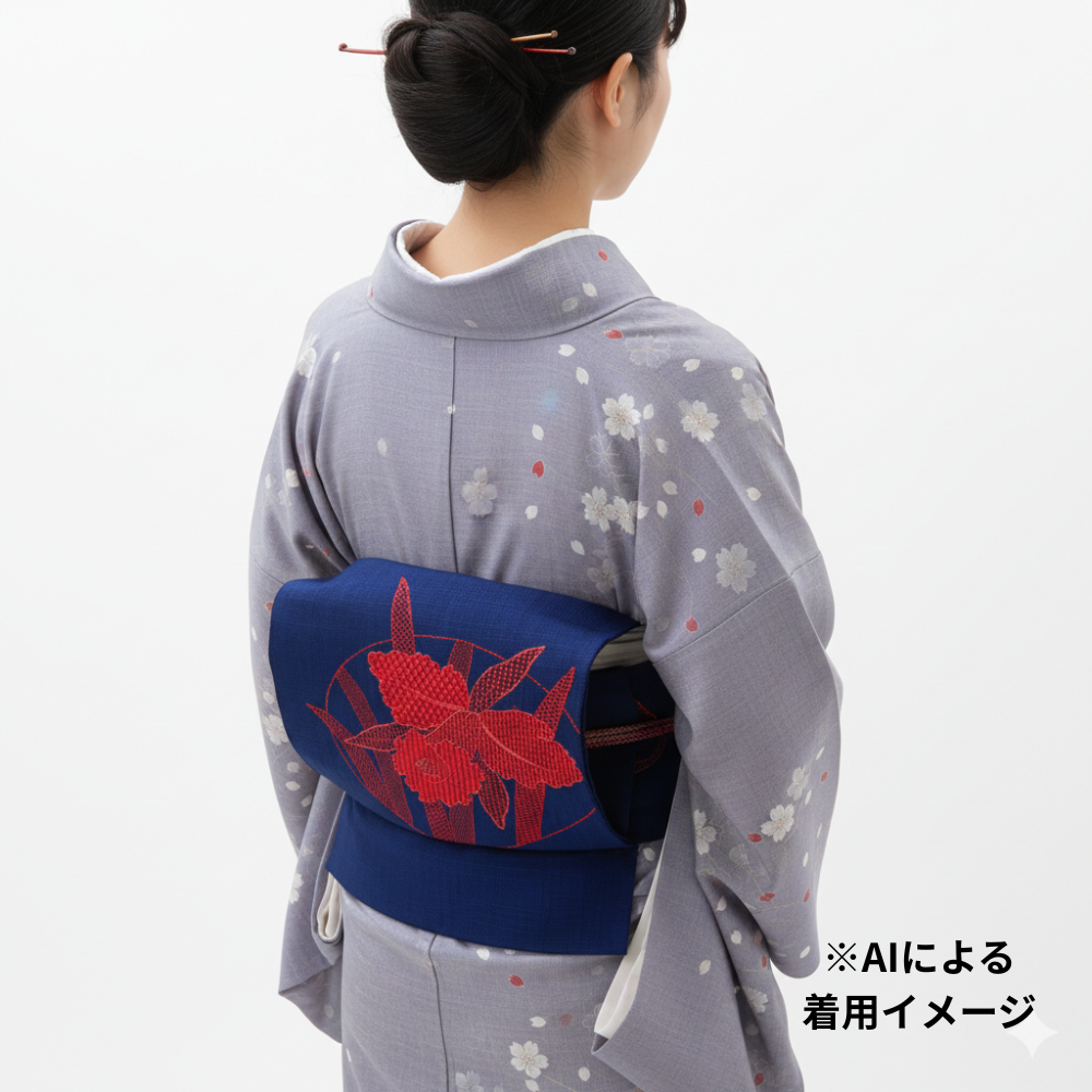 名古屋帯 正絹 リユース 八寸 縫い取り 濃紺×赤 大輪の花 モダン シック 8020-2
