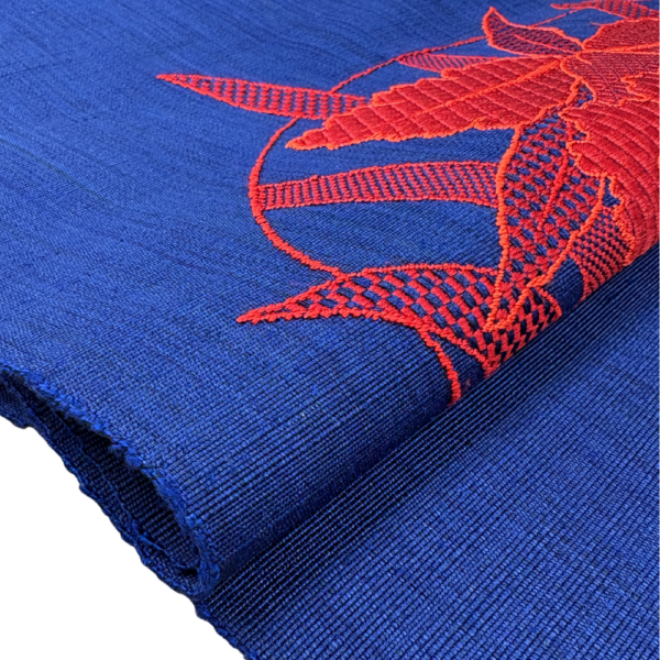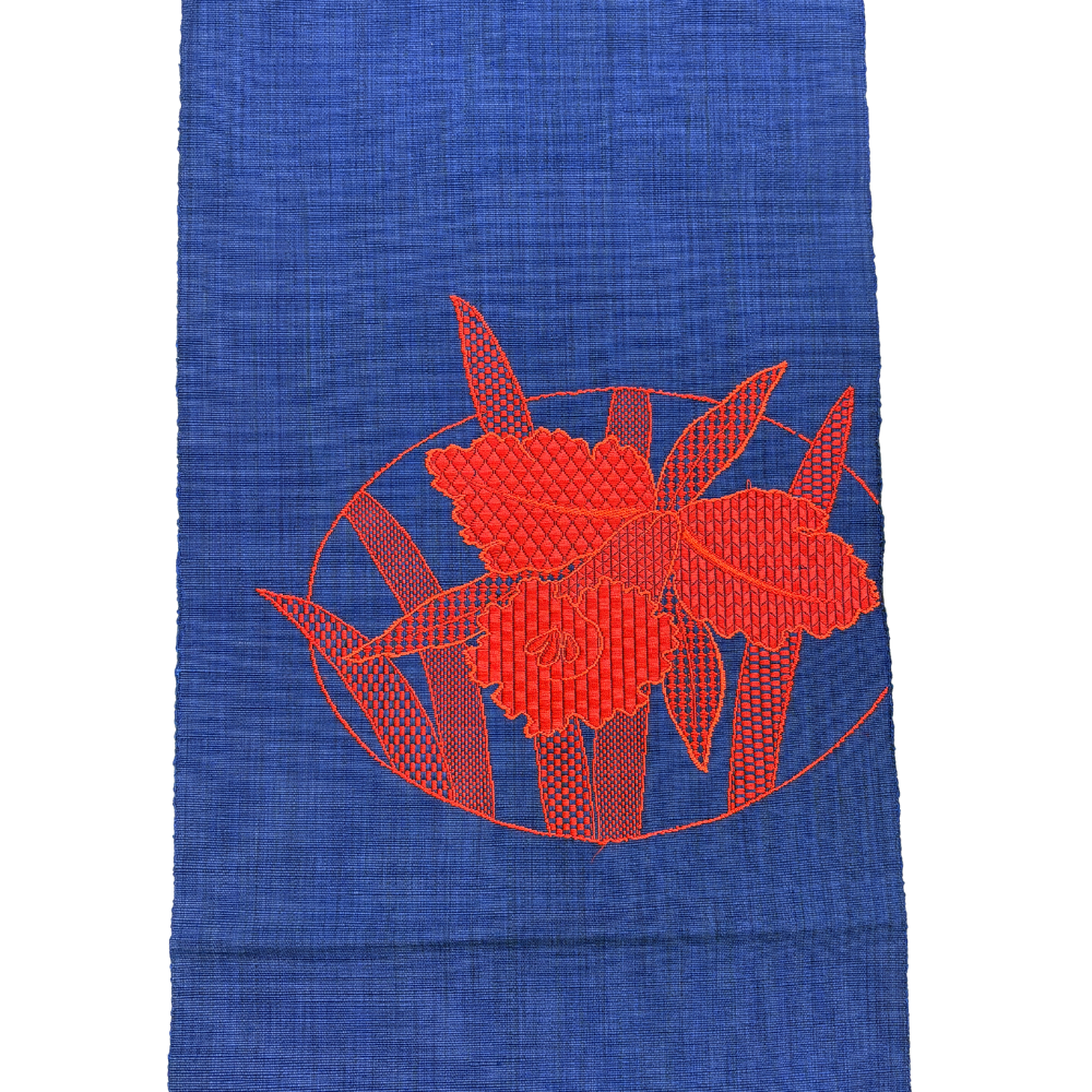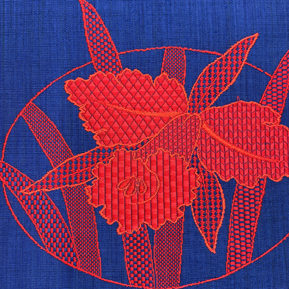 織りの技法の中でも手間のかかる「縫い取り」によって描かれた大輪の花々が、まるで刺繍のような立体感と美しい光沢を放ちます。