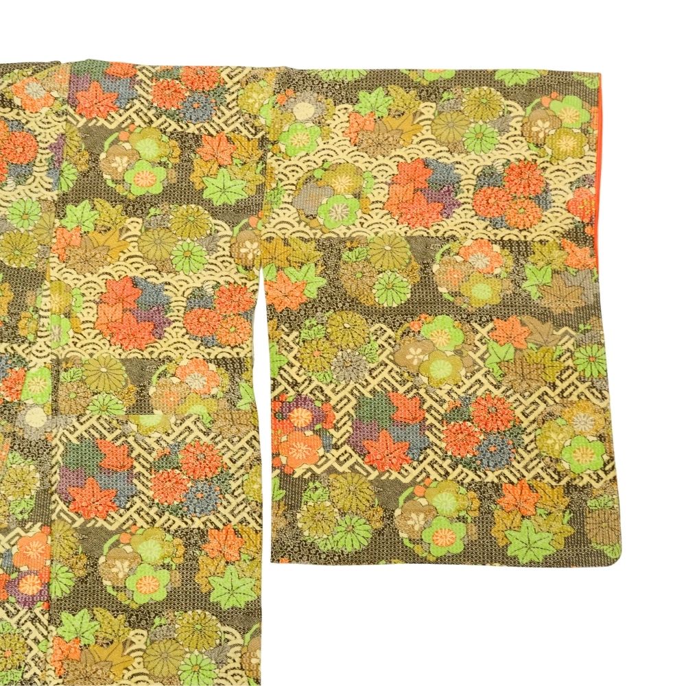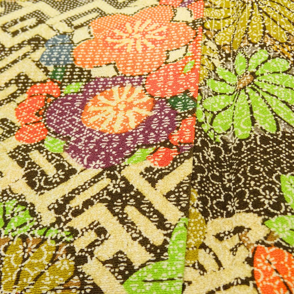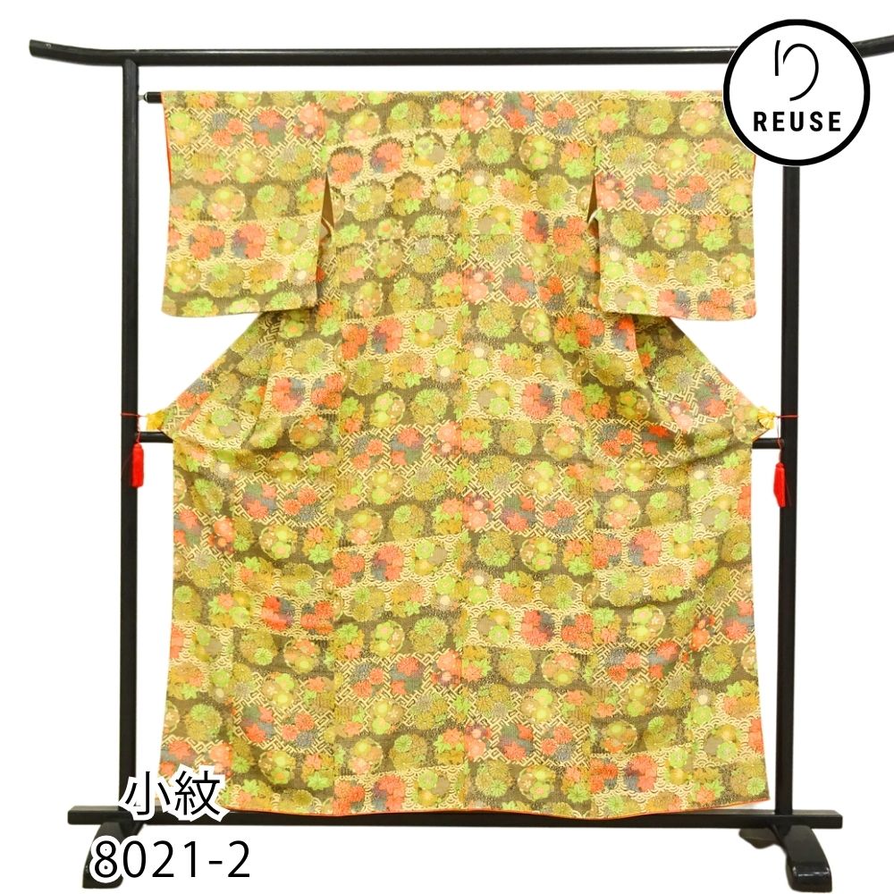 小紋 正絹 リユース 中古 袷 こげ茶×マスタードイエロー 唐花 七宝文様 8021-2 お洒落着 街着 レトロポップ