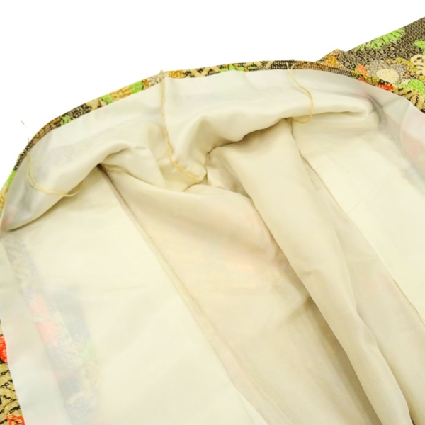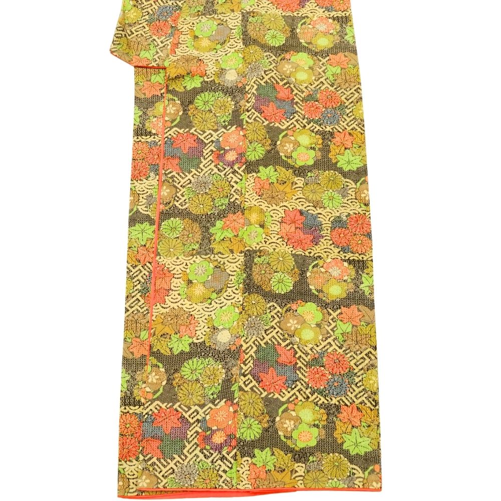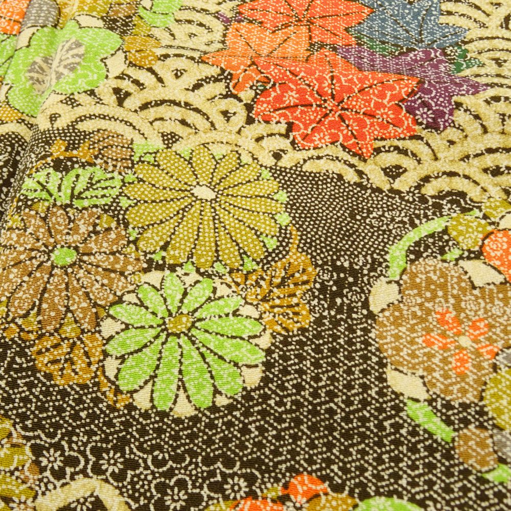こっくりとした深みのあるマスタードイエローに、鮮やかな色彩で描かれた唐」や七宝などの吉祥文様が映える小紋です。