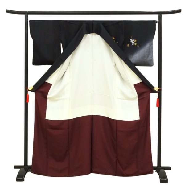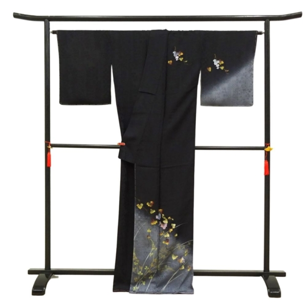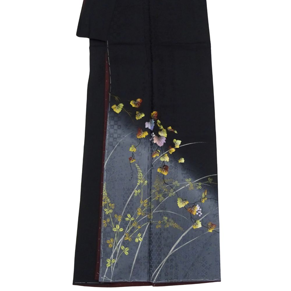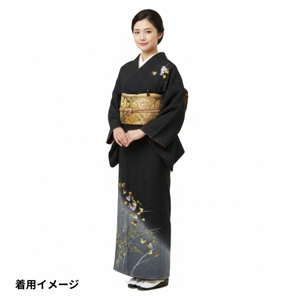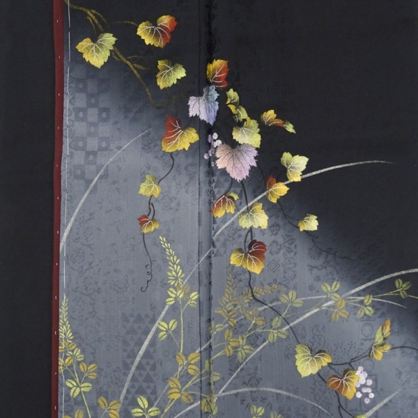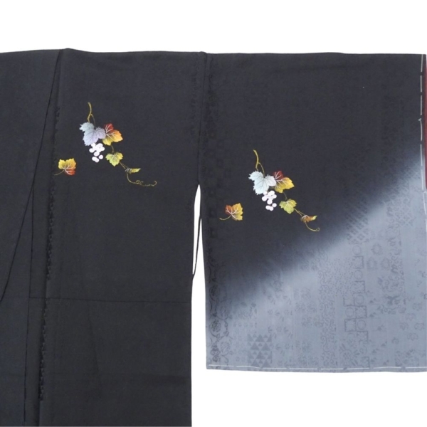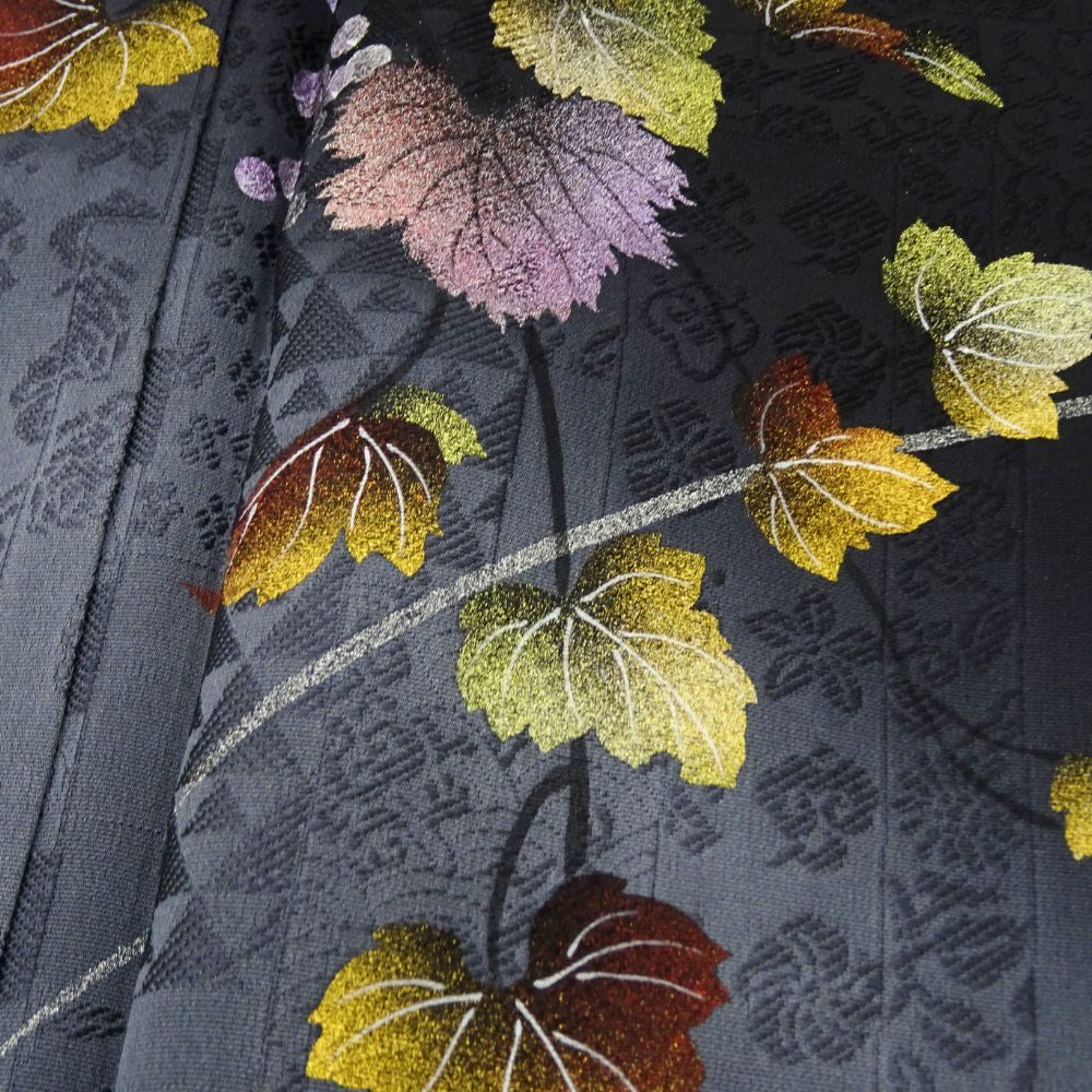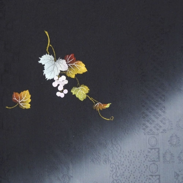 凛とした黒地に、繊細な銀彩と葡萄の蔦文様が描かれた、気品あふれる附下訪問着です。