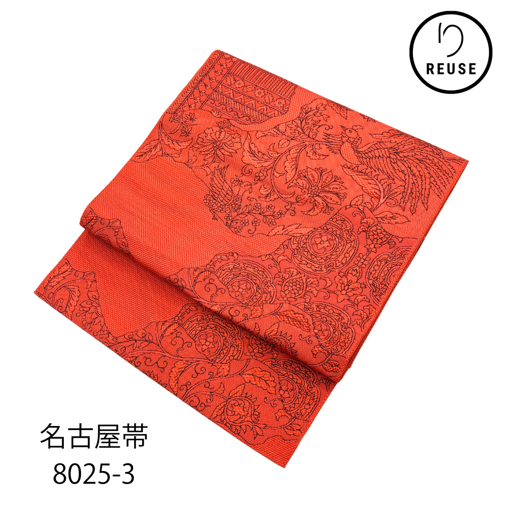 名古屋帯 正絹 未使用 リユース 六通柄 茜色 更紗文様 花喰鳥 鳳凰 華文 織り出し お洒落帯 8025-3