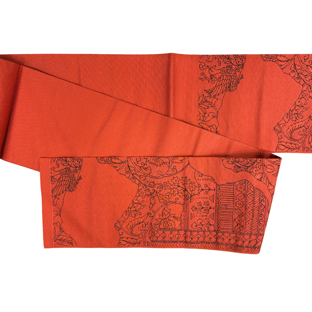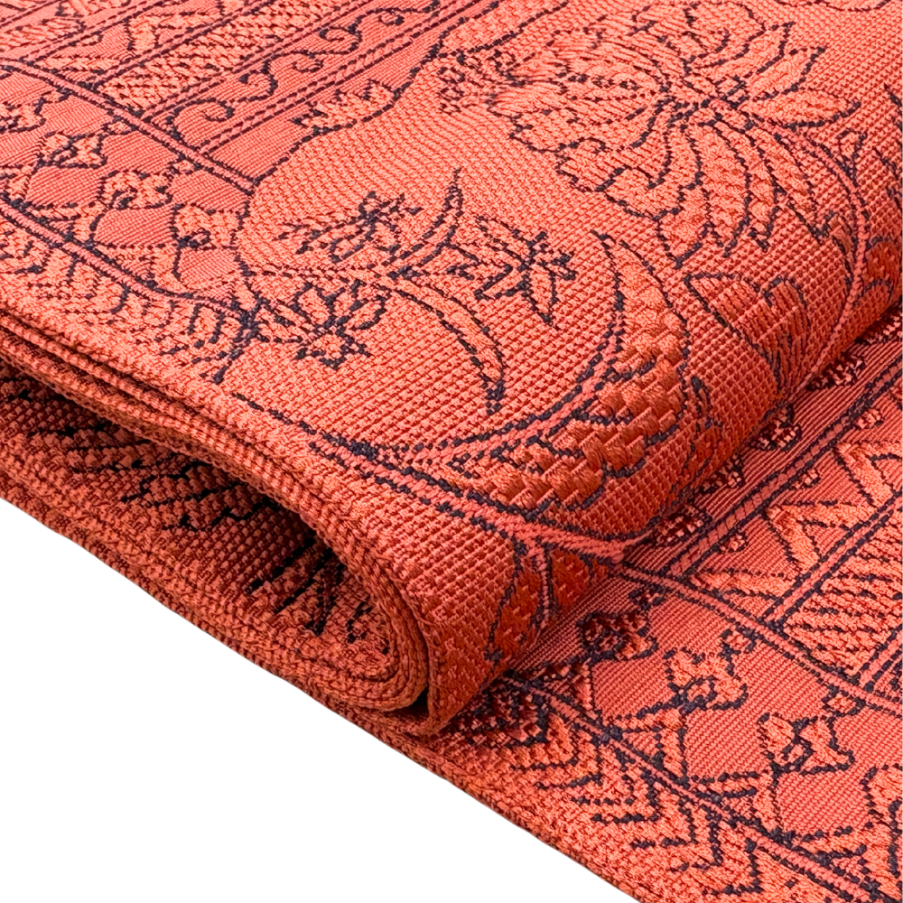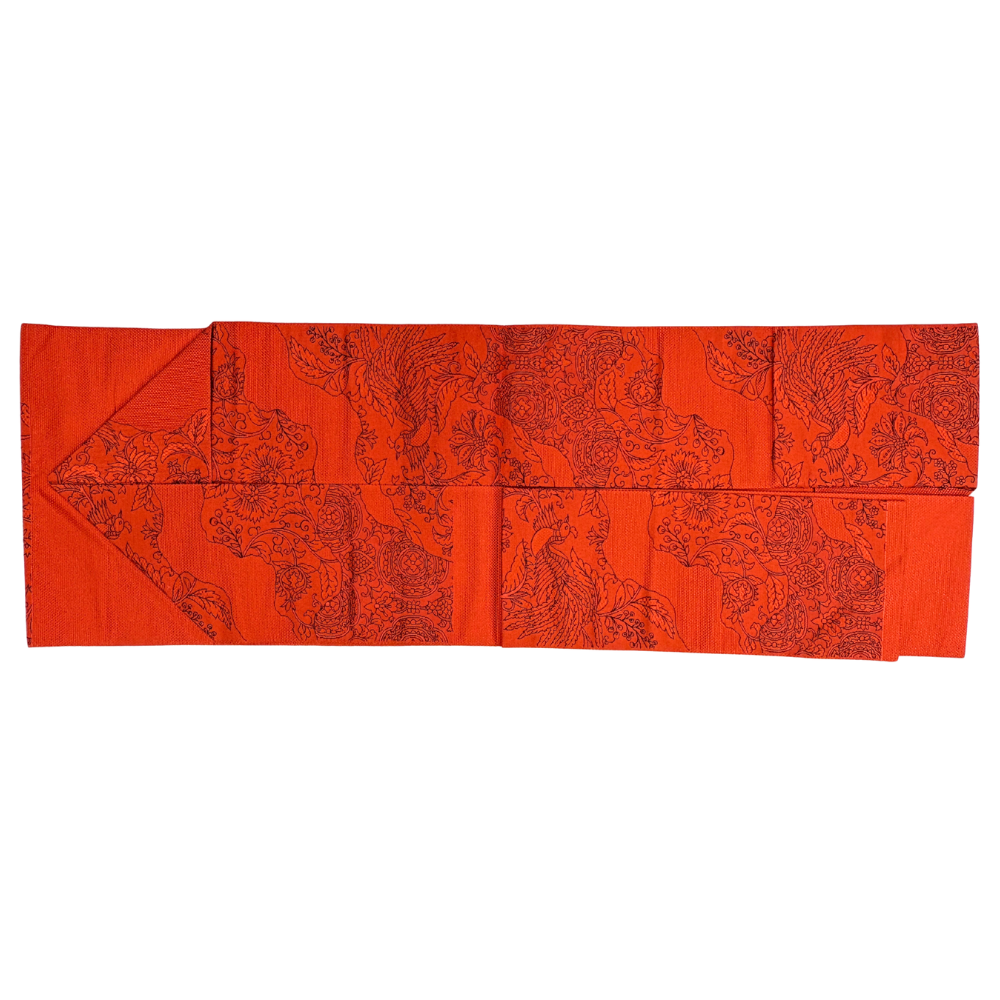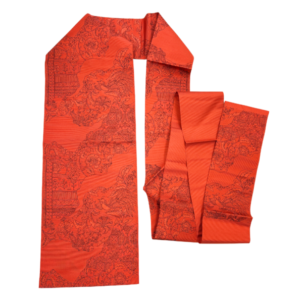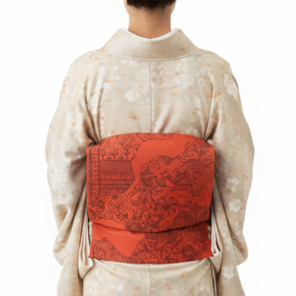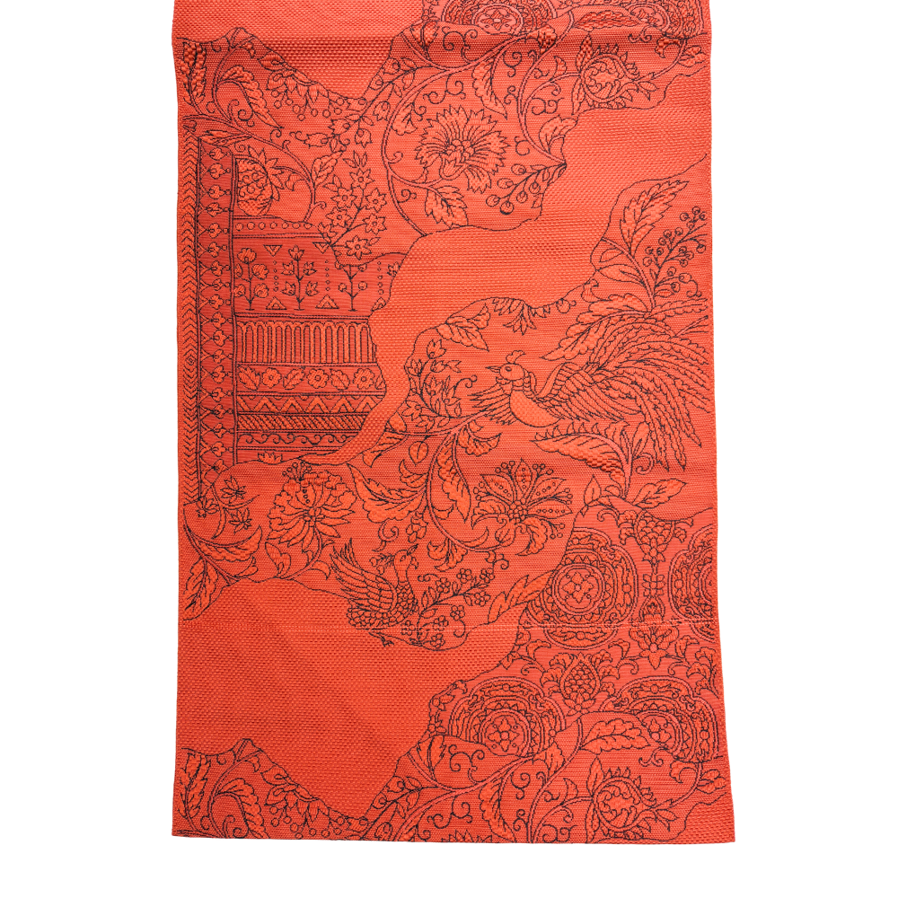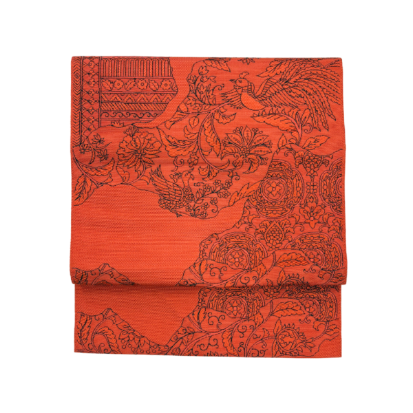 鮮やかな茜色の地に、繊細な更紗文様が美しく浮かび上がる名古屋帯です。