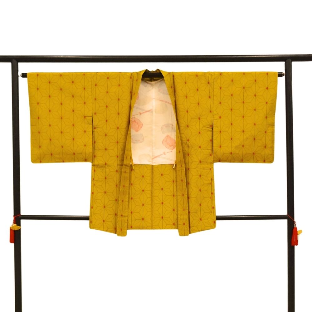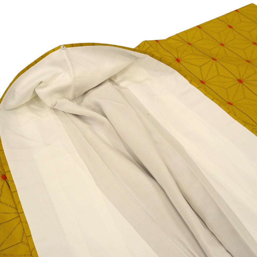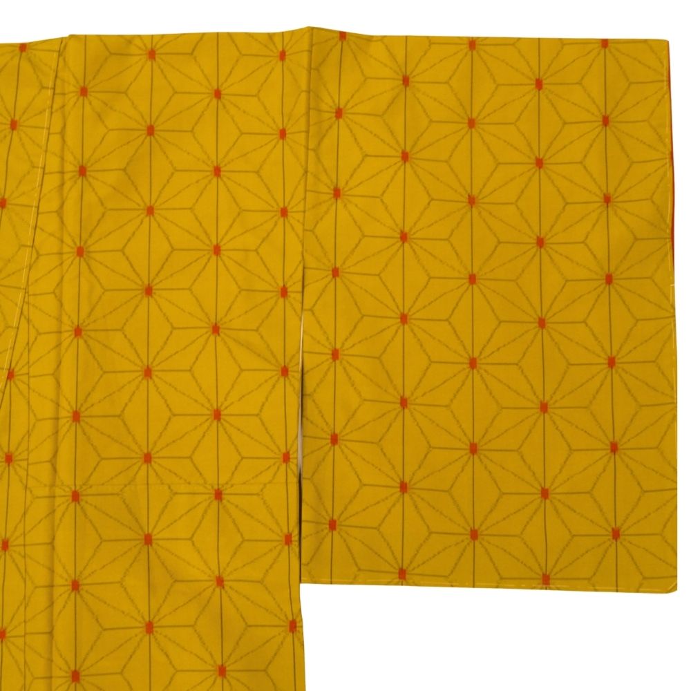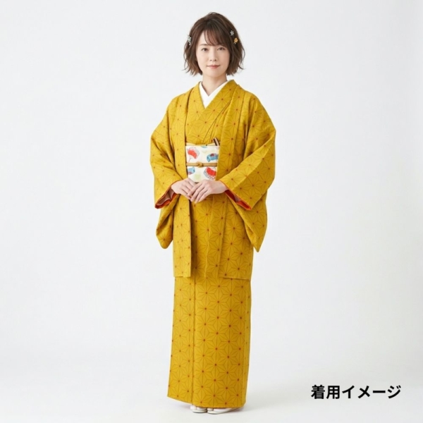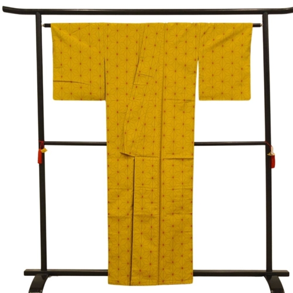 深みのある芥子色に、細やかな麻の葉模様が施された、粋でモダンな一着。