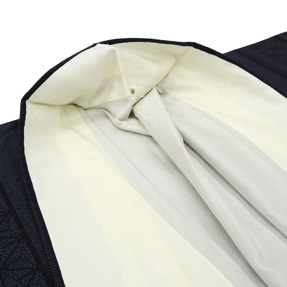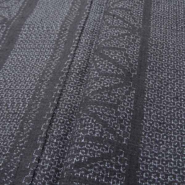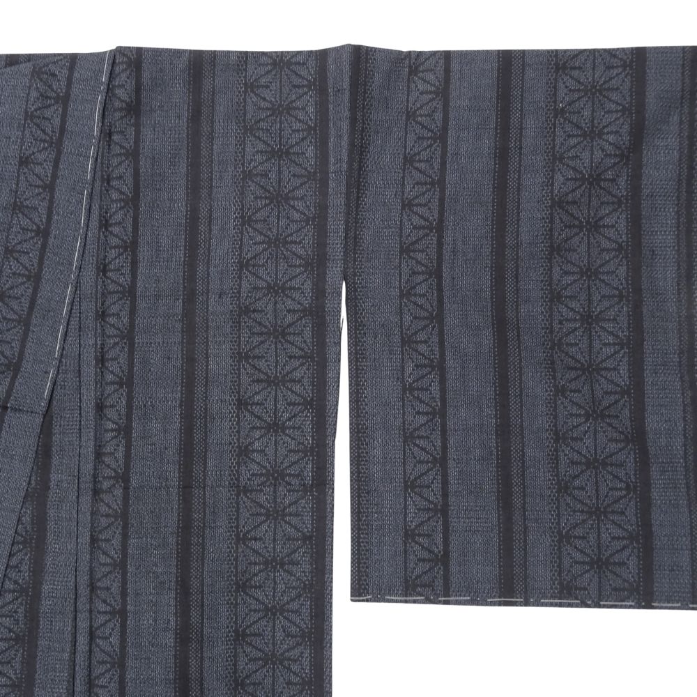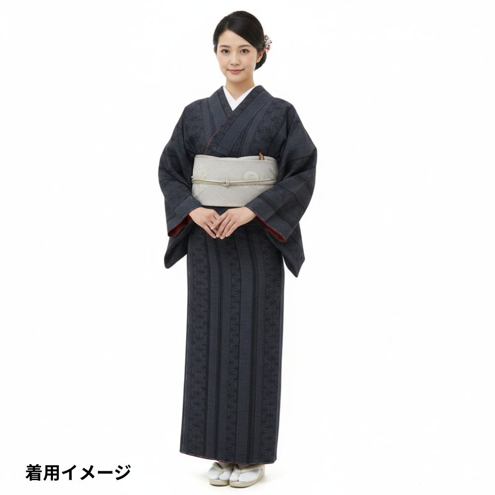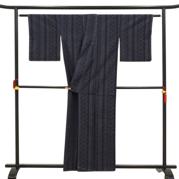 深みのある上品な濃紺色、スッキリとした縦縞の中に、伝統的な麻の葉文様が緻密に織り込まれています。