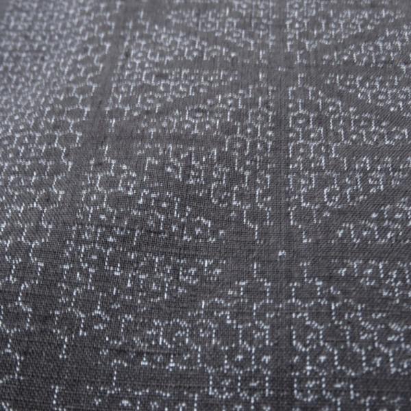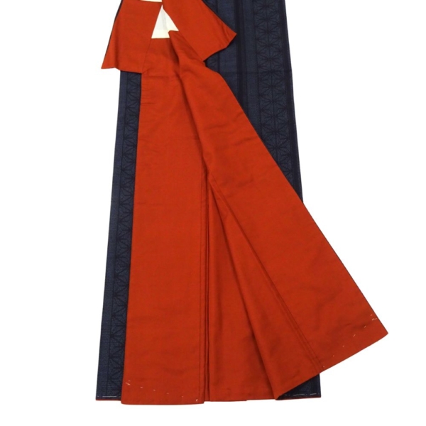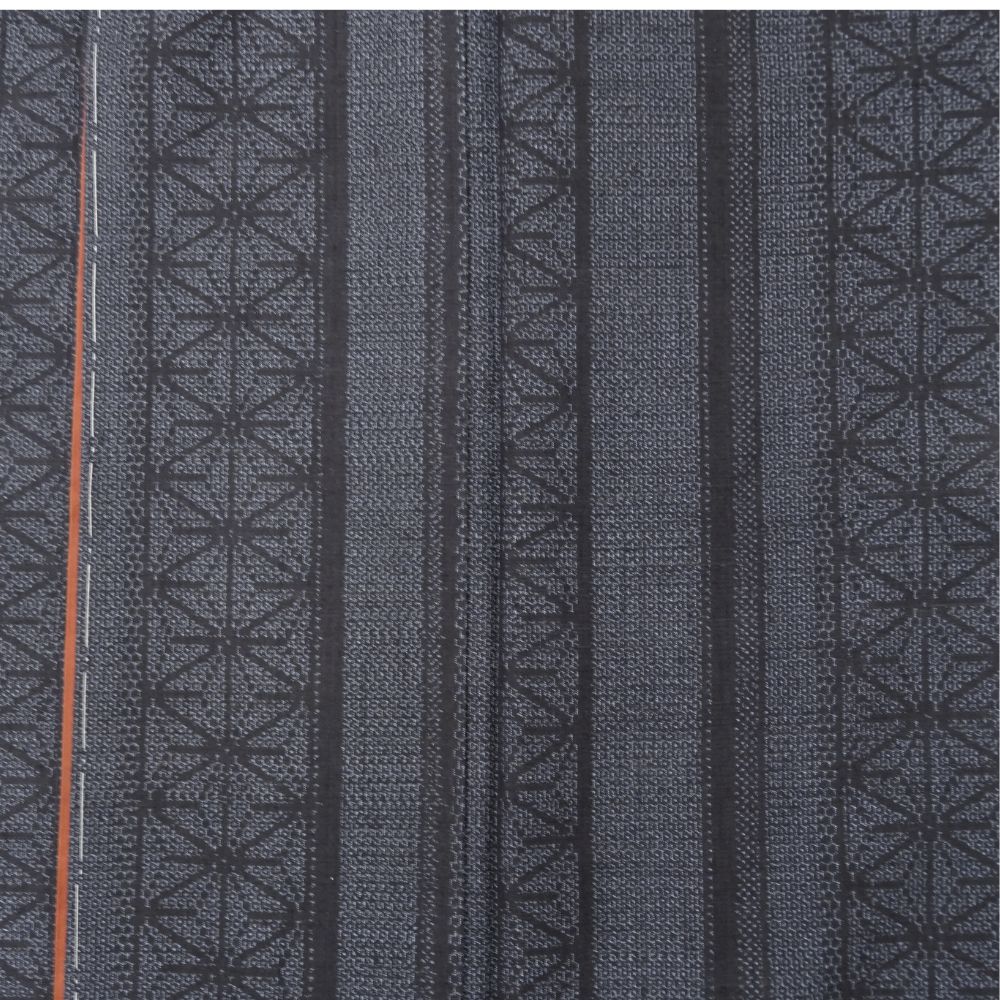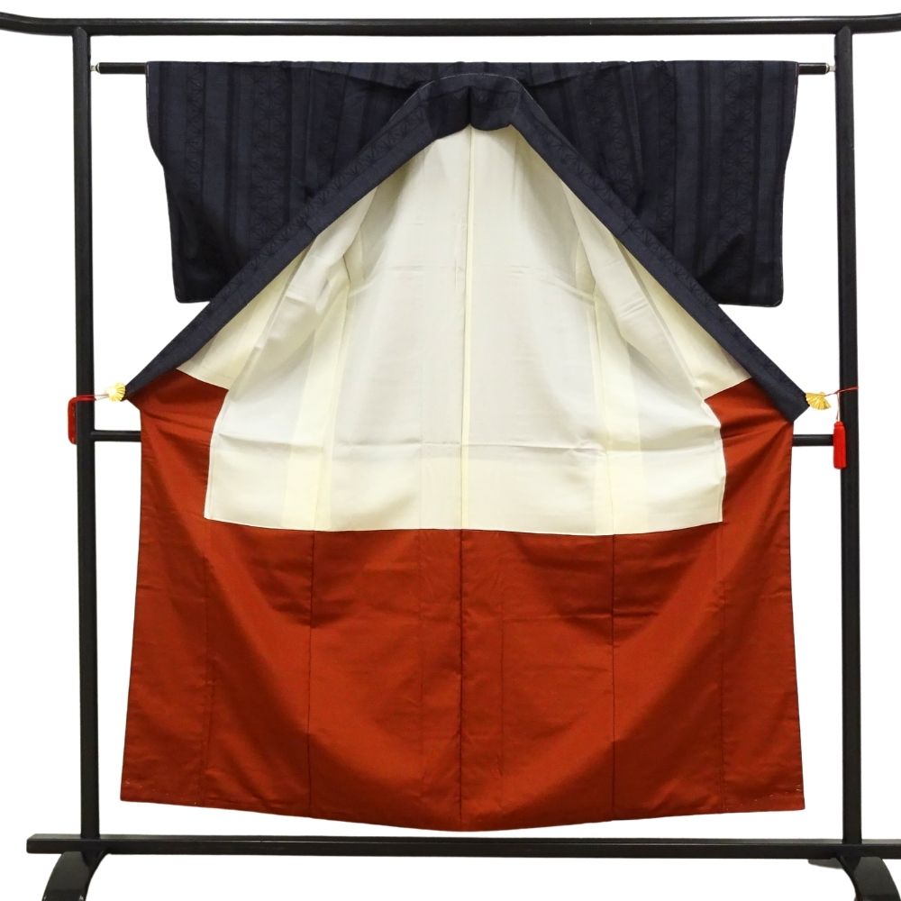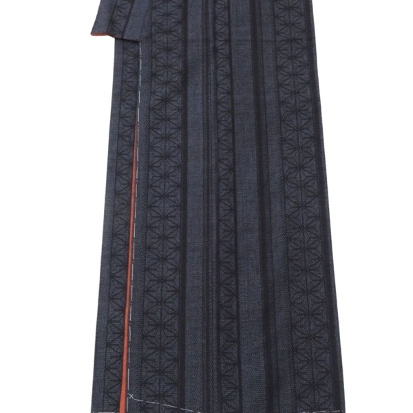 深みのある上品な濃紺色、スッキリとした縦縞の中に、伝統的な麻の葉文様が緻密に織り込まれています。