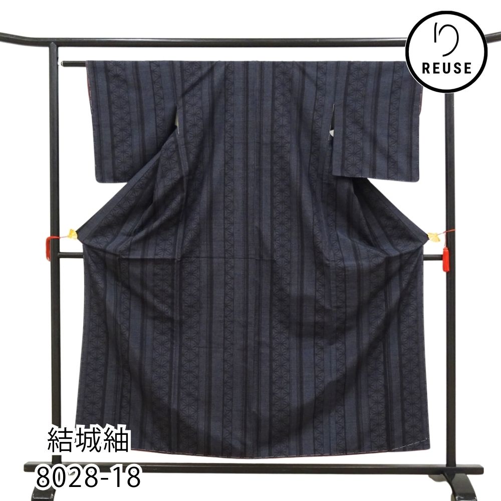 結城紬 100亀甲 正絹 リユース 中古 袷 未使用 濃紺 麻の葉 縞 縦縞 8028-18 (8050-01033)重要無形文化財 普段着 お洒落着 カジュアル 伝統的工芸品