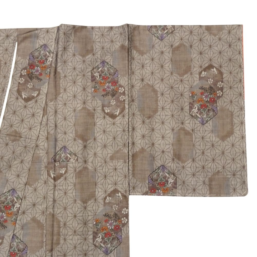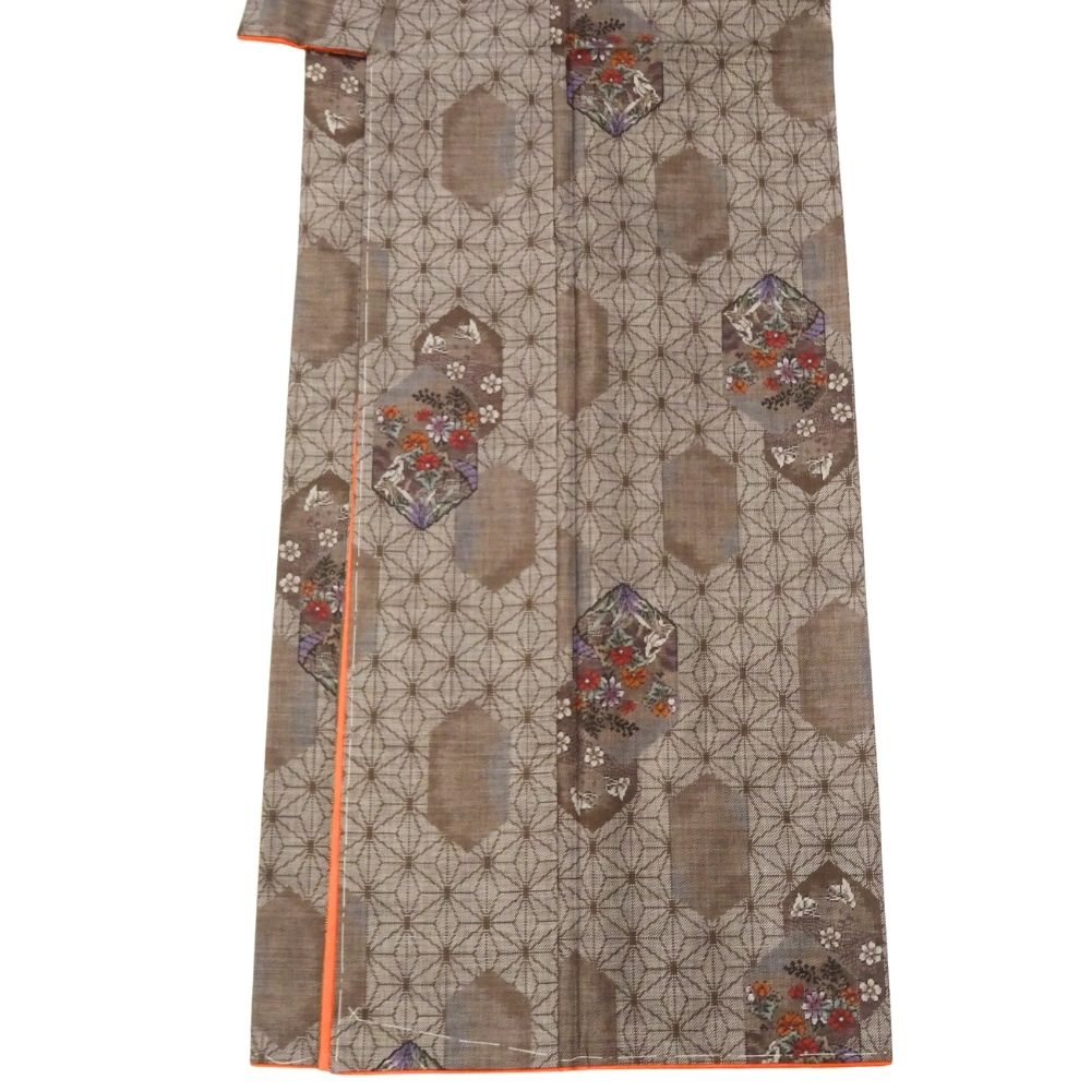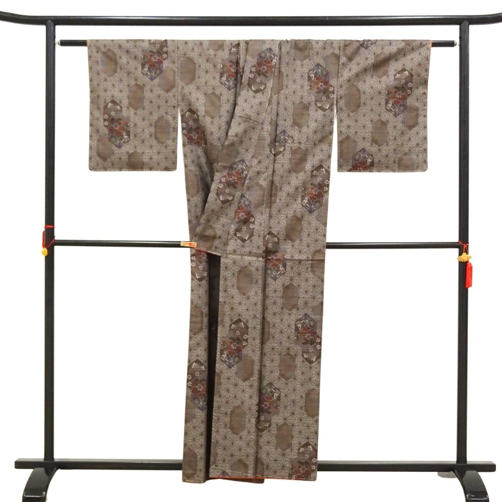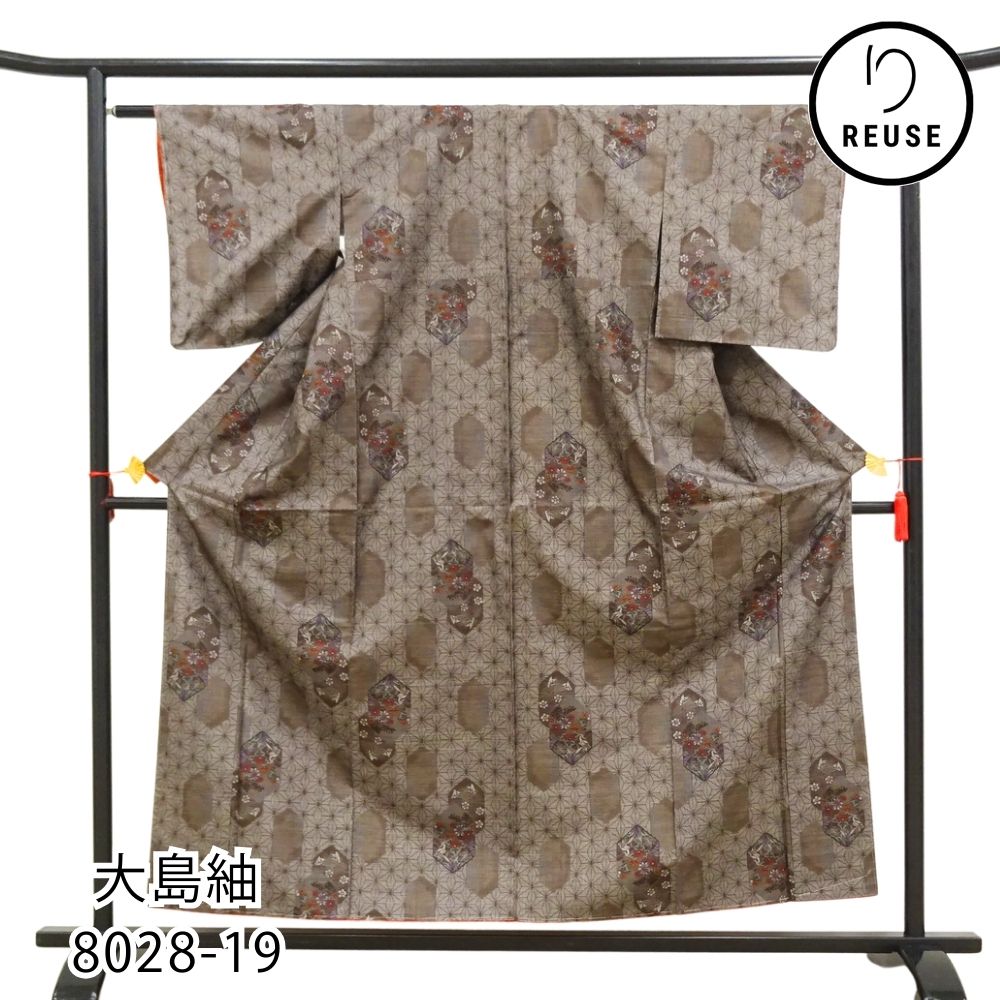 大島紬 9マルキ 正絹 リユース 中古 袷 未使用 泥染 茶褐色 麻の葉 8028-19 (8050-01034) 逸品 お洒落着 普段着 カジュアル