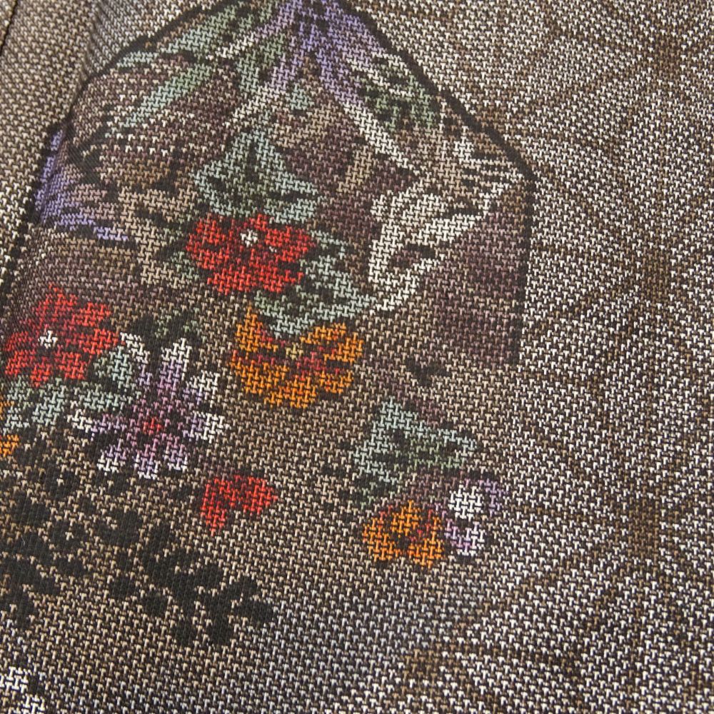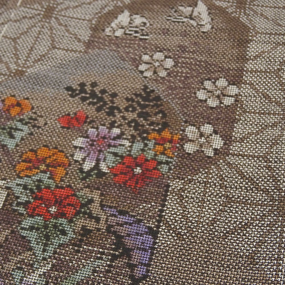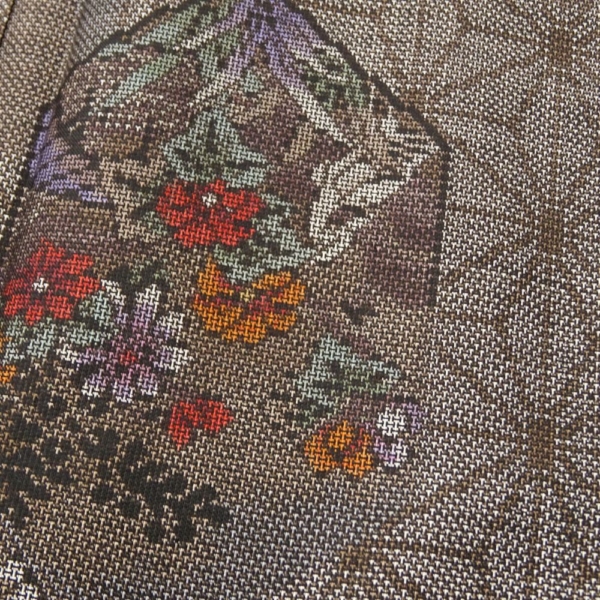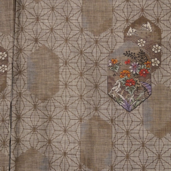 麻の葉文様をベースに、亀甲の中に梅や菊、菖蒲などの四季折々の花々が細密な絣で描かれています。