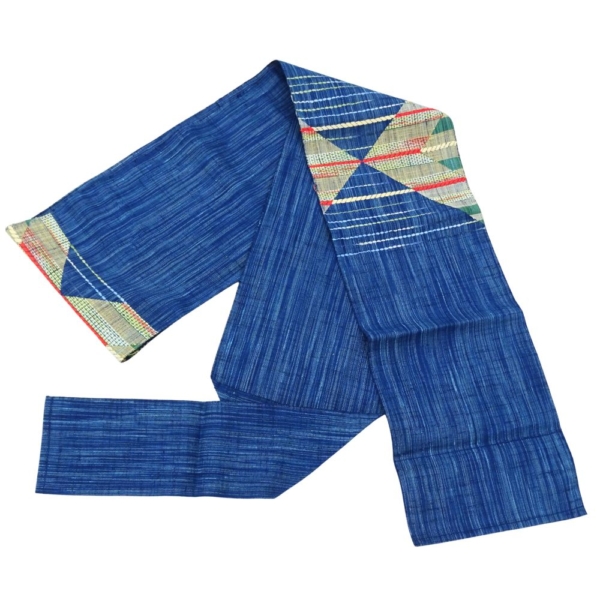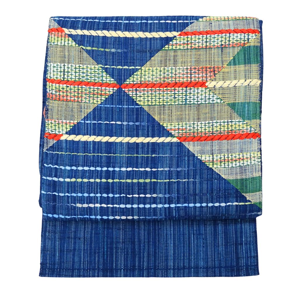 青色の地に、大胆な幾何学模様が施された名古屋帯です。