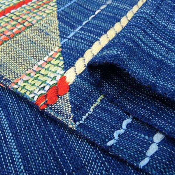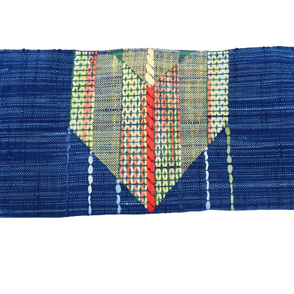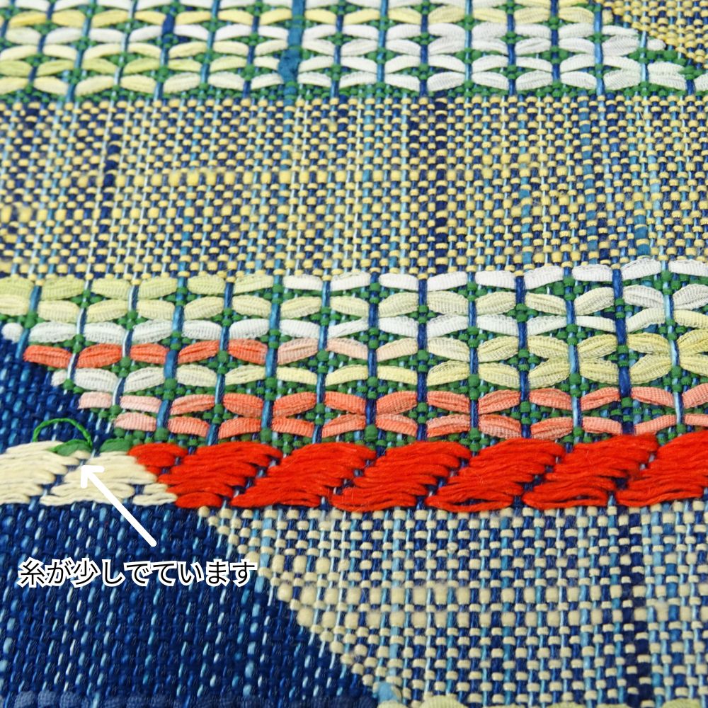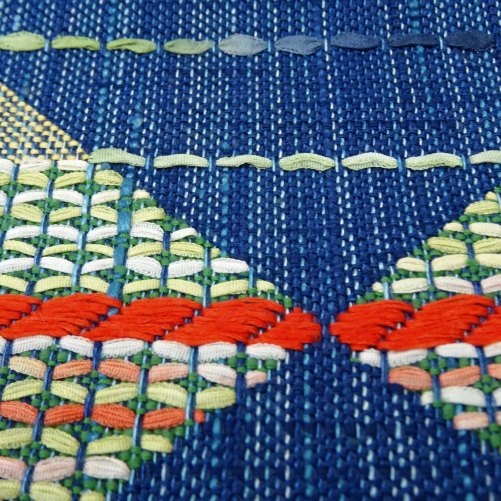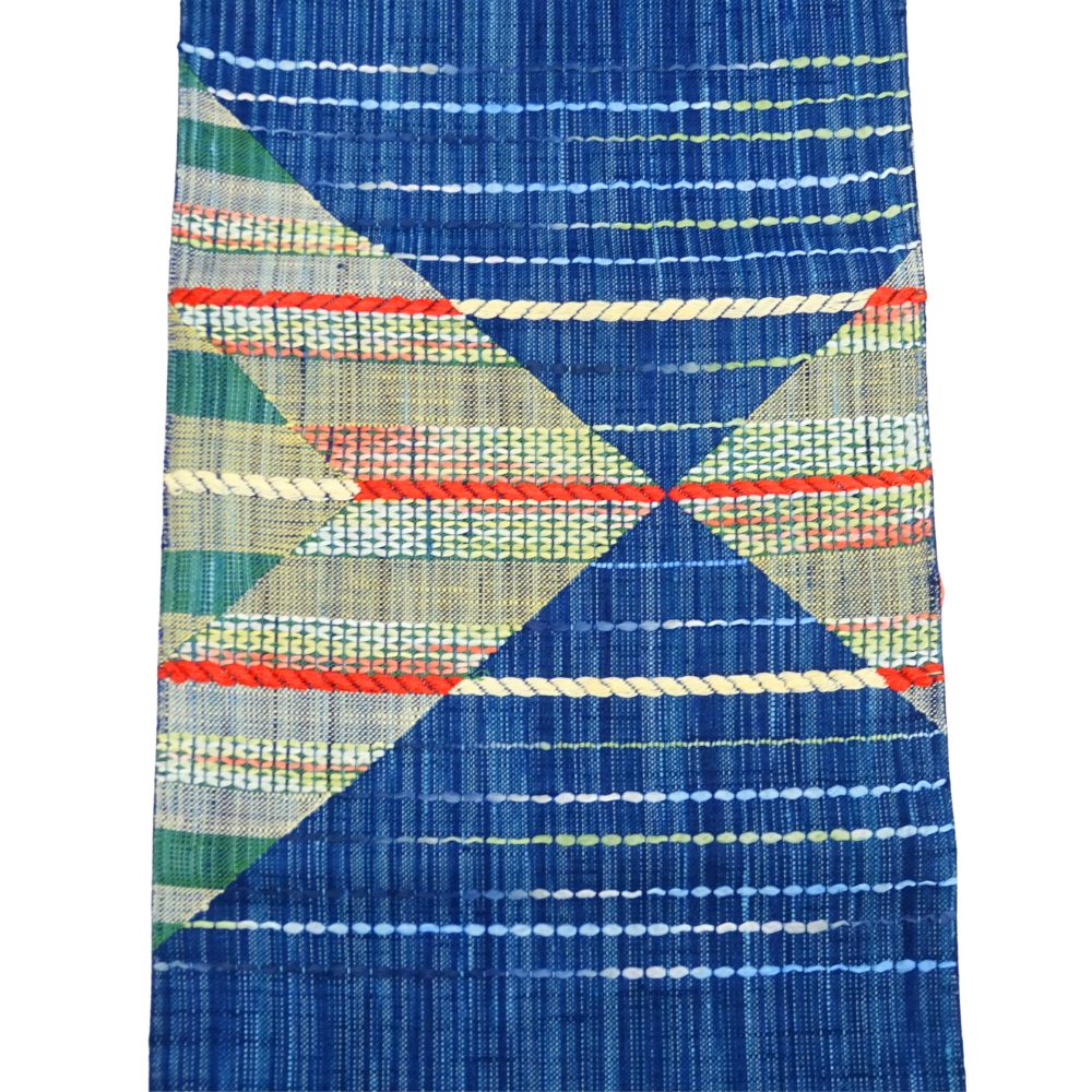 中央で交差する菱形のデザインには、赤、黄、緑、白などの多彩な糸が織り込まれており、シンプルながらも表情豊かな仕上がりとなっています。