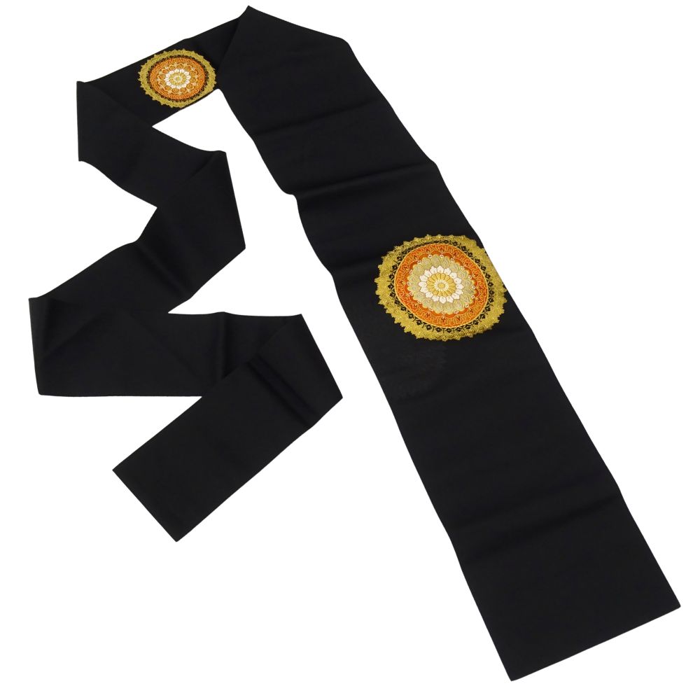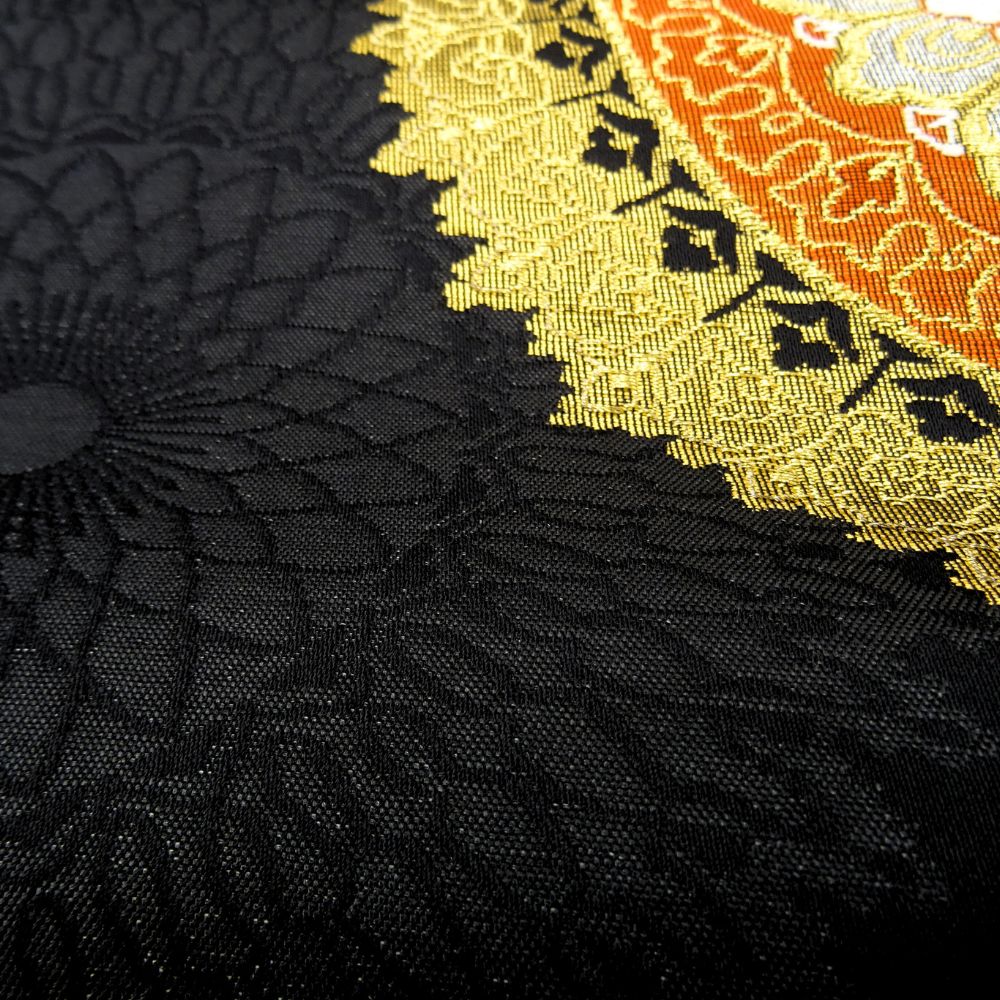 名古屋帯 正絹 リユース 中古 黒地 金糸 オレンジ 華紋 豪華刺繍 8029-7 セミフォーマル 観劇 パーティー