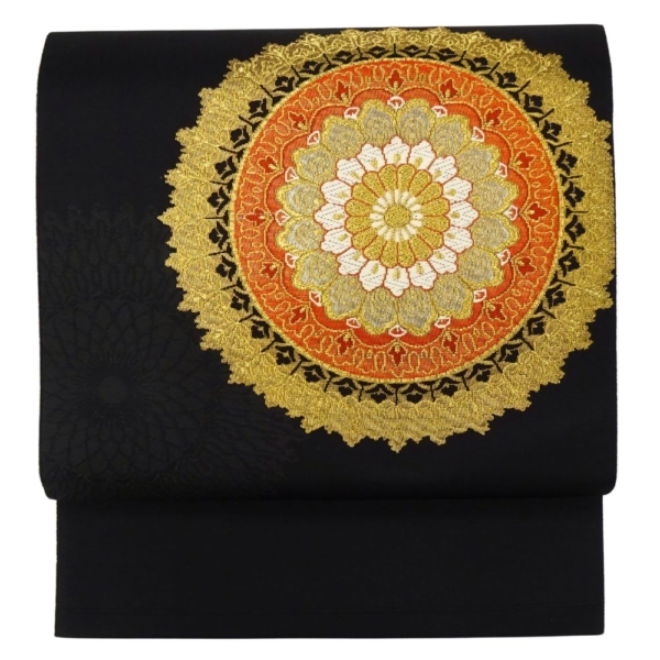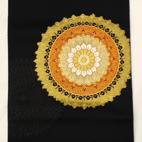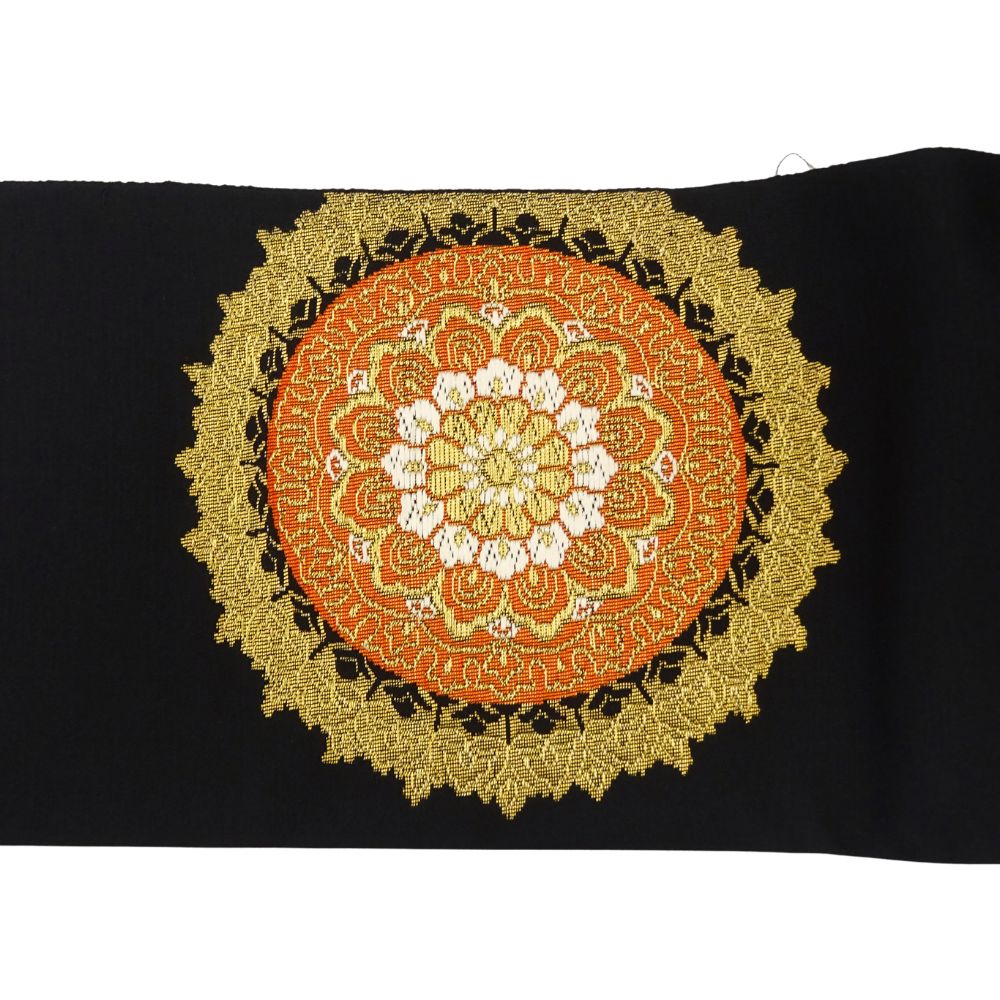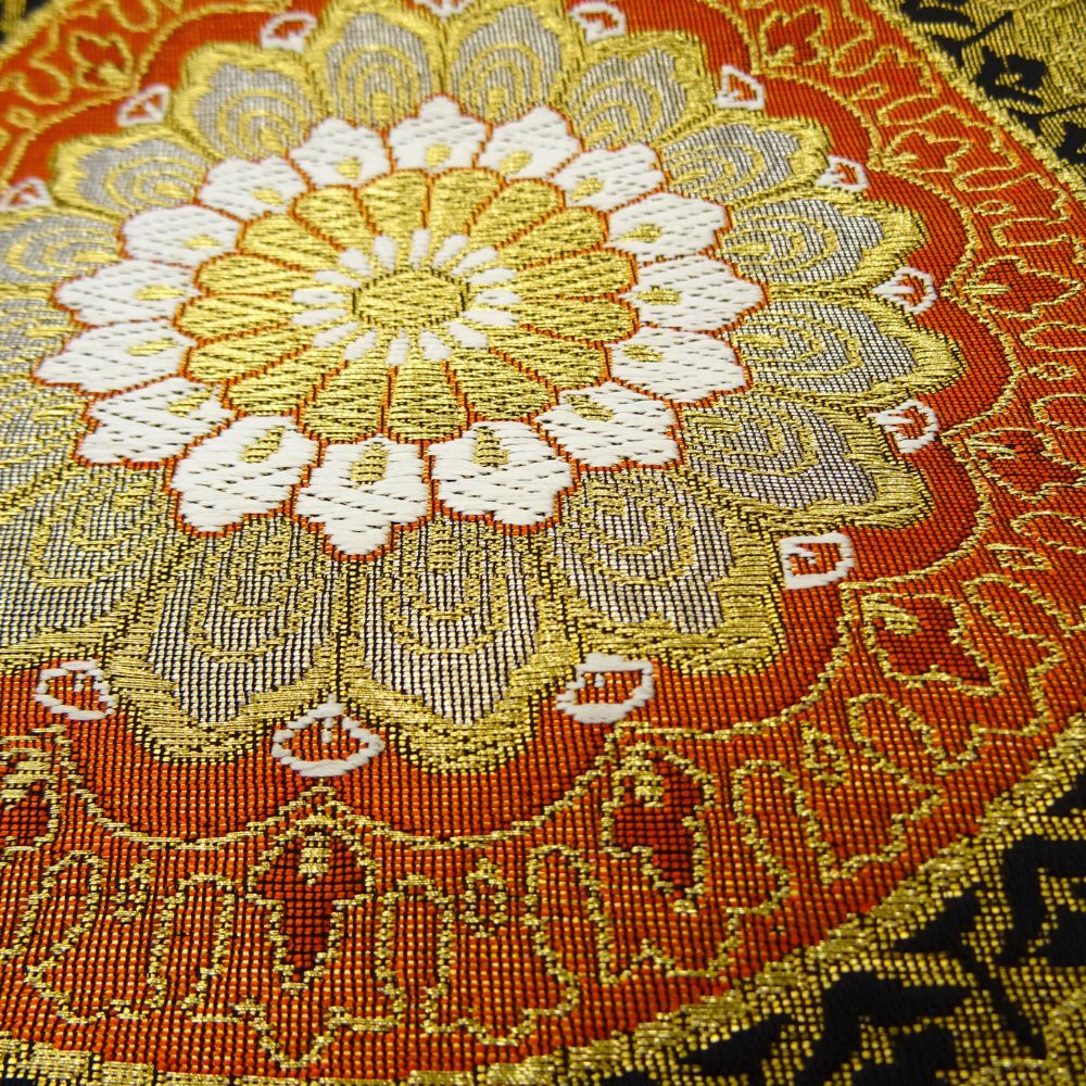中央の意匠は曼荼羅や鏡裏文を思わせるエキゾチックな雰囲気があり、金糸とオレンジのコントラストが圧倒的な存在感を放ちます。