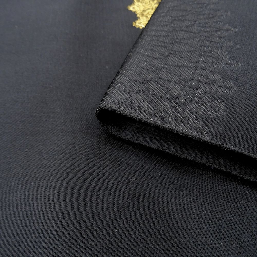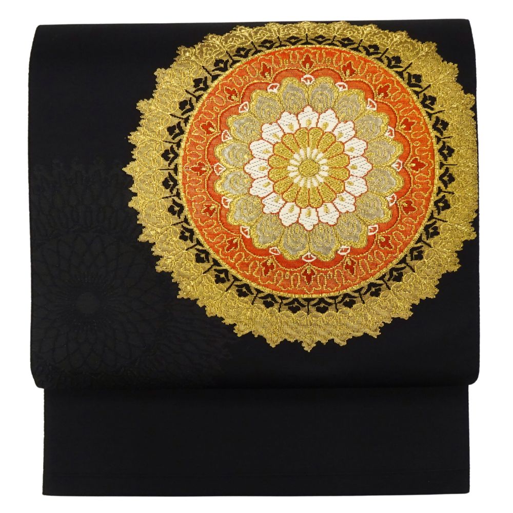 凛とした黒地に、精緻な織りで表現された大輪の華紋が目を引く名古屋帯です。