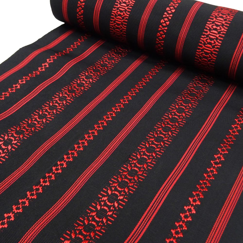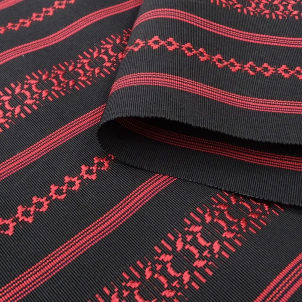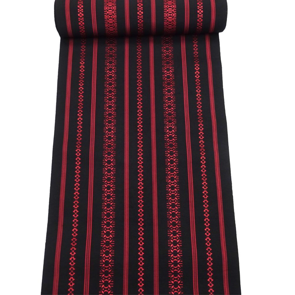 シックな黒にピンクがかった赤が映える、博多織の八寸名古屋帯(反物)です。