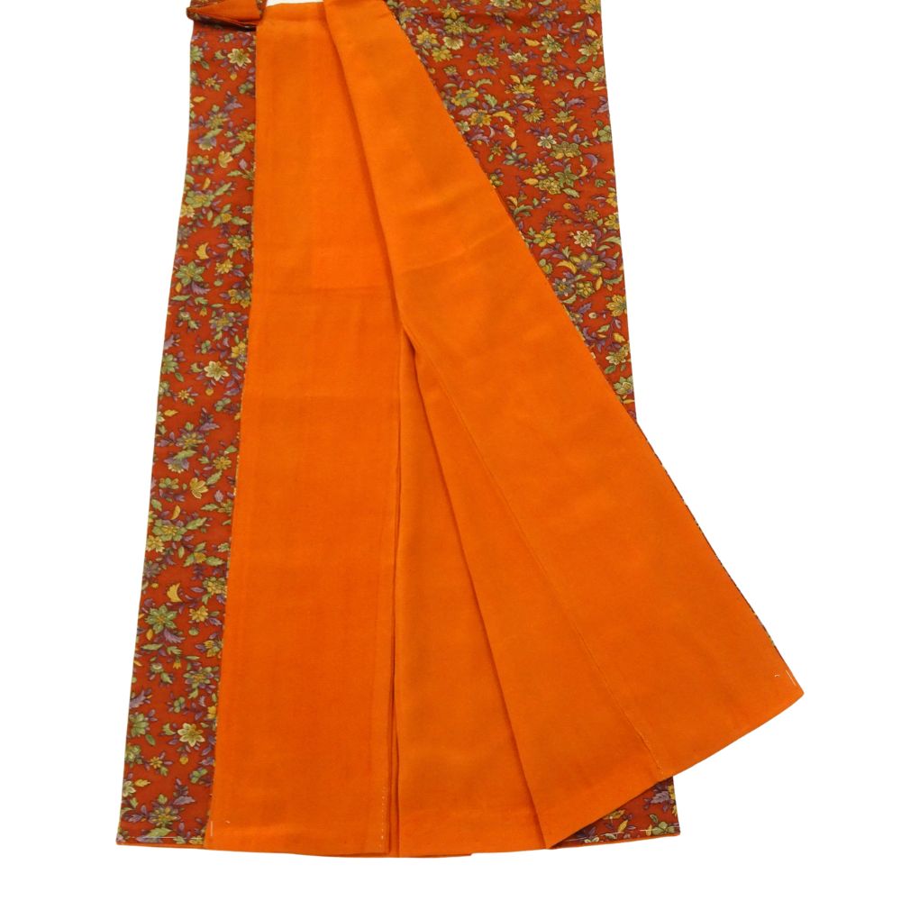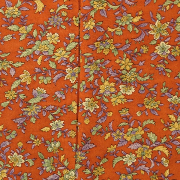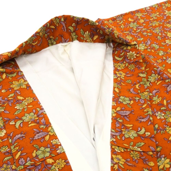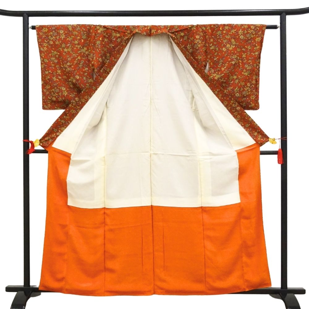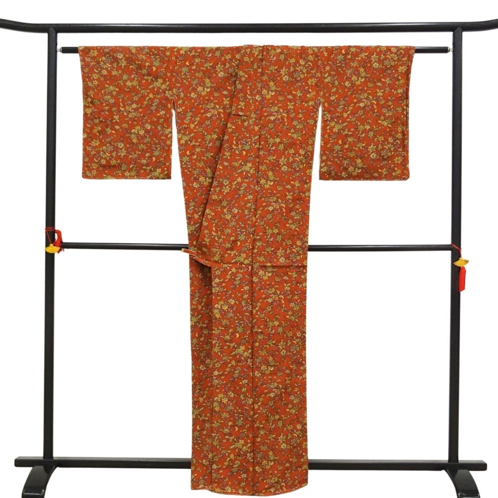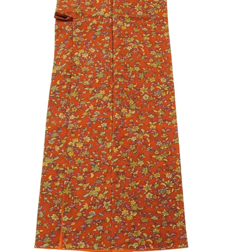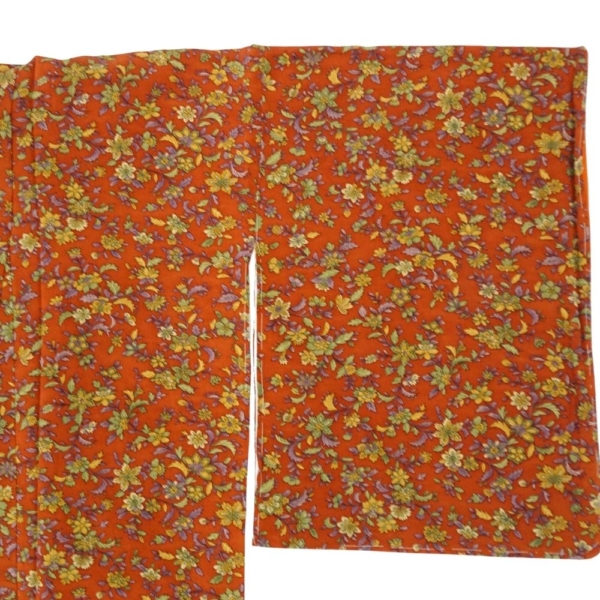 小紋 正絹 リユース 中古 袷 バチ衿 柿色 四季草花文様 8032-2 レトロモダン カジュアル 街着 お稽古