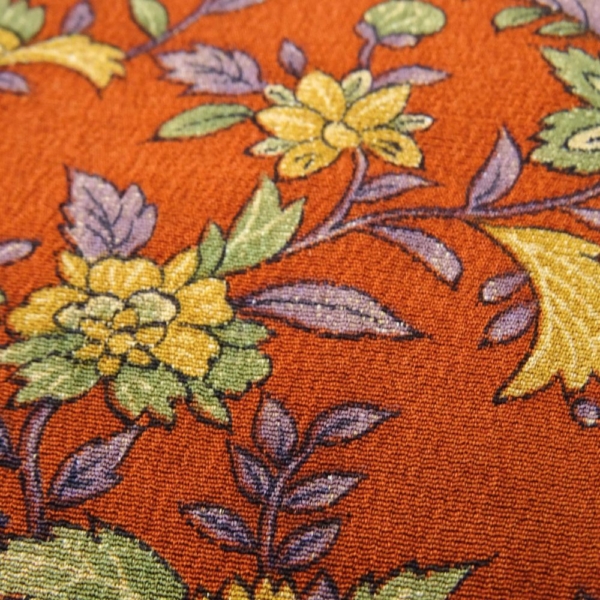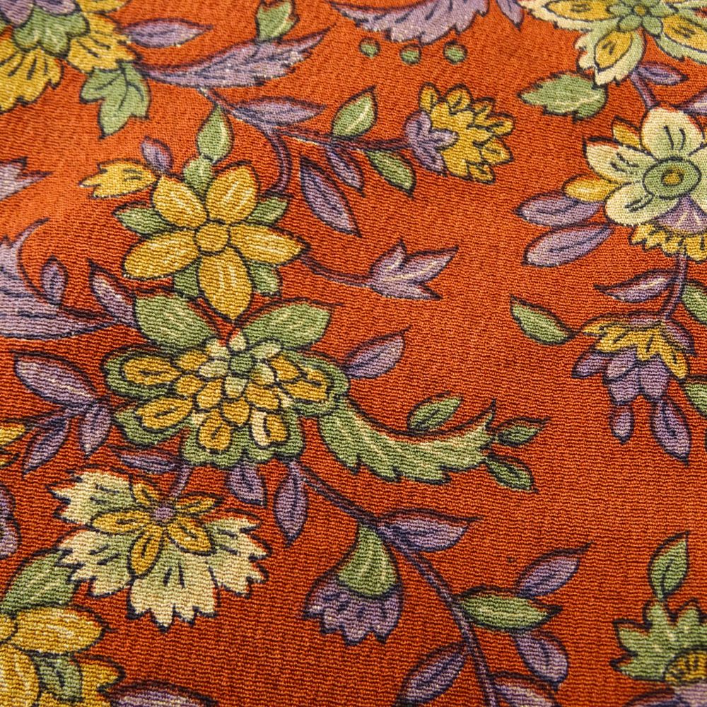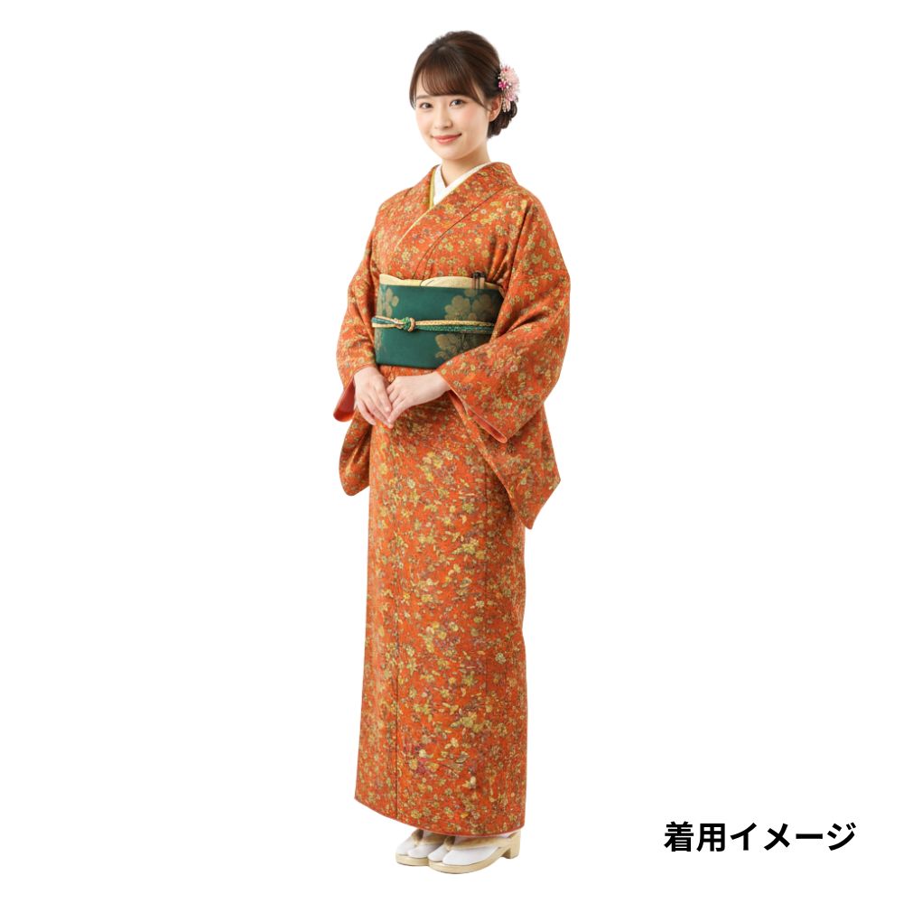 温かみのある柿色の地に、繊細なタッチで描かれた四季の草花が咲き誇る、華やかさと上品さを兼ね備えた正絹の小紋です。