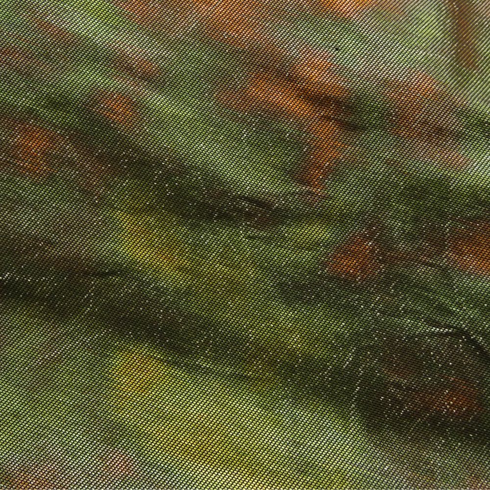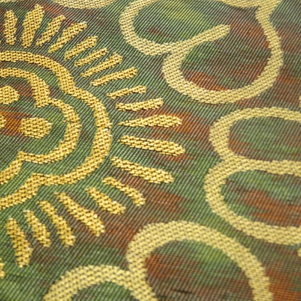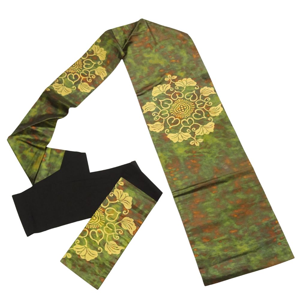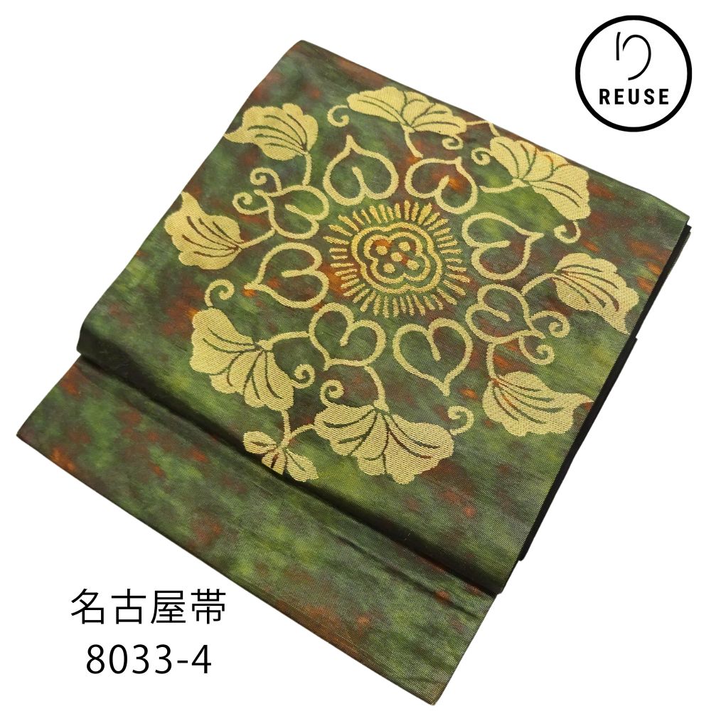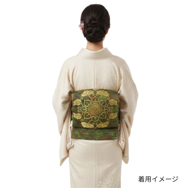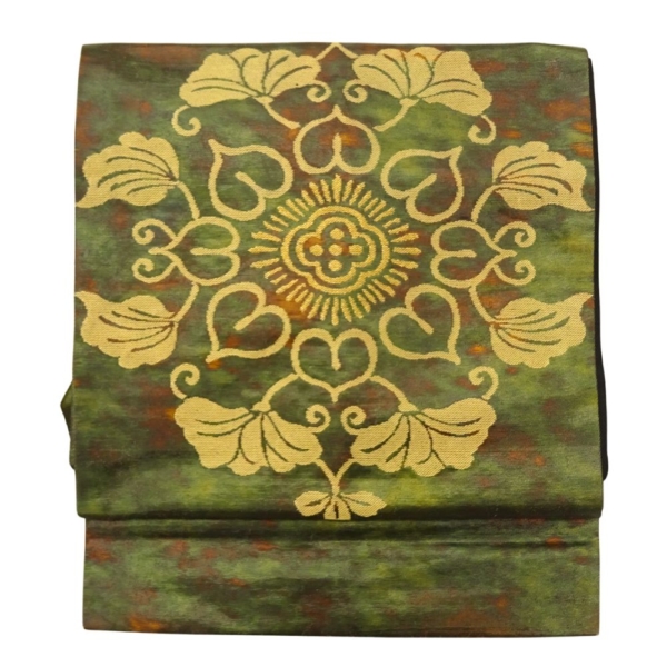 深みのある緑色に、味わい深い色合いが重なるモダンな地色が特徴の名古屋帯です。