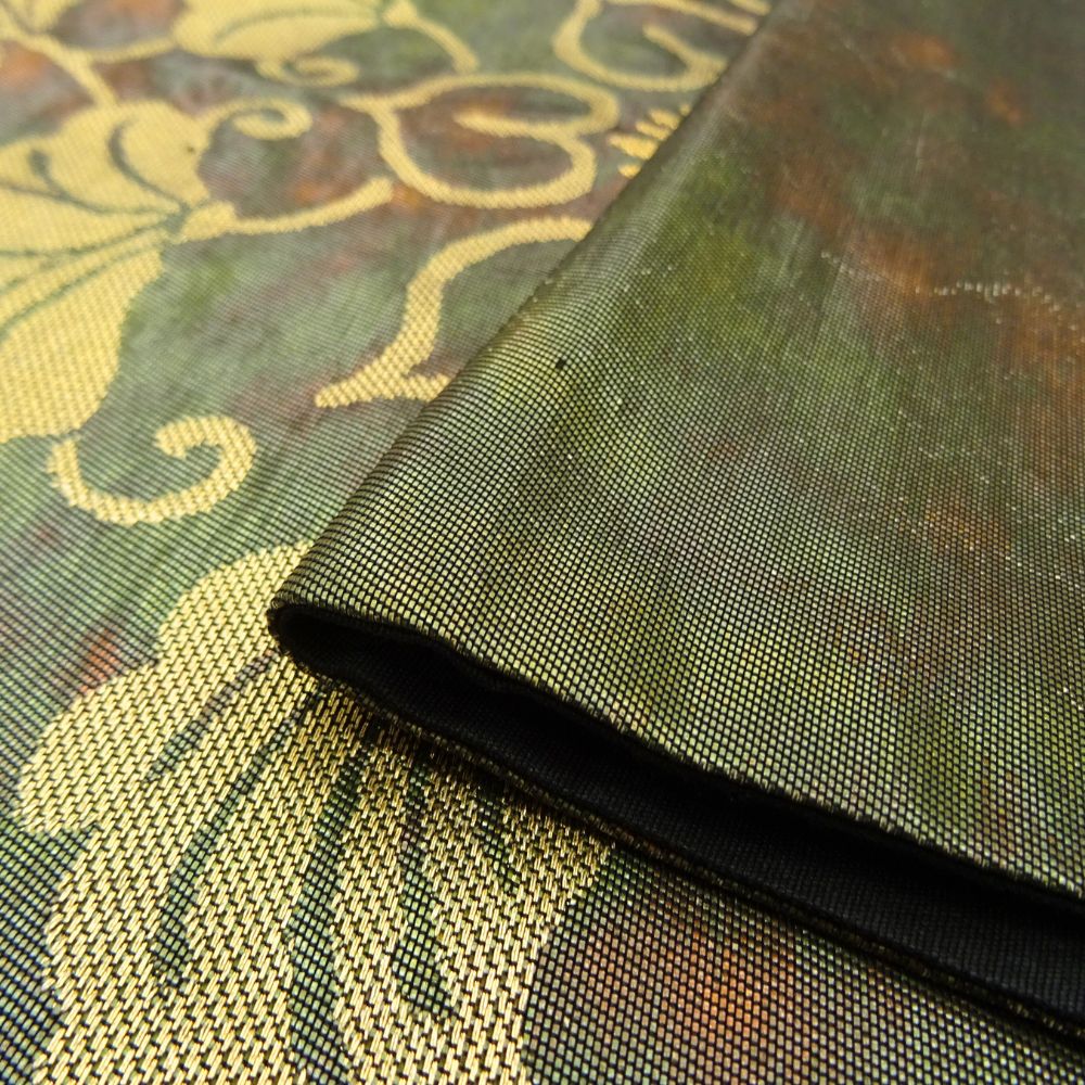 全体には格調高い華文様が金糸を用いて鮮やかに織り出されており、古典的な情緒と現代的なセンスが融合した美しい仕上がりとなっております。