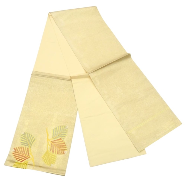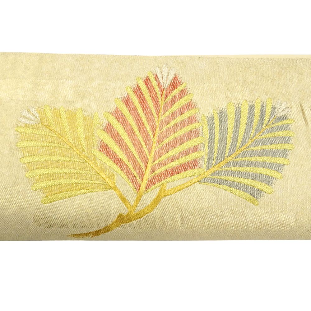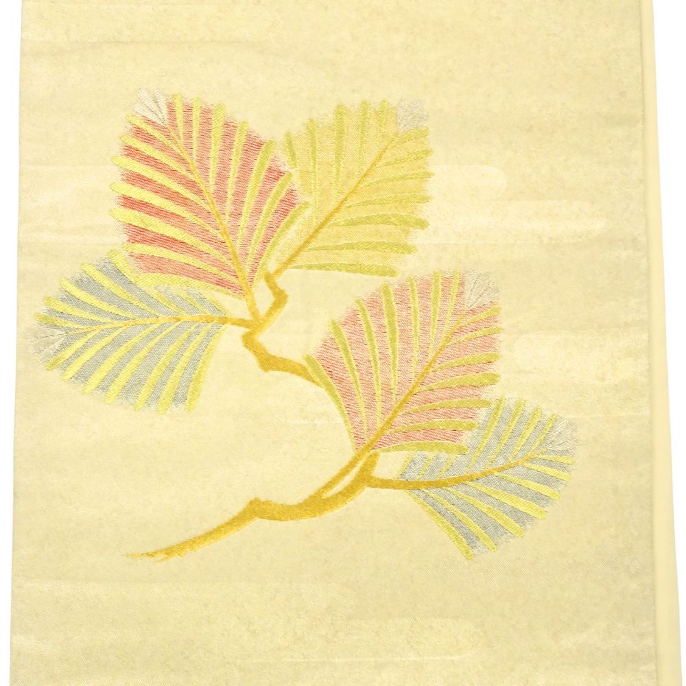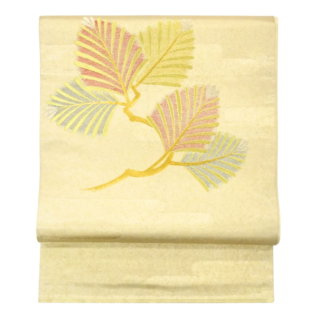 柔らかなクリーム色の地に、金糸の霞模様と繊細な刺繍が施された気品あふれる袋帯です。