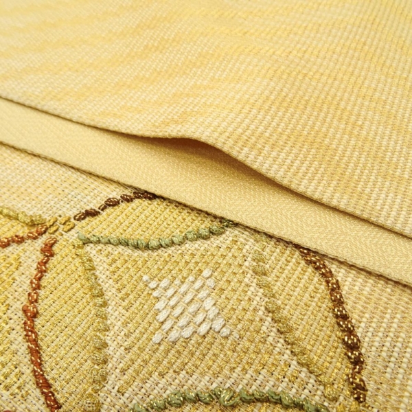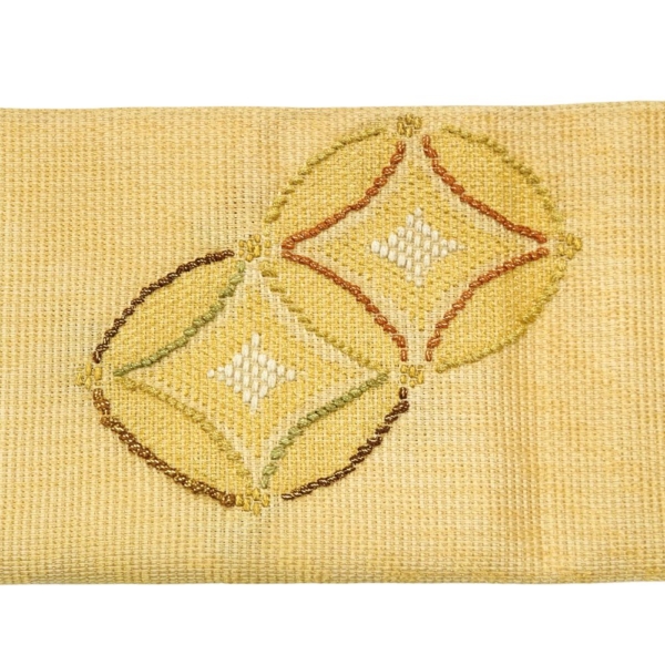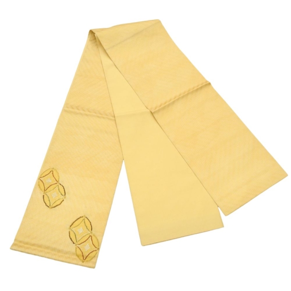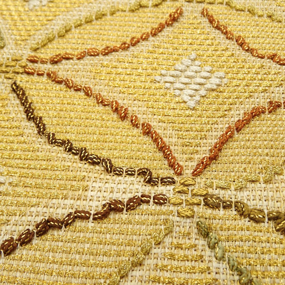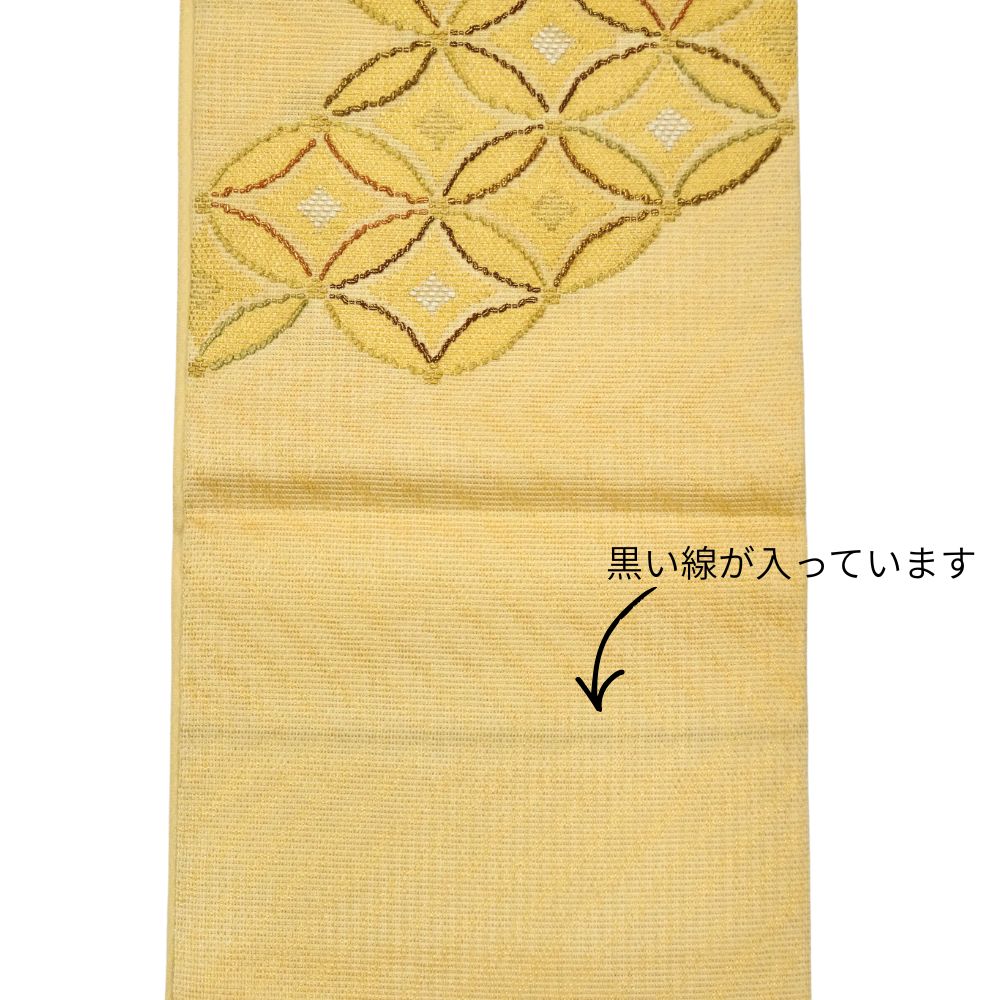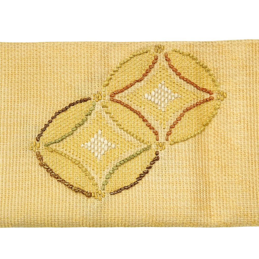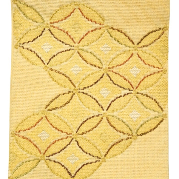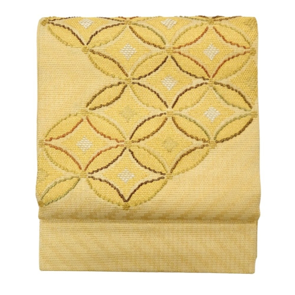 パッと目を引く山吹茶色の地に、七宝つなぎをふっくらとした刺繍で施した、華やかさと気品を兼ね備えた袋帯です。