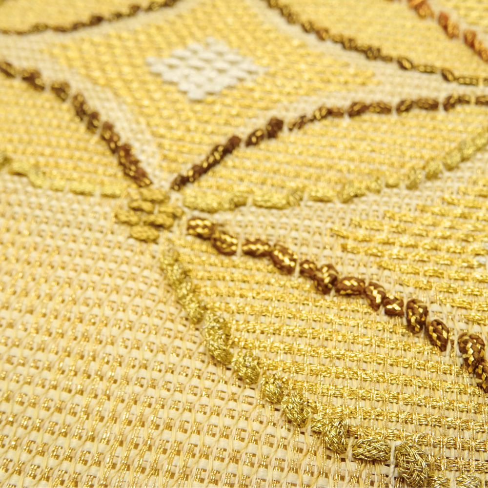 落ち着いたゴールドと、焦茶、深い緑、白の刺繍糸が絶妙なコントラストを生み出し、古典的なモチーフながらもどこかエキゾチックで現代的な雰囲気を醸し出しています。