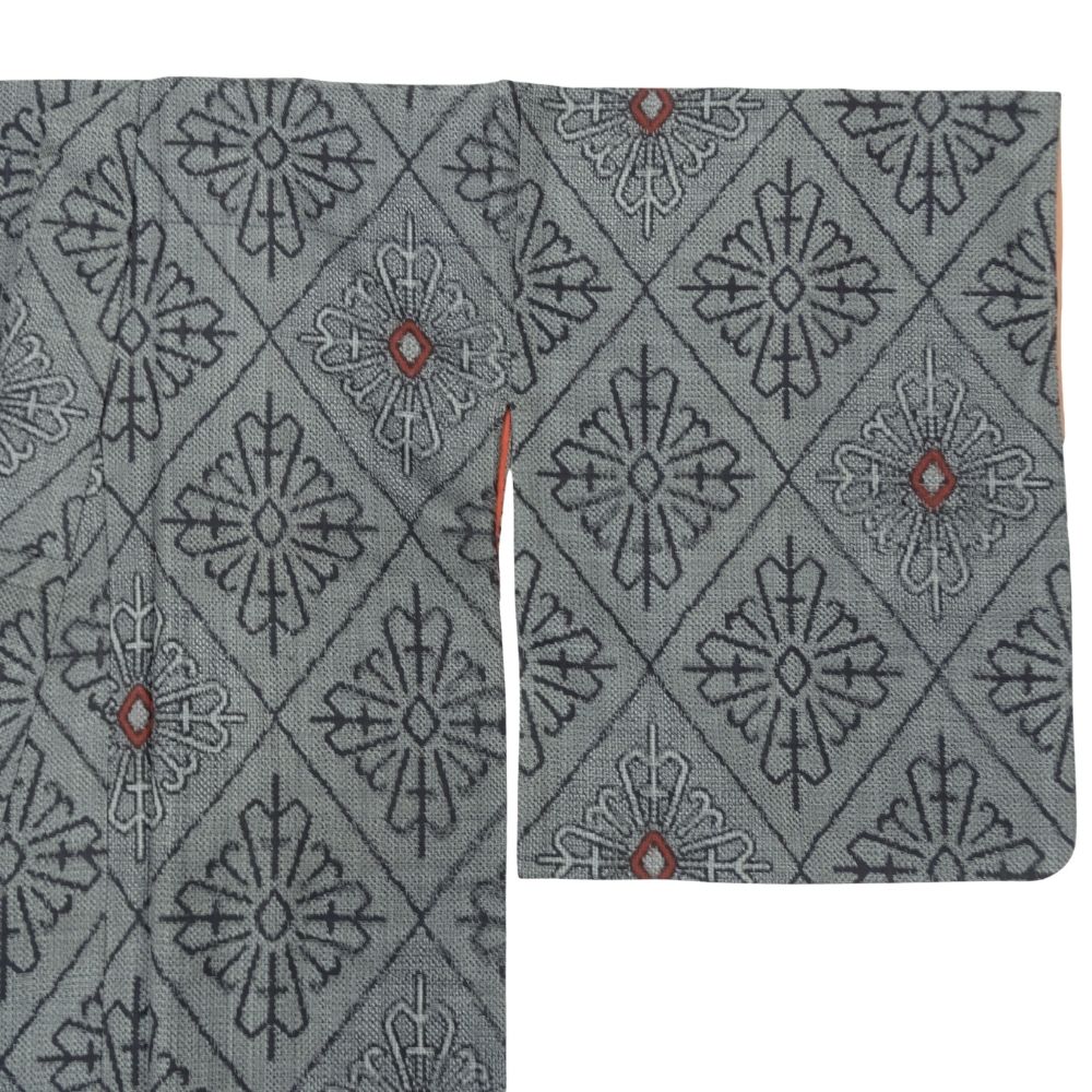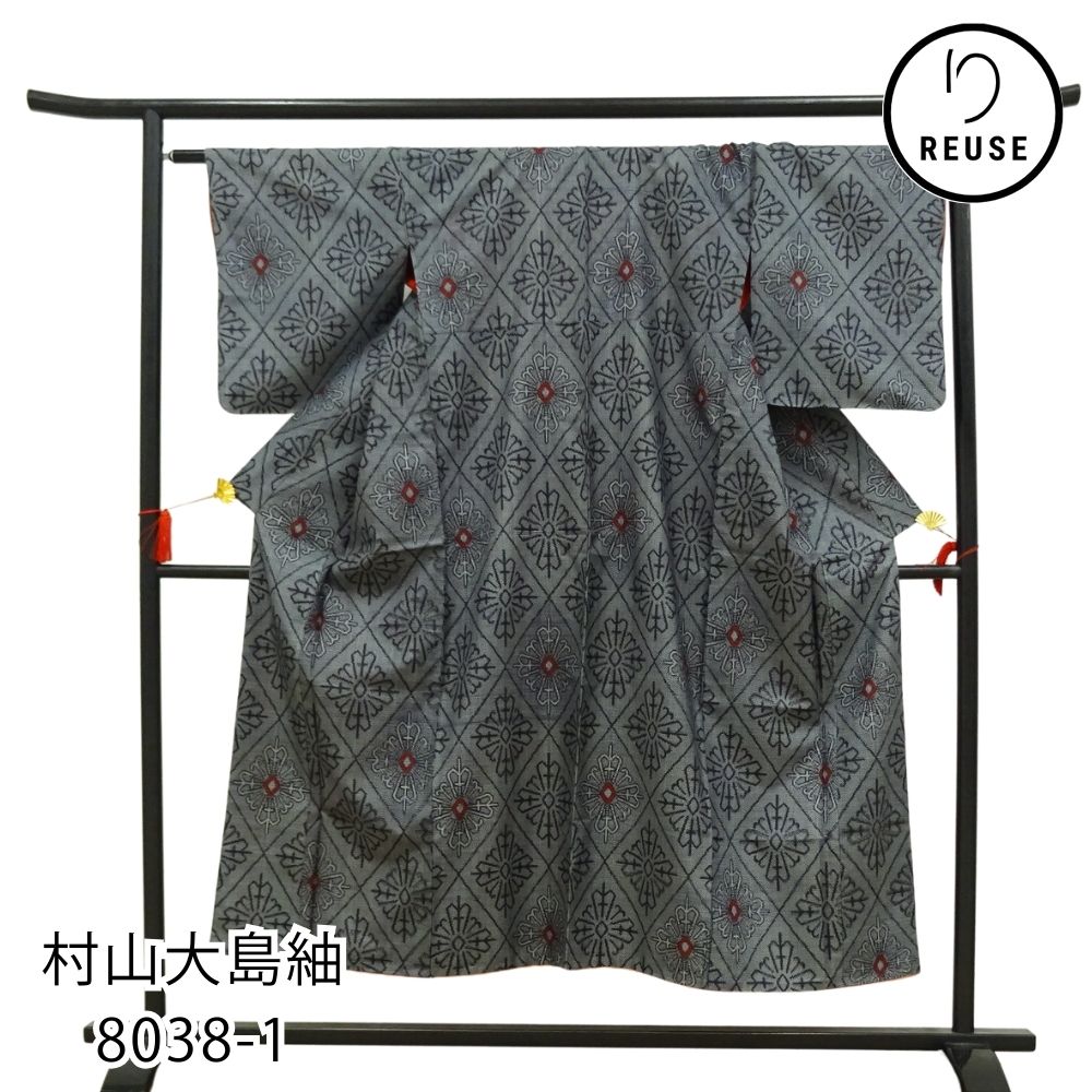 村山大島紬 正絹 リユース 中古 袷 グレー 幾何学文様 8038-1 モダン・スタイリッシュ 街着・普段着に