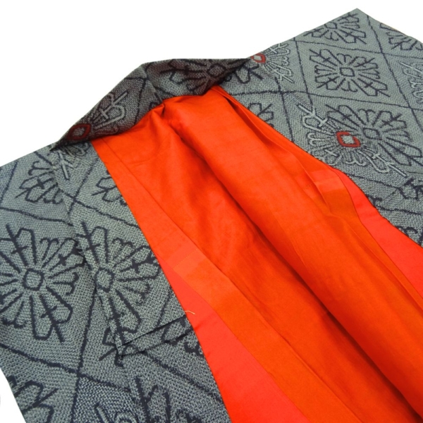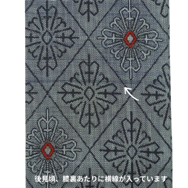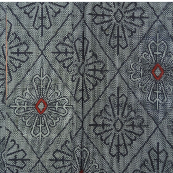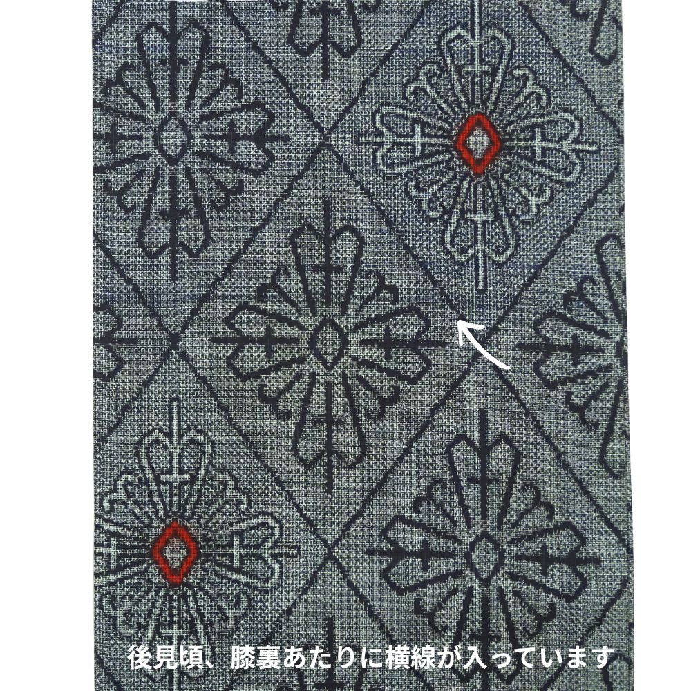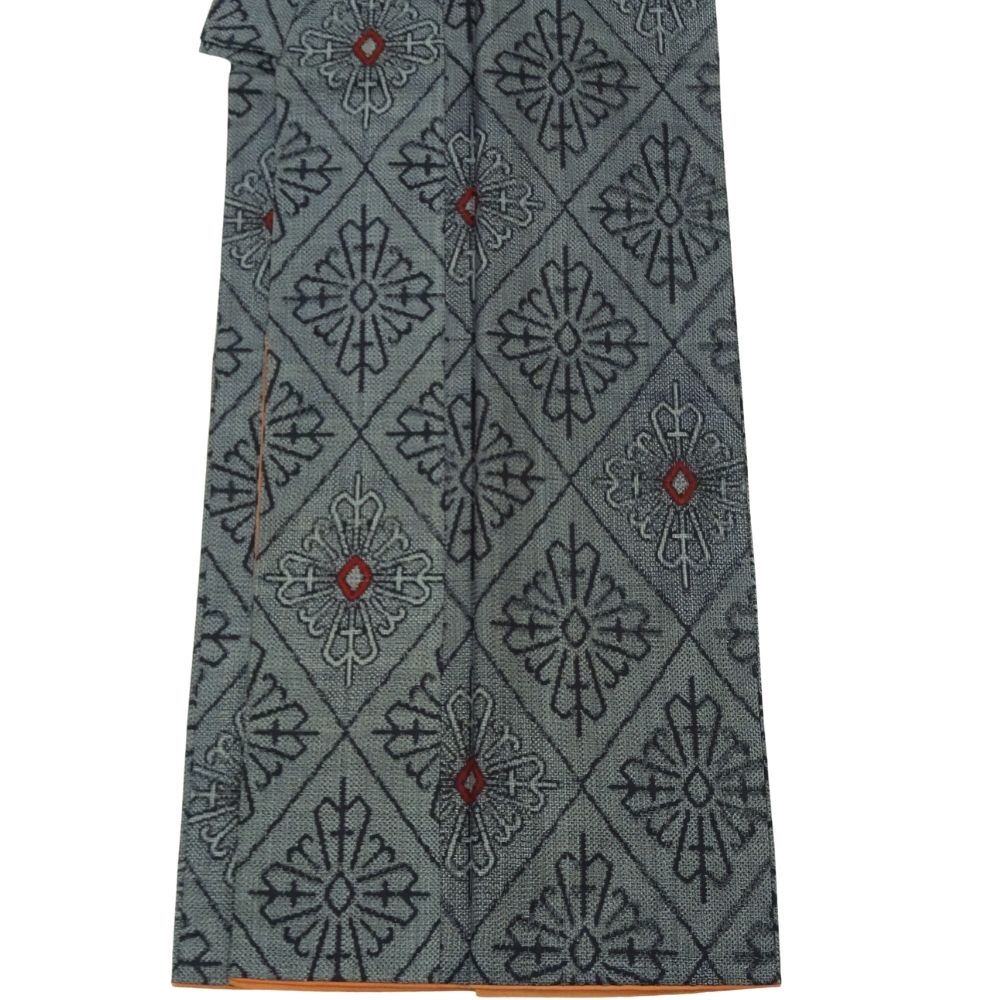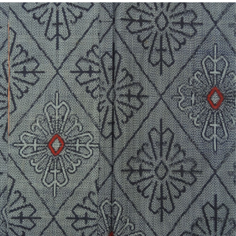 ベースは落ち着いた灰色で、全体に幾何学的な花菱のような文様が織り出されています。
