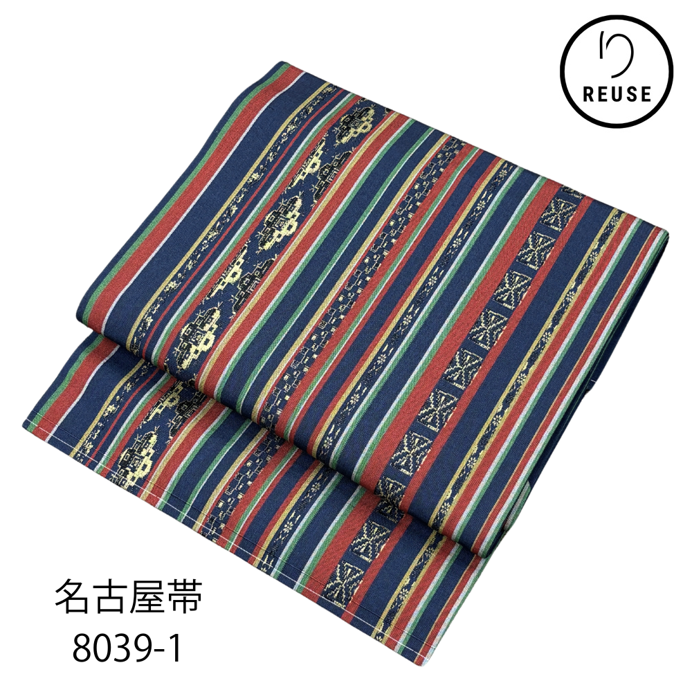 名古屋帯 正絹 リユース 中古 九寸 縞にエキゾチック紋様 多色使い カジュアル 洒落帯 8039-1