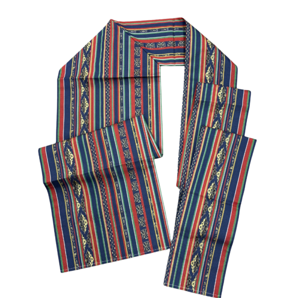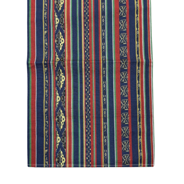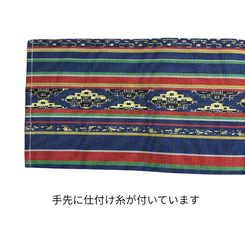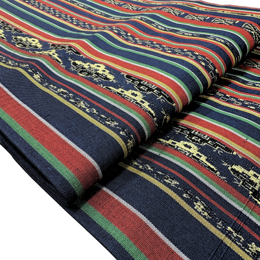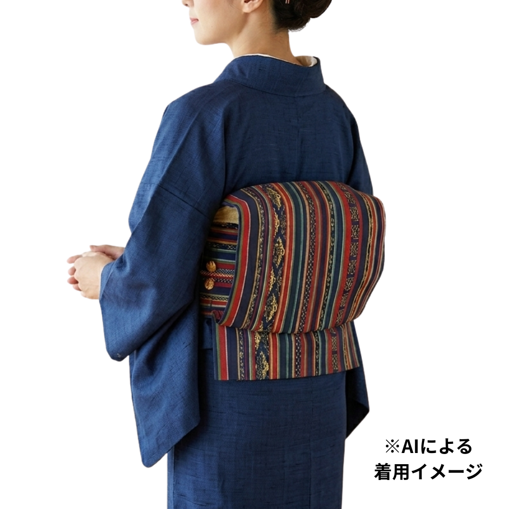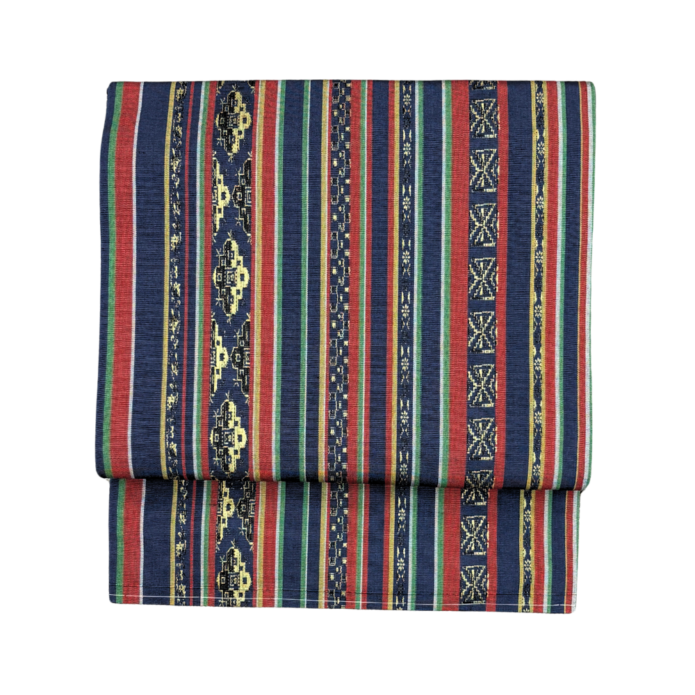 深みのある紺色をベースに、エンジ・緑・白の細やかな縞模様と、エキゾチックな雰囲気漂う更紗風の幾何学紋様が織り出された名古屋帯です。