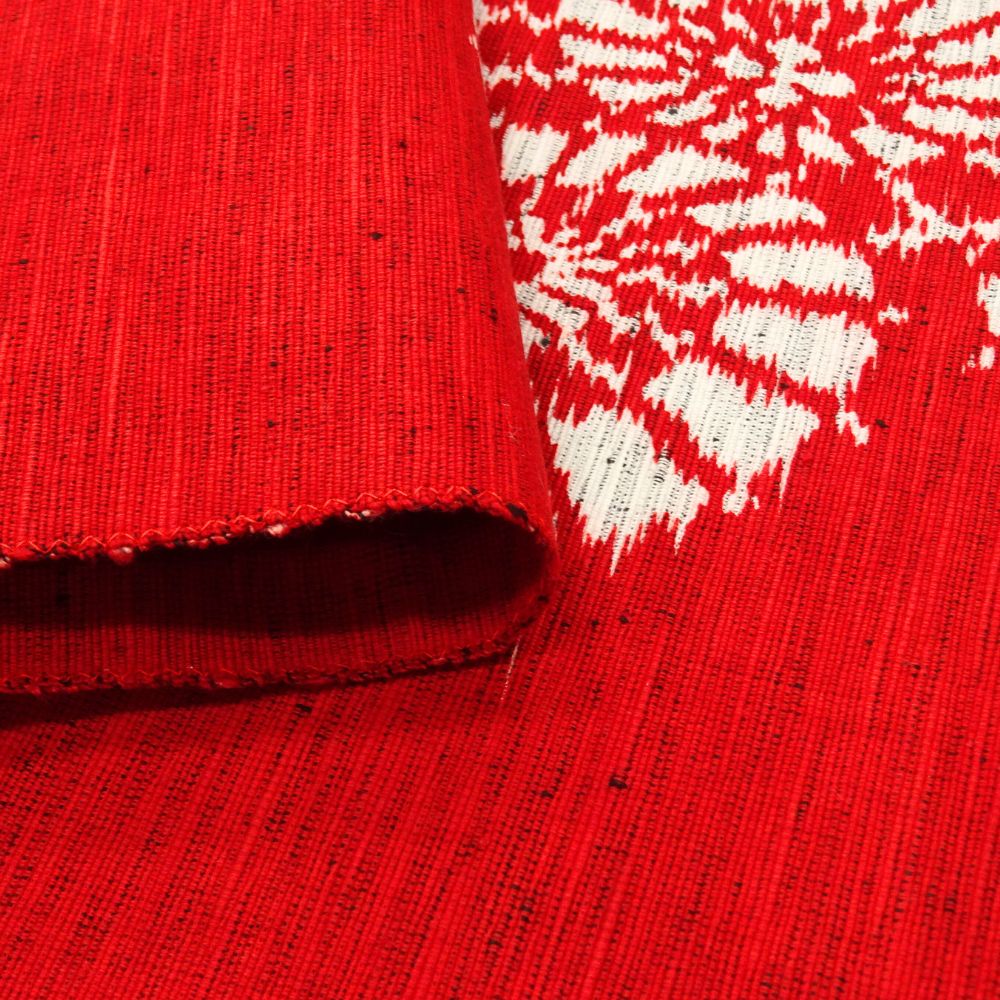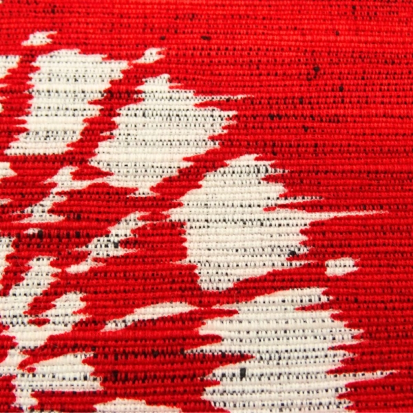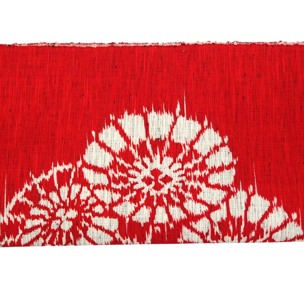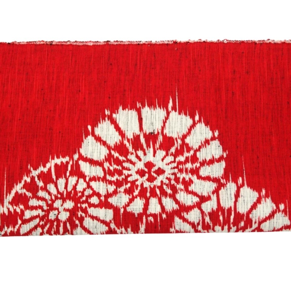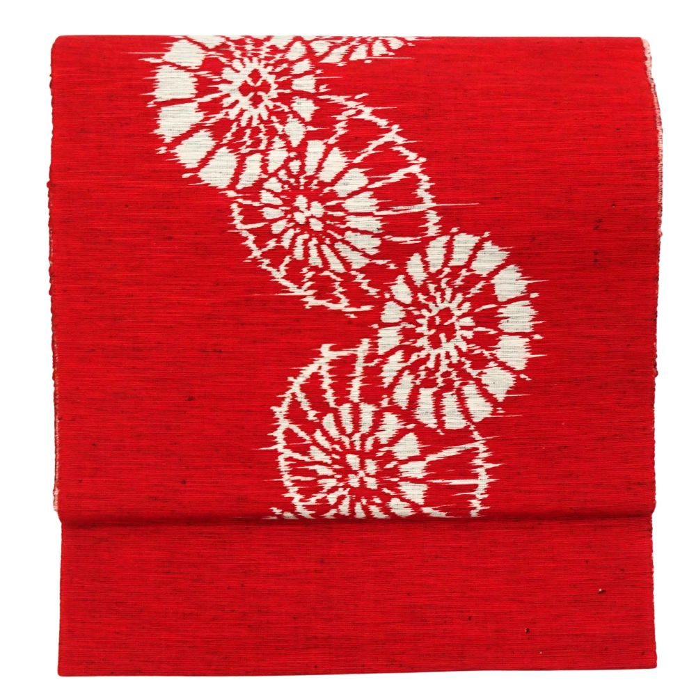 パッと目を引く鮮やかな赤地に、大胆な白い紋様が流れるように配された、木綿の名古屋帯です。