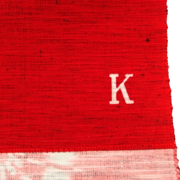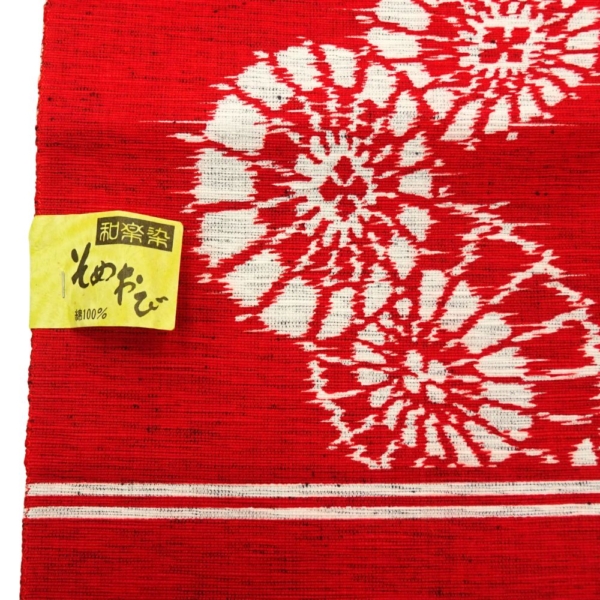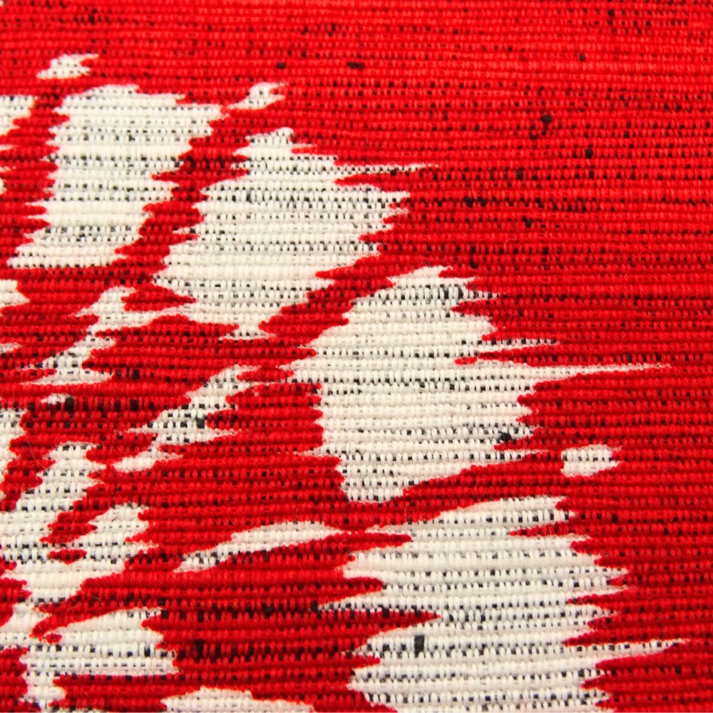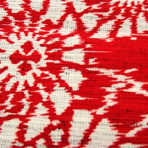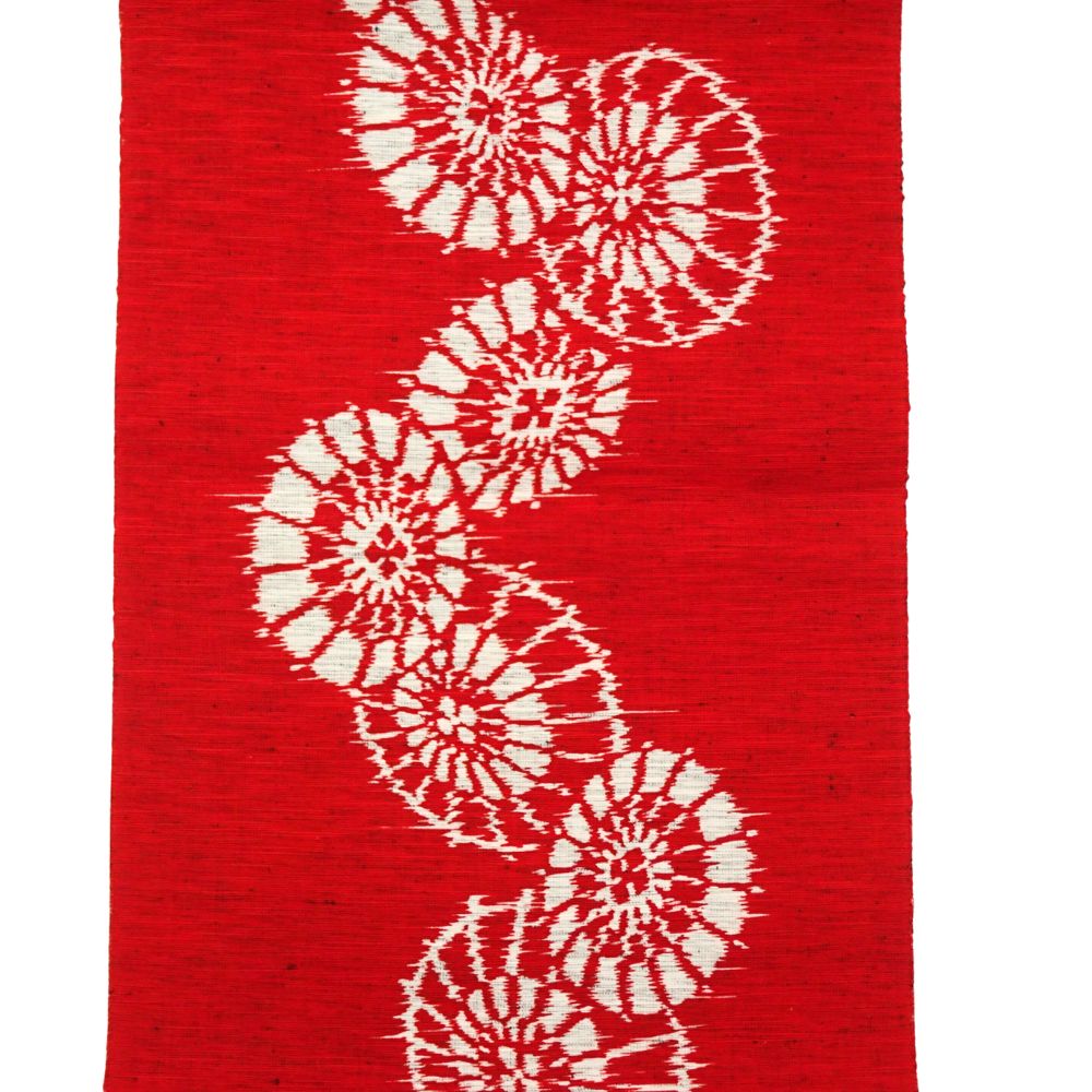 パッと目を引く鮮やかな赤地に、大胆な白い紋様が流れるように配された、木綿の名古屋帯です。
