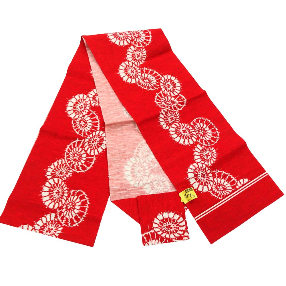 名古屋帯 綿100% リユース 未使用 和楽染 そめおび 赤色 白 菊 抽象紋様 8041-8 八寸名古屋帯 カジュアル モダン 木綿