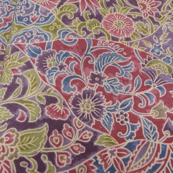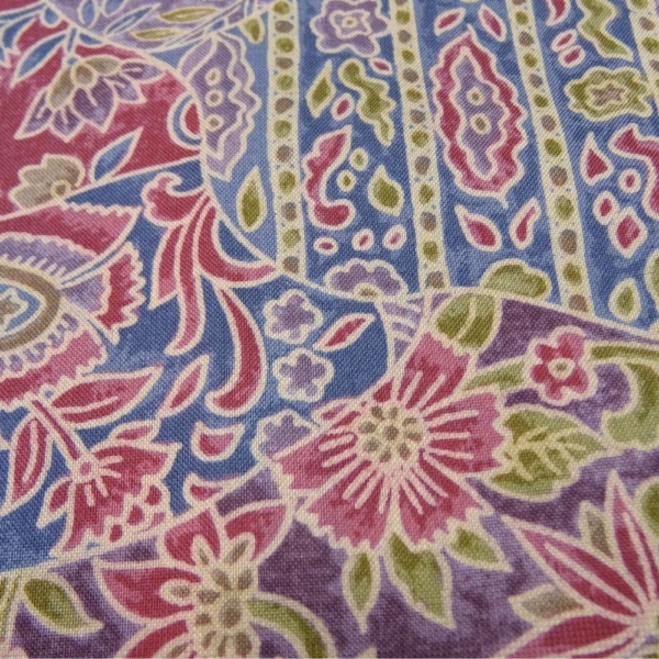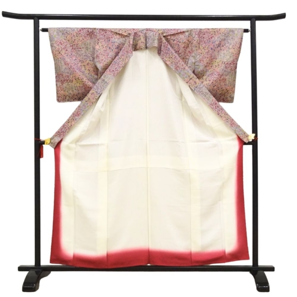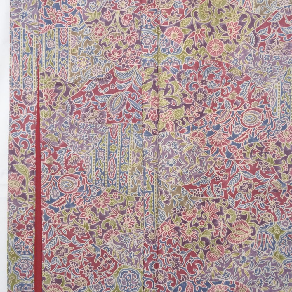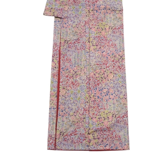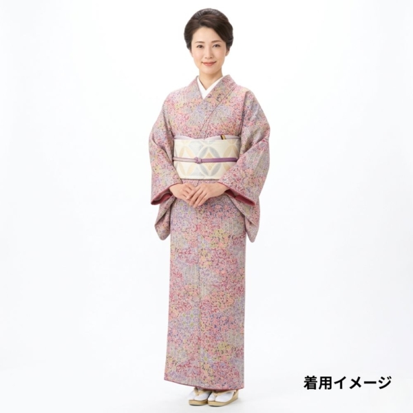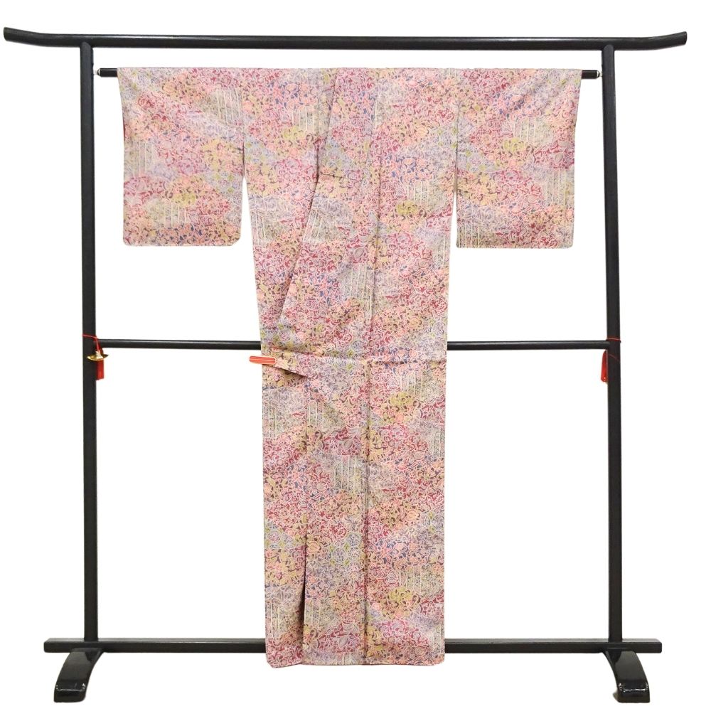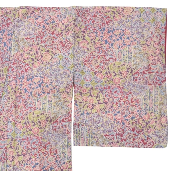 淡い藤色やピンク、柔らかなイエローなど、多彩なニュアンスカラーで更紗文様を寄せ集めた、意匠を凝らした正絹の小紋です。
