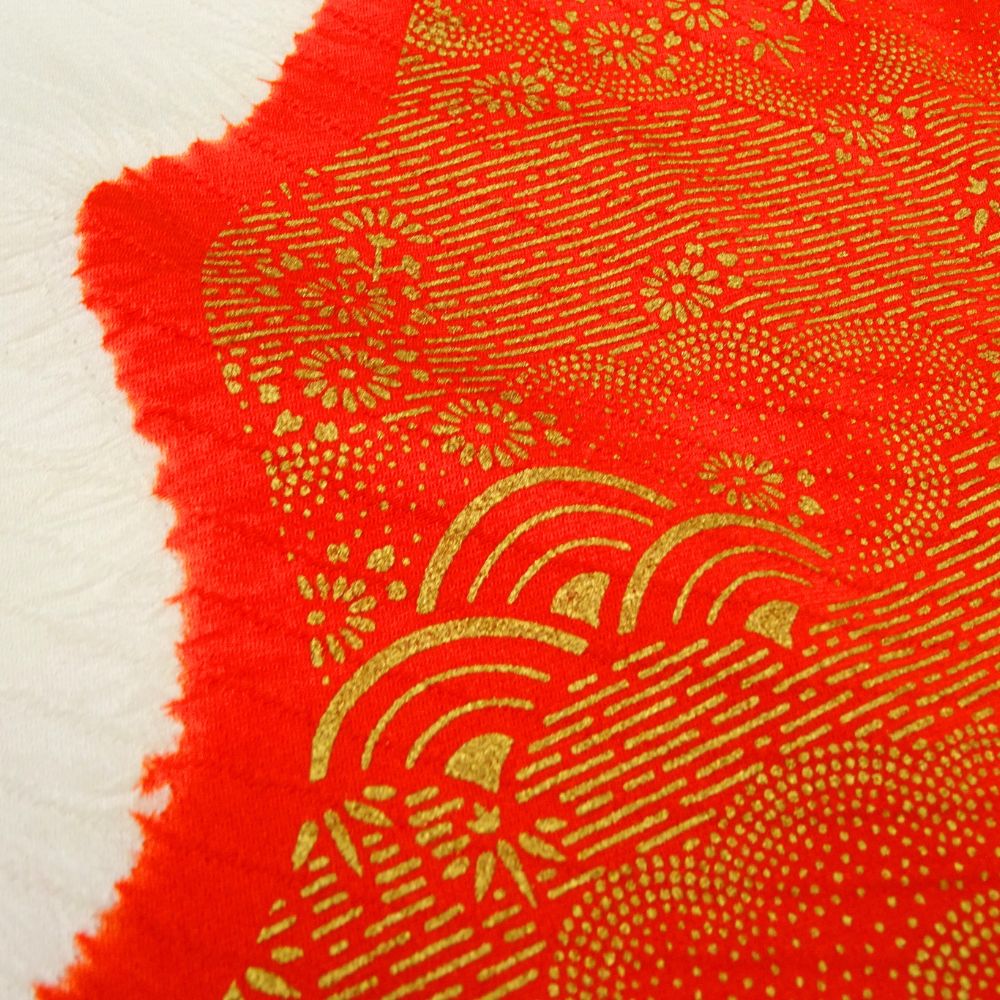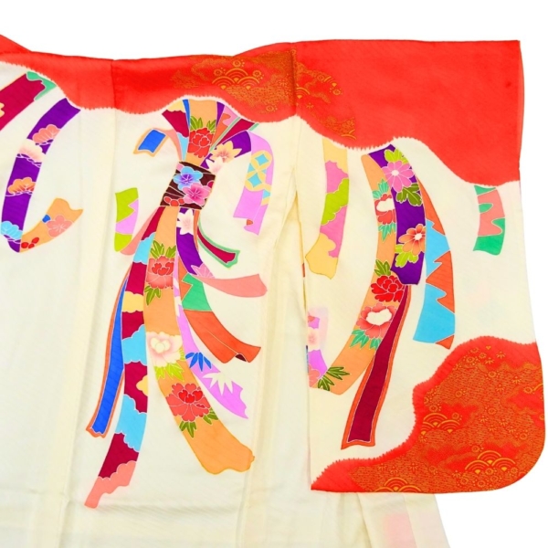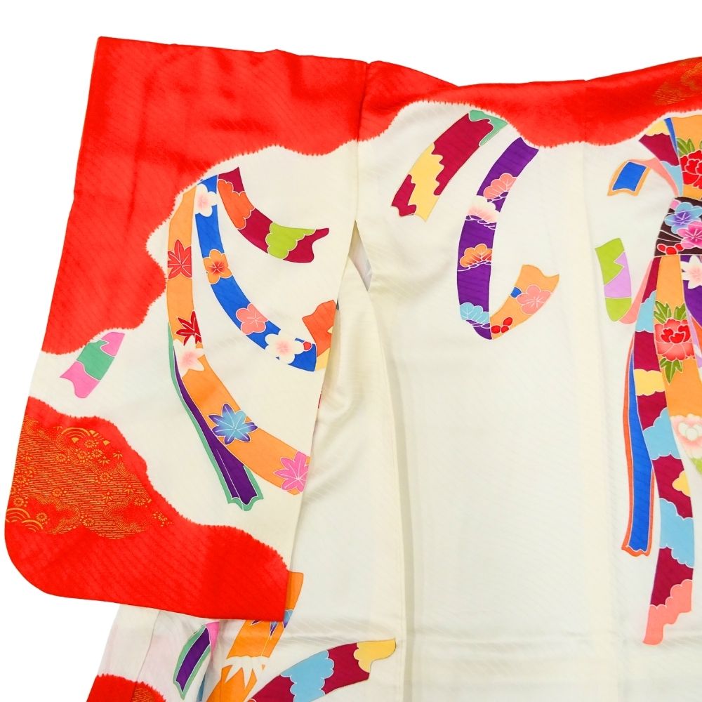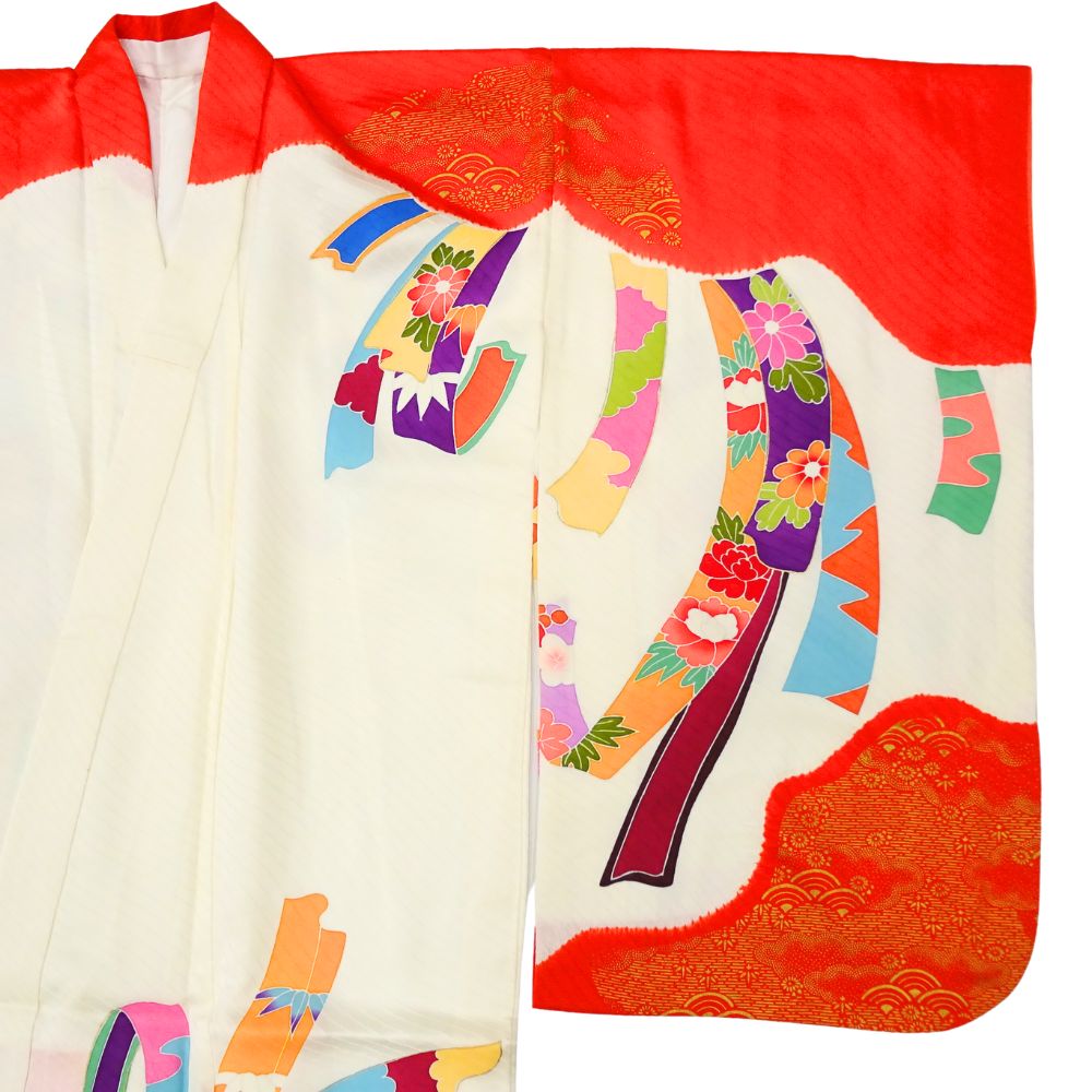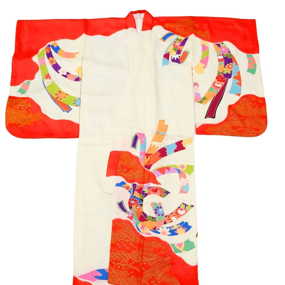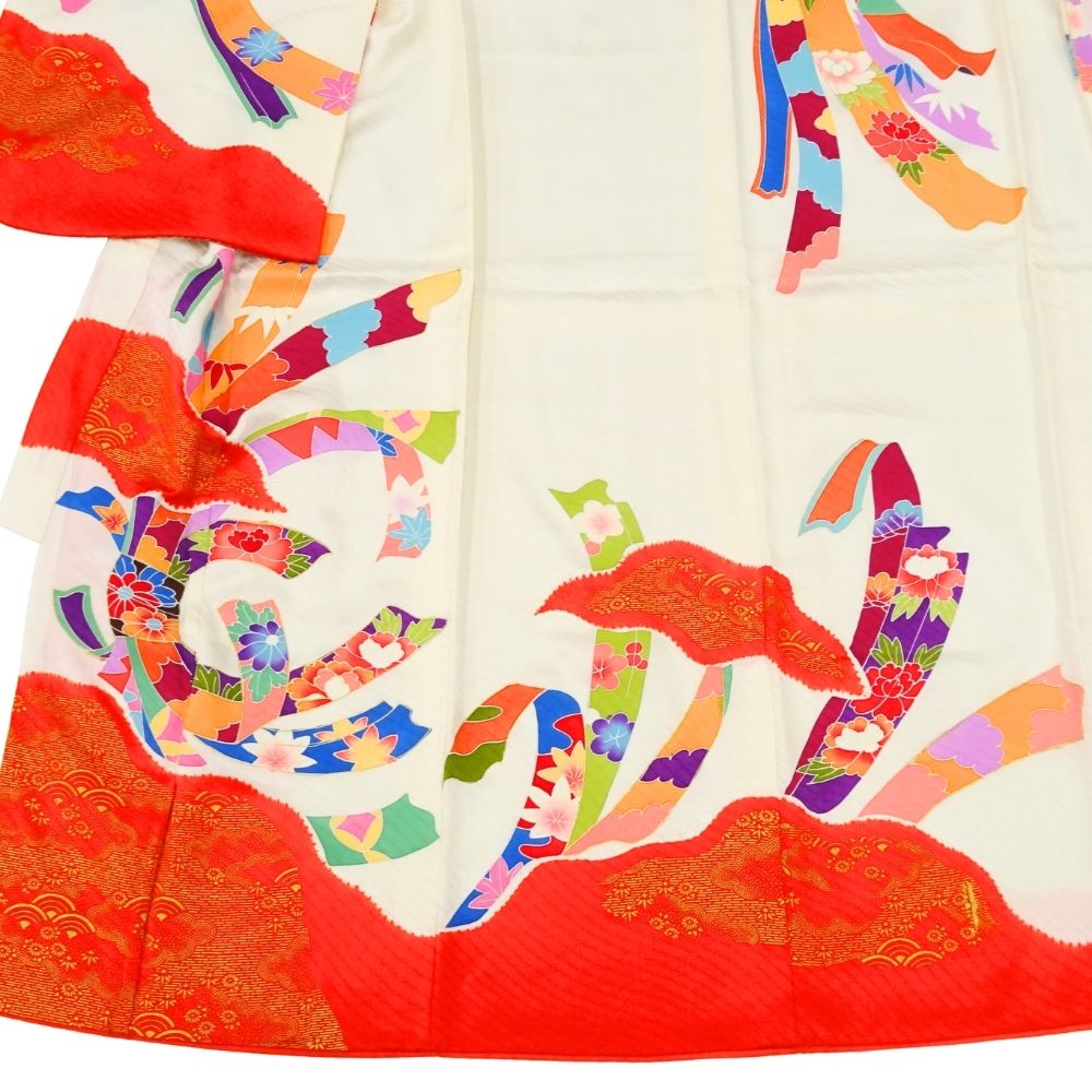 女児 祝着 四つ身 手描き友禅 正絹 リユース 中古 白地×赤 熨斗目・花模様 8042-16 お宮参り 伝統古典柄