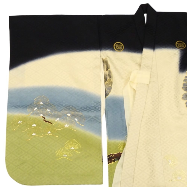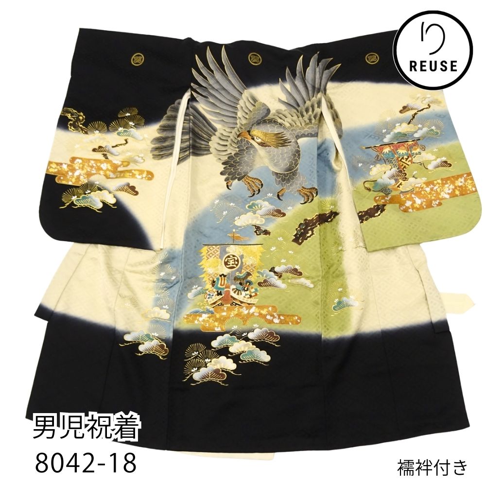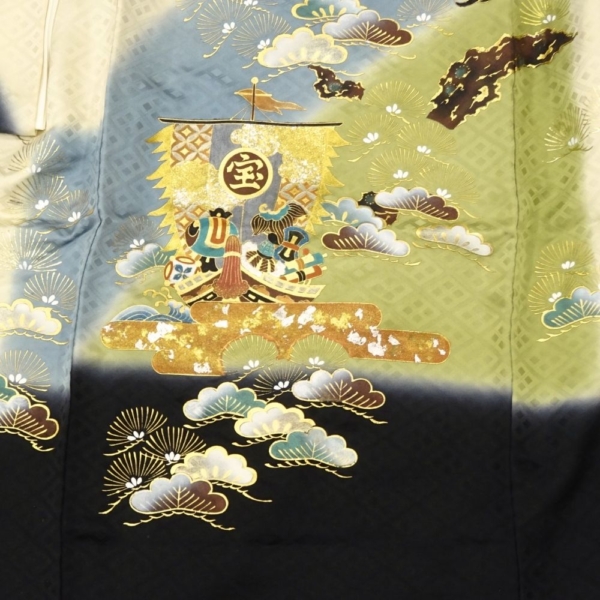 男児産着 正絹 リユース 中古 初着 鷹に宝船 金彩加工 黒・緑ぼかし地 8042-18 襦袢付き お祝い着 七五三・お宮参り