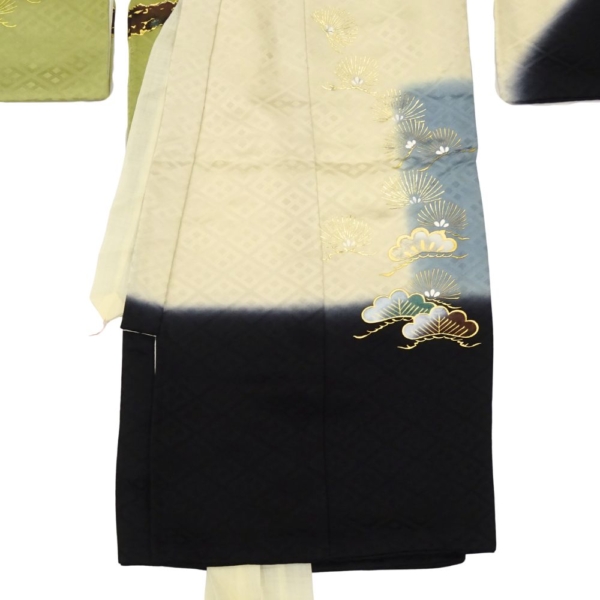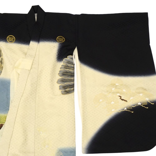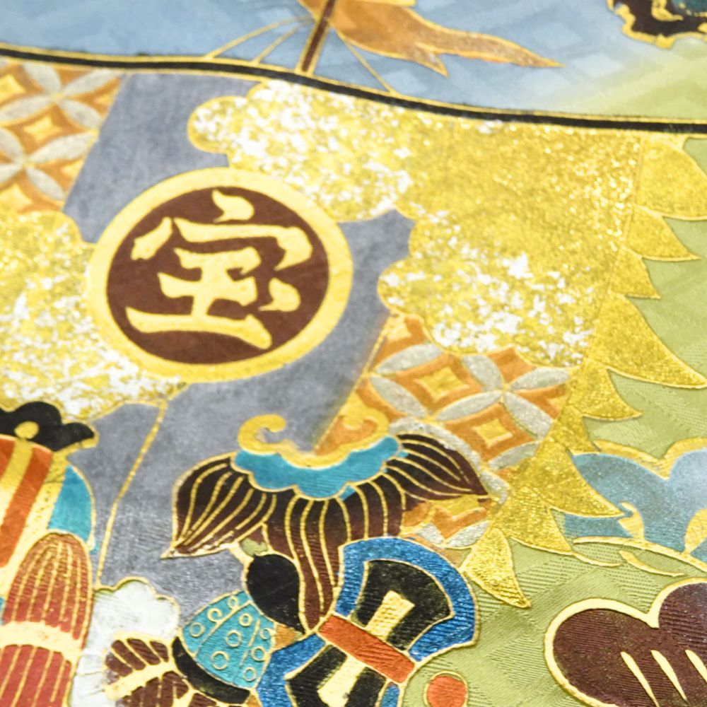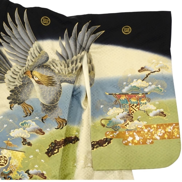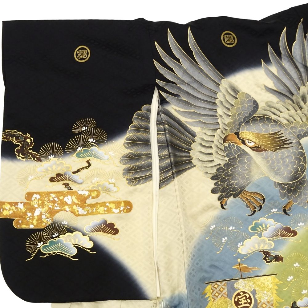 深みのある黒と上品な緑のぼかし地に、力強く羽ばたく「鷹」と、富と繁栄の象徴である「宝船」が豪華に描かれた、格式高い一枚です。