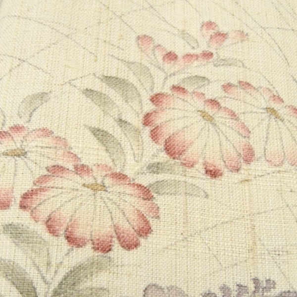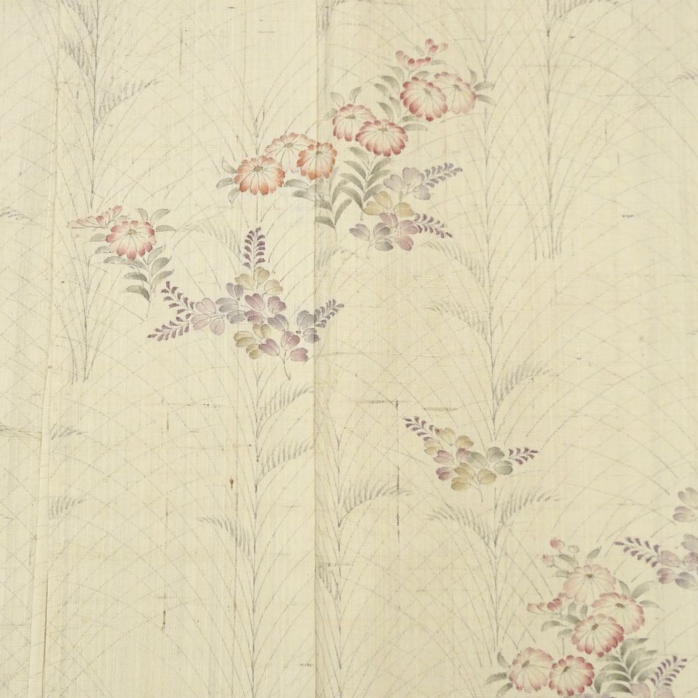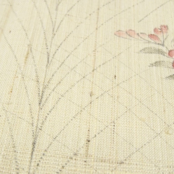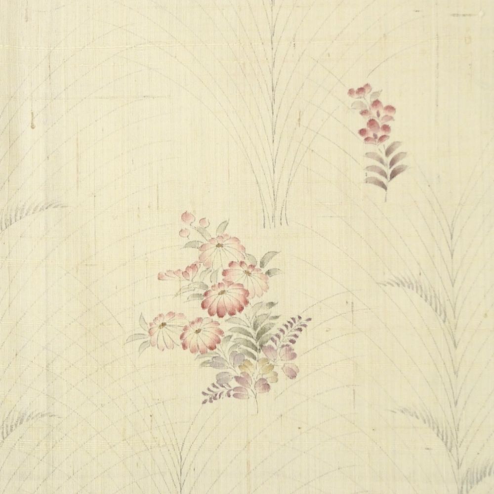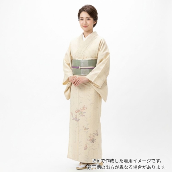 肌馴染みの良い生成り色の地に、四季を彩る枝花が繊細なタッチで描かれた正絹の小紋です。