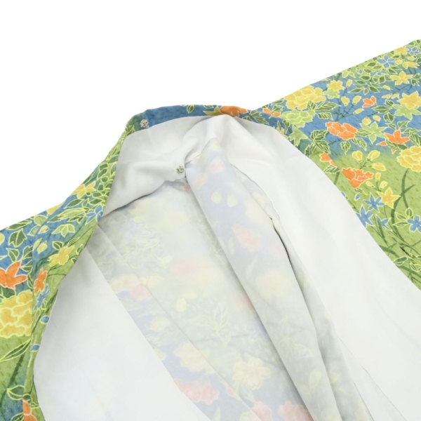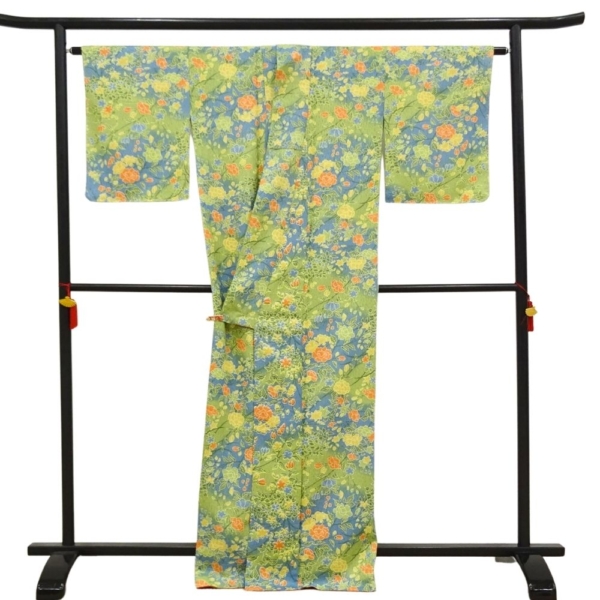 小紋 正絹 リユース 中古 袷 型染 黄緑 四季花文様 牡丹 菊 桜 8046-4 カジュアル 街歩き お稽古 仕立て上がり