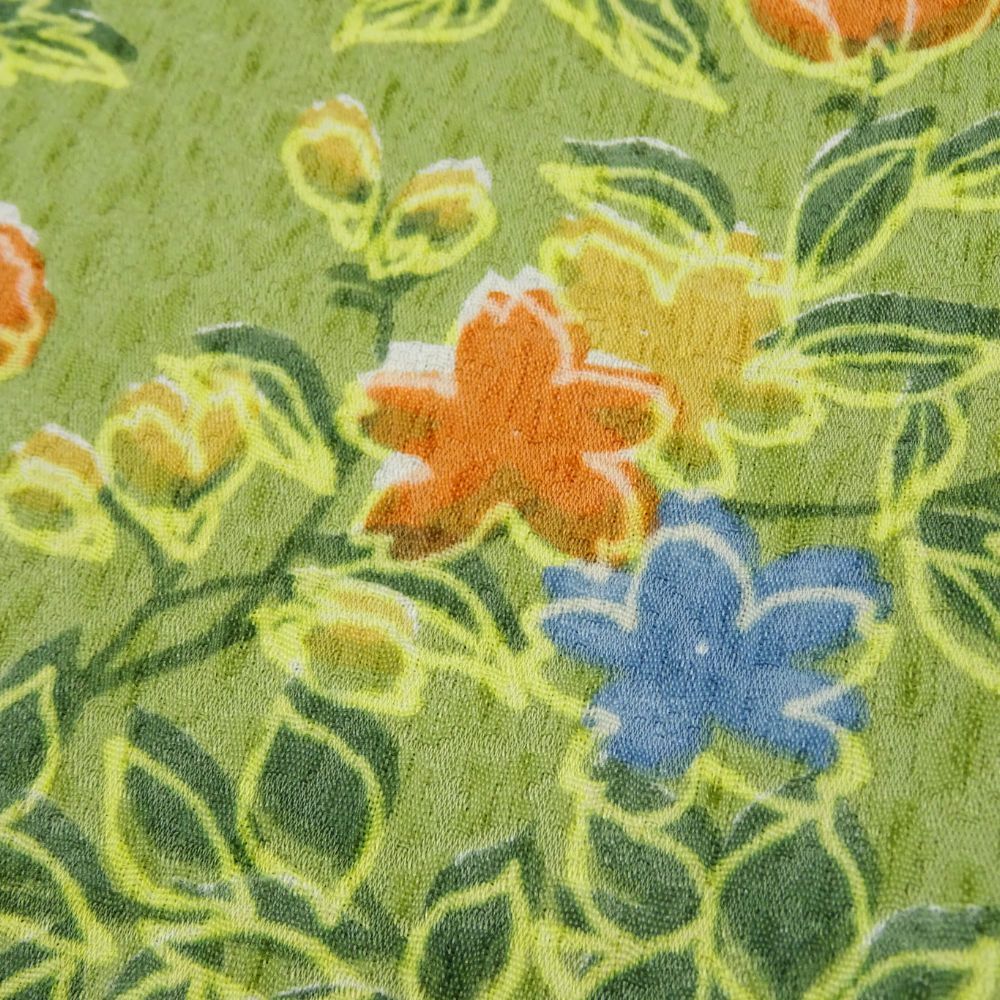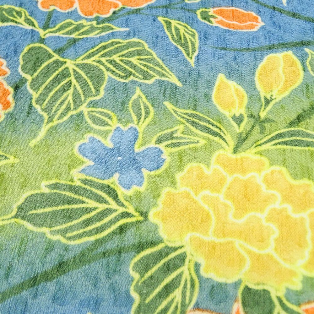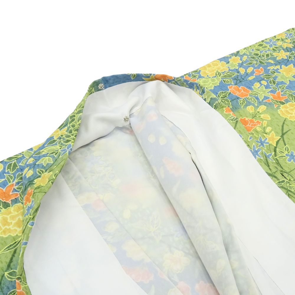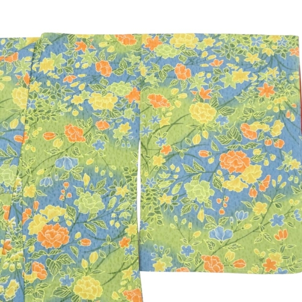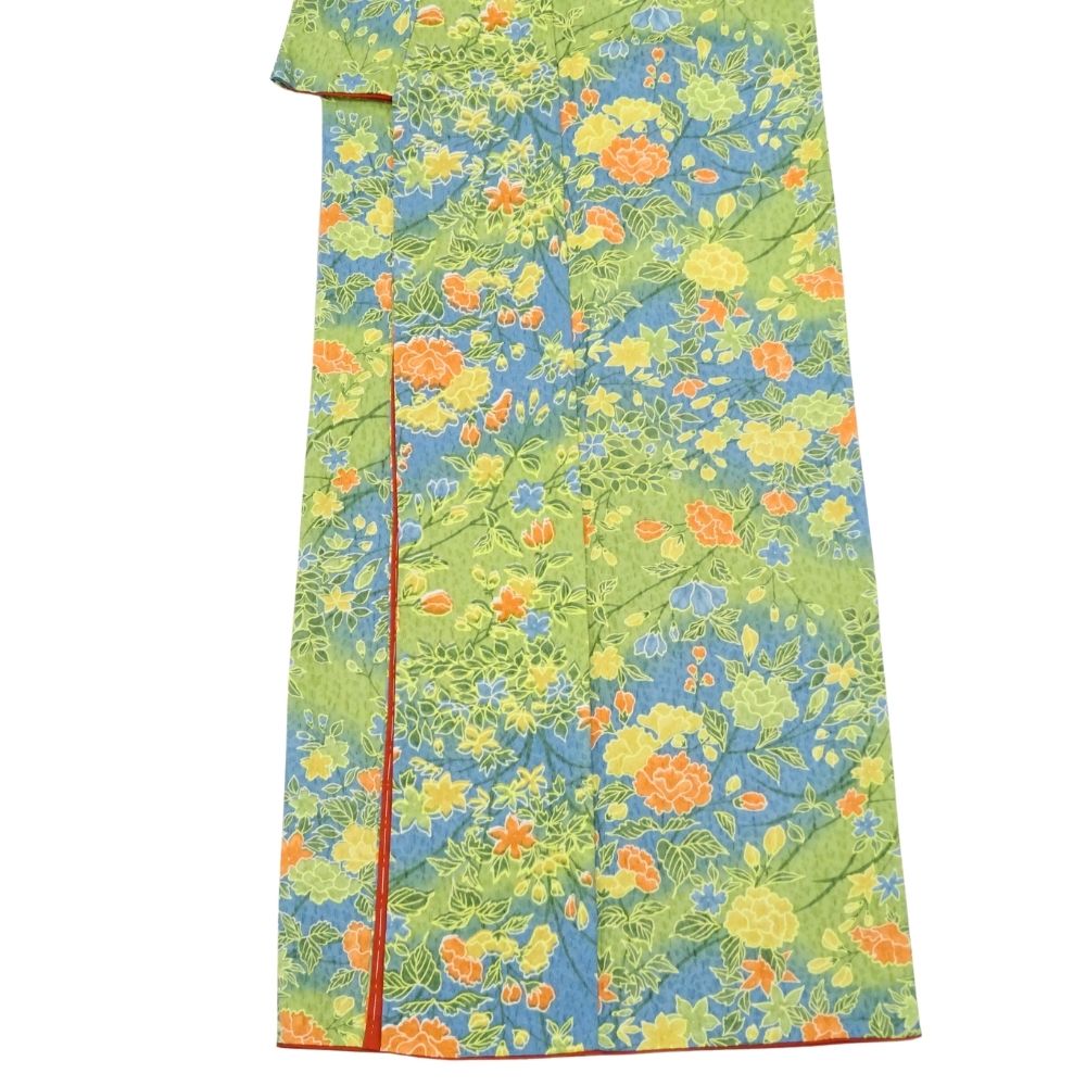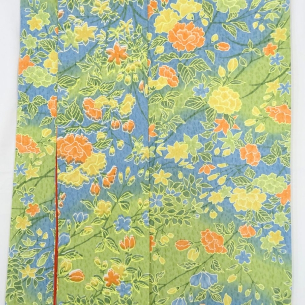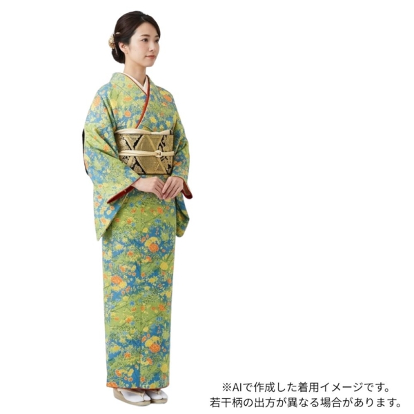 春の芽吹きを感じさせる黄緑色の地に、牡丹や菊、桜などの四季折々の花々が鮮やかに描かれた、大変華やかな小紋です。